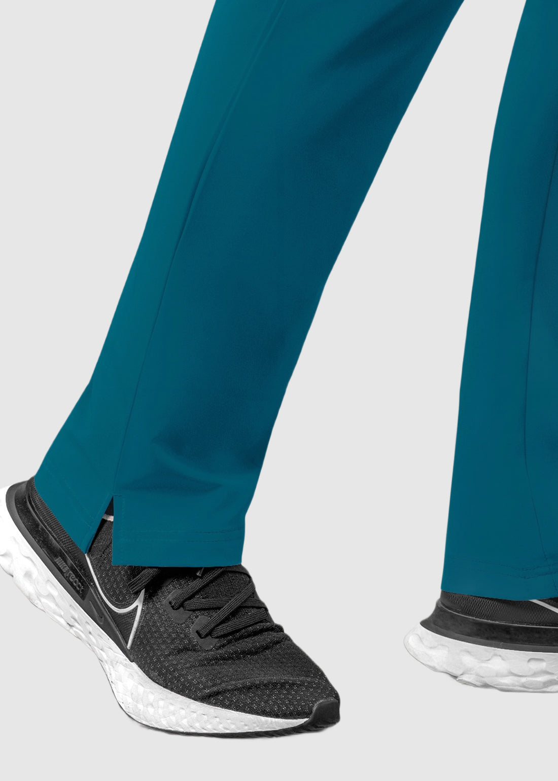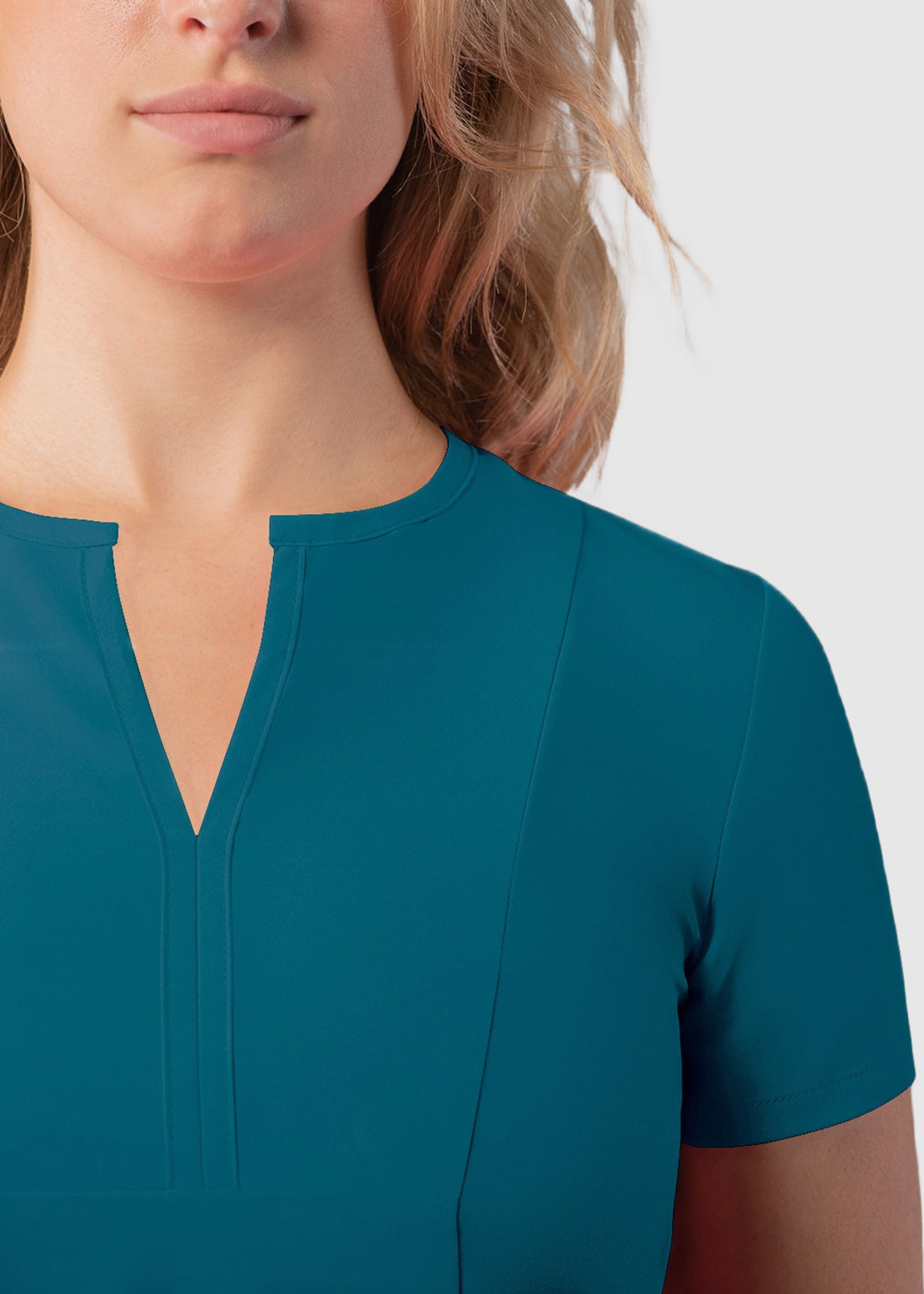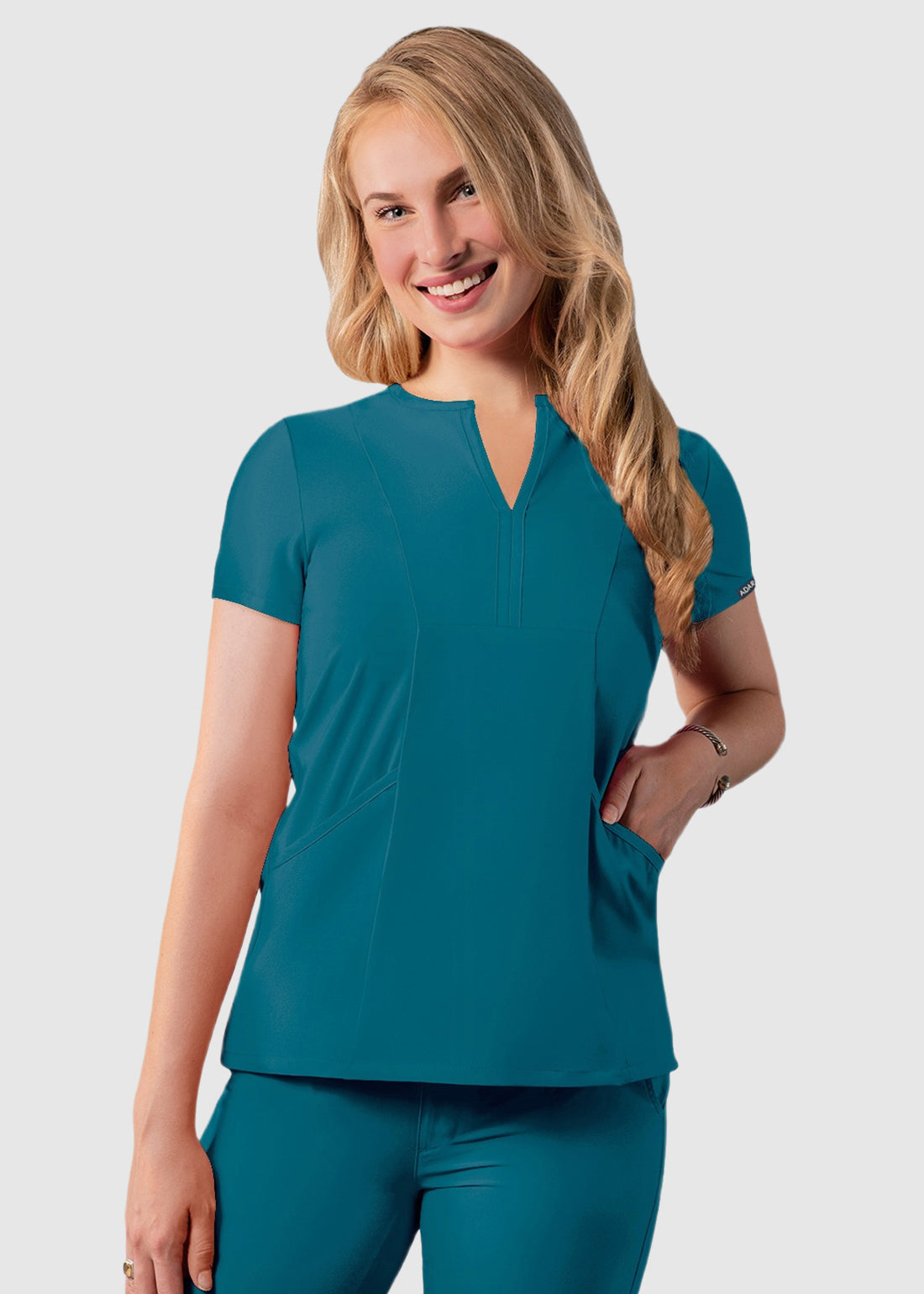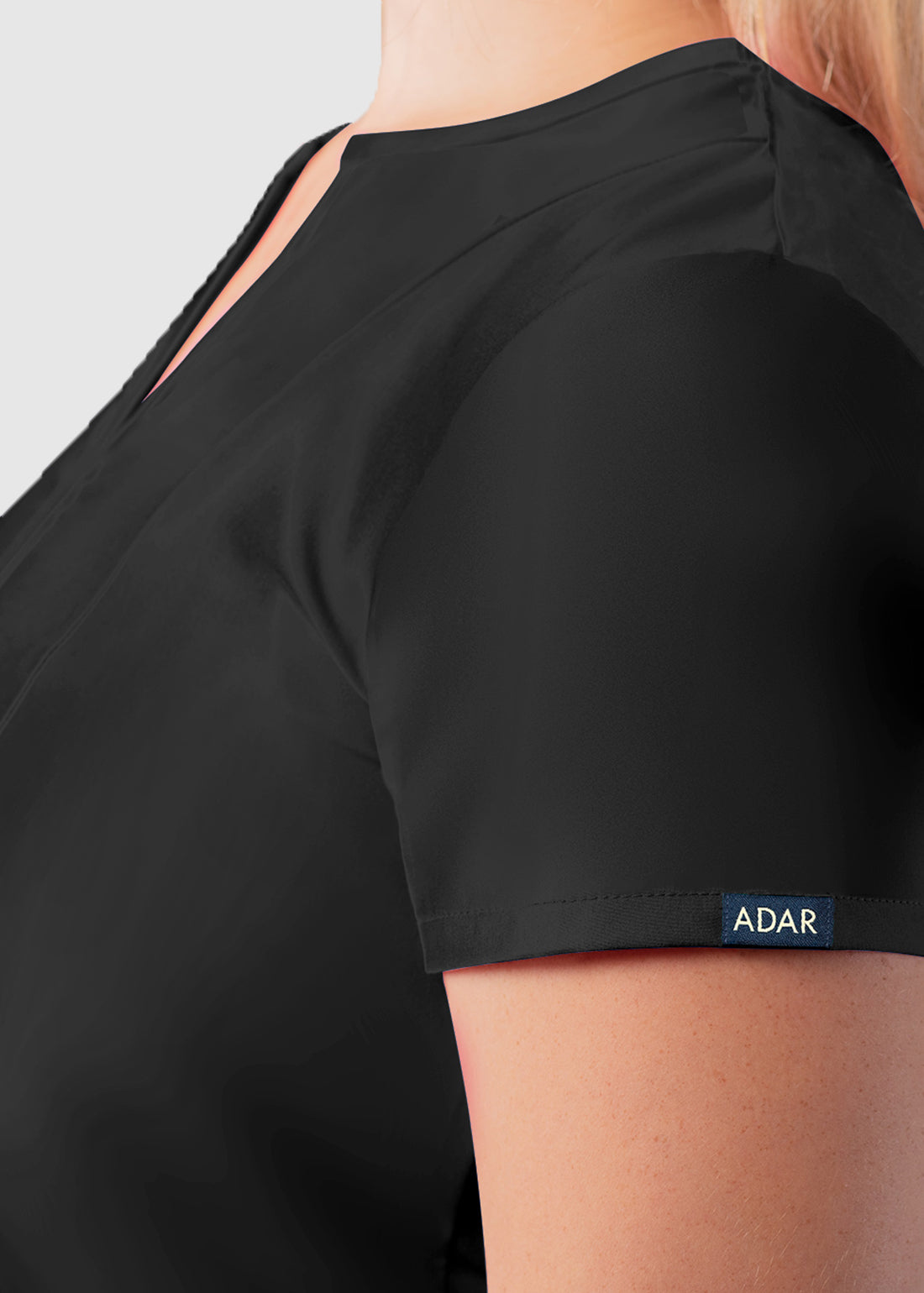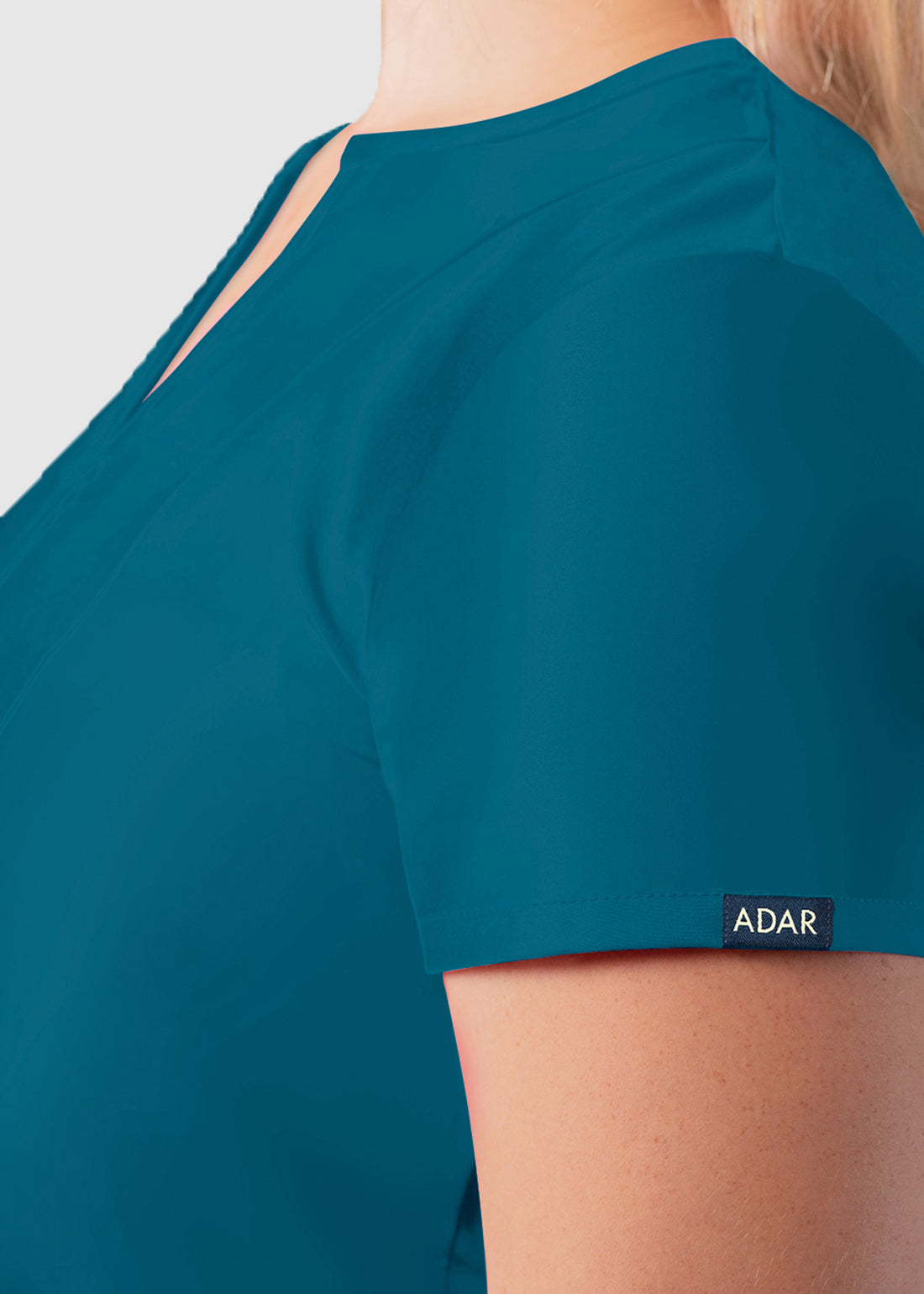 Dress immaculately in ADAR A9600 Addition Women's Go-Higher Scrub Set. The fashion-forward notched V-neck scrub top comes with a flattering princess seam, self-binding trim and notched neckline detail, back yoke and dart detail making it modern and figure-flattering, two large angled pockets with self-binding trim and a high/low hem for backside coverage, makes this top ideal for your everyday needs. With multi-stretch fabric and completed with side vents, the scrub top garners functionality. Paired contemporary fit, skinny leg, mid-rise cargo pant with natural waist, and featuring a total of eight pockets for maximum secured storage, the pants are a must have.