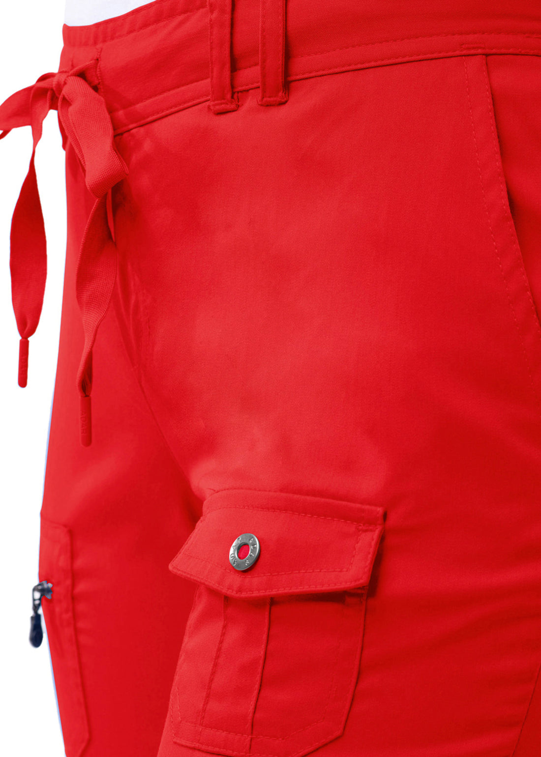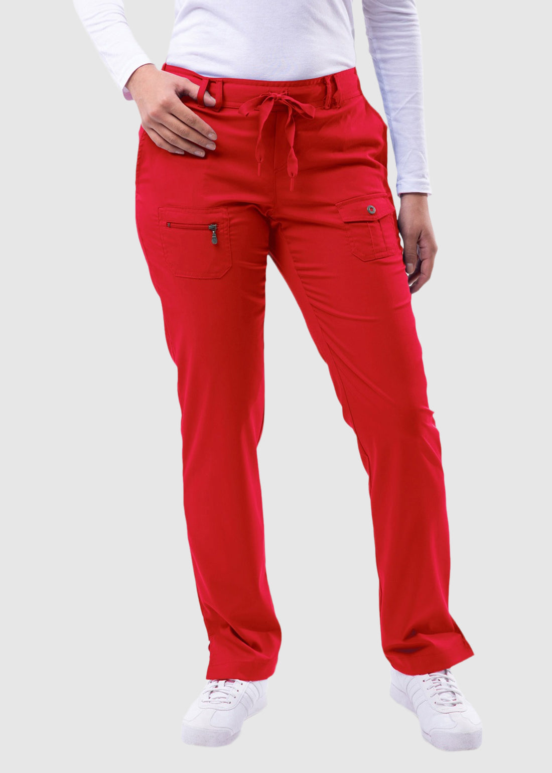 Style yourself comfortable in Pro by Adar Women's Slim Fit Utility Scrub Pant. The modern pants feature an adjustable waist and belt loops at waistline. The zippered side cargo pocket, two front slit pockets, additional snap cargo pocket, two back snap pockets and side vents at hem make it ideal for your work and lounging.