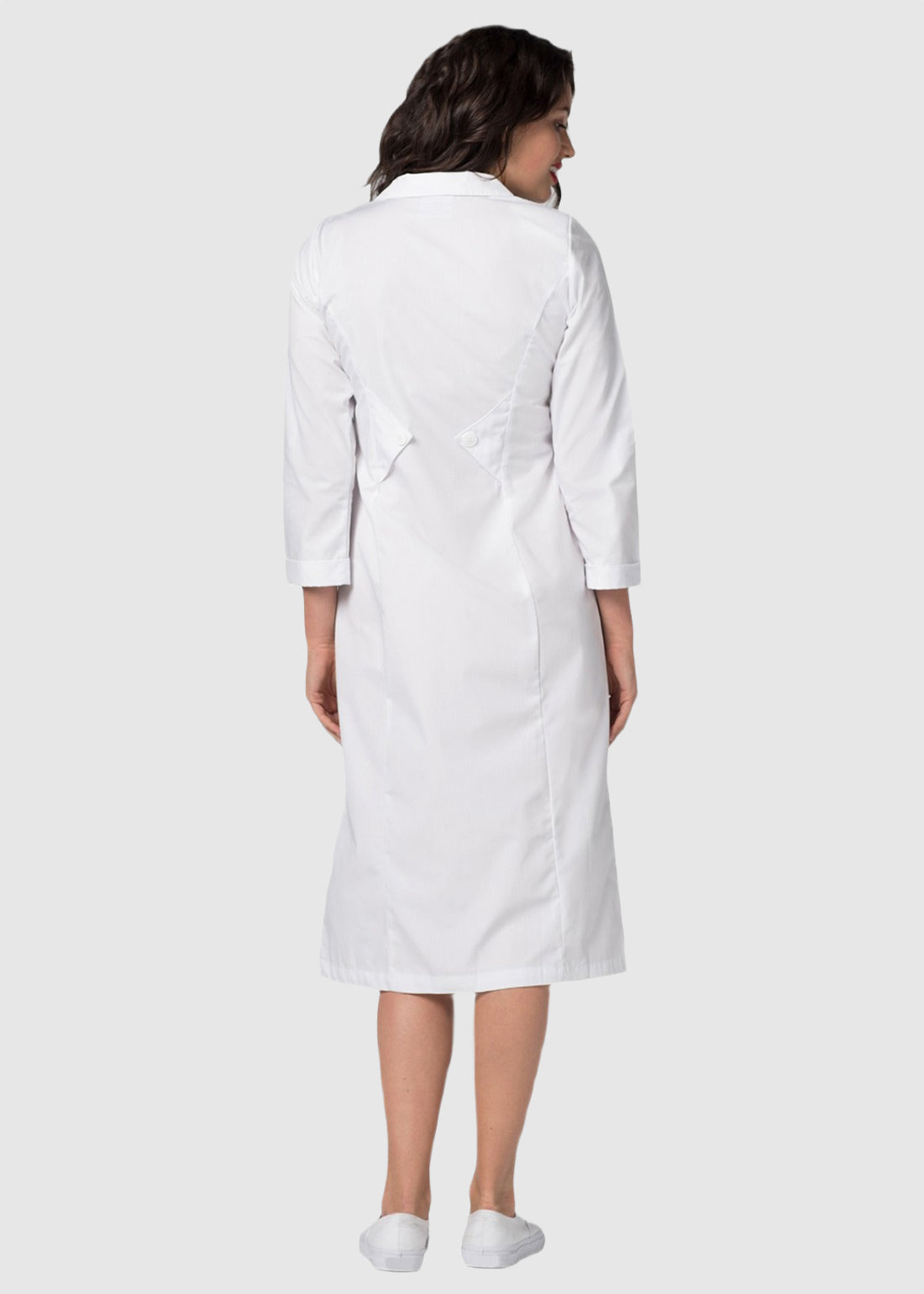 Button-front, long sleeves, single breasted dress is shaped by front and back princess seams. Its v-neckline features a lovely, face-framing double embroidered collar, with extra comfort shoulder pads. Pretty details include French cuffs on sleeves and triangular button tabs in the back. Inseam pockets. Center back length: 46 inches