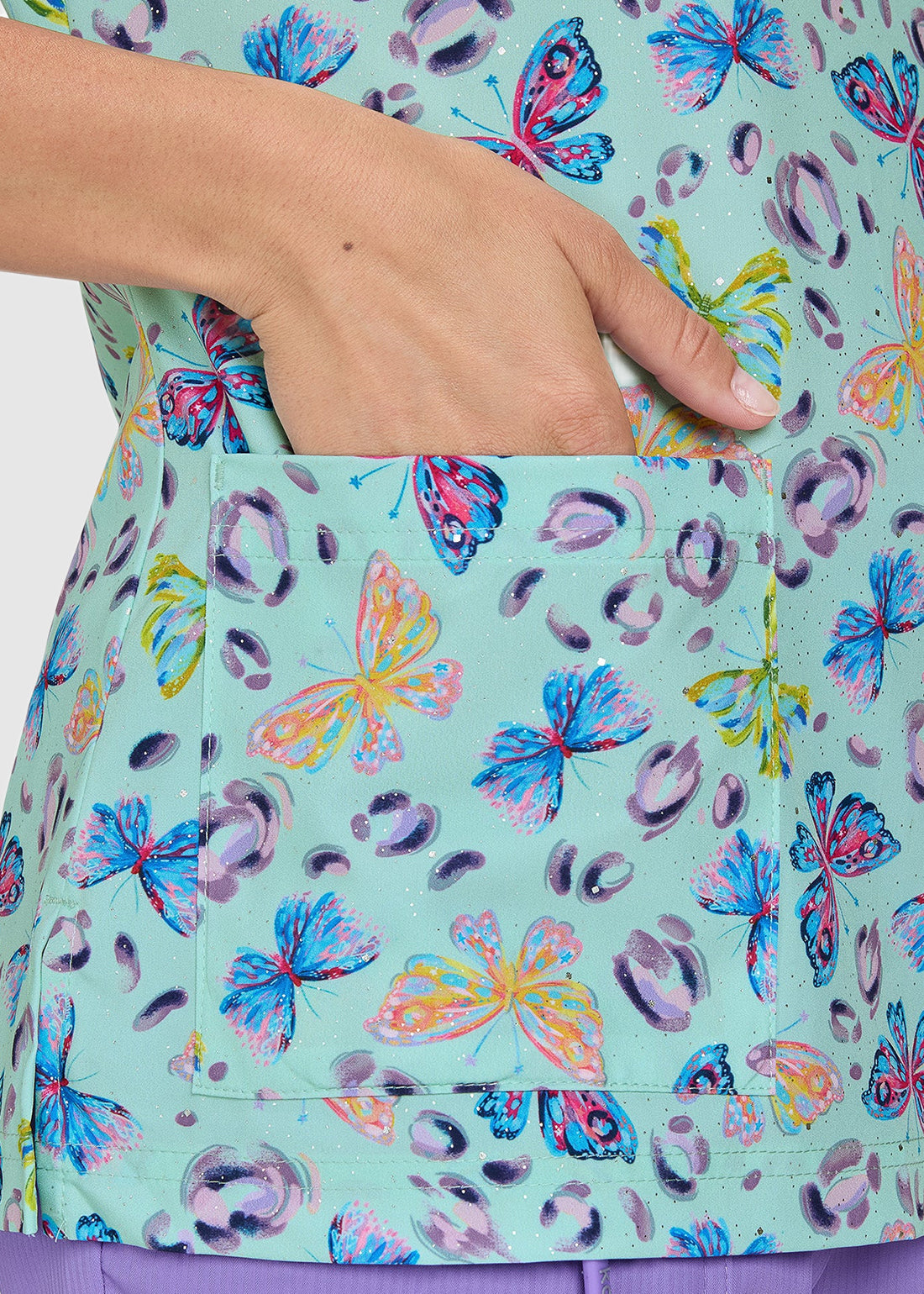 koi Artists Series Rosalie Fashionflies Women's 3-Pocket Print Scrub Top combines artistic flair with practical design. This limited-edition top features a classic v-neck, three pockets for ample storage, an ID badge loop, and side slits for enhanced mobility. it ensures comfort and flexibility throughout your day. Part of koi's collaborative Artists Series, this scrub top adds a unique touch to your professional wardrobe.