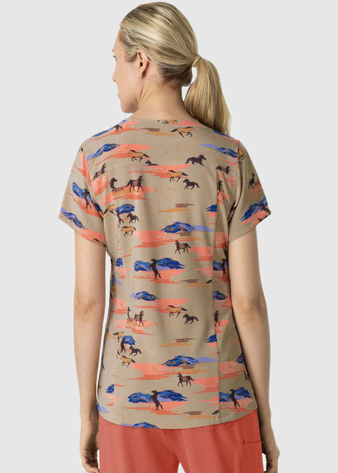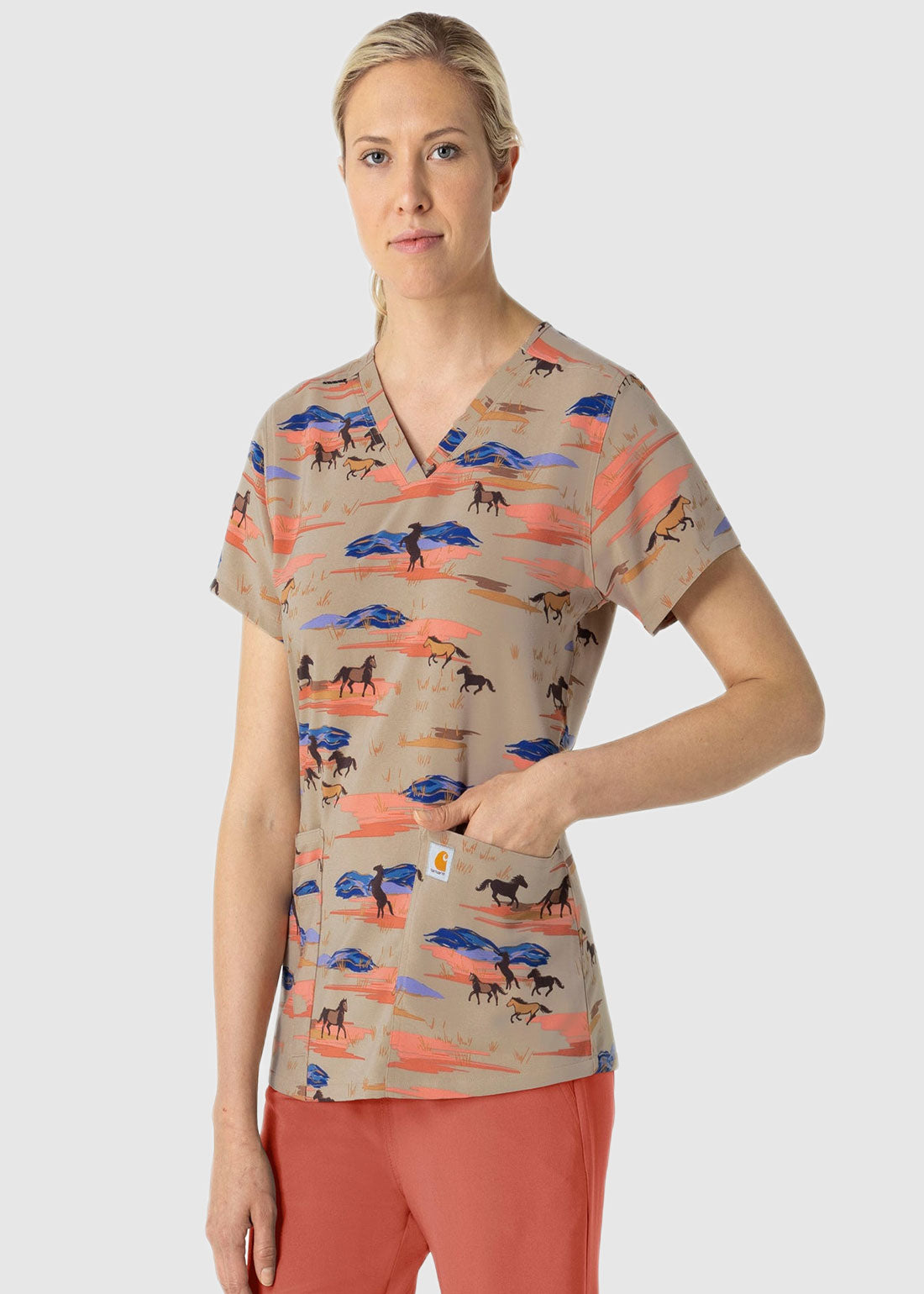 Wink Scrubs Carhartt Women's V-Neck Print Scrub Top in Mustang Meadow combines style and function with its flattering V-neck design and vibrant print. Featuring two large front patch pockets, this lightweight top offers both durability and comfort, making it perfect for long shifts.