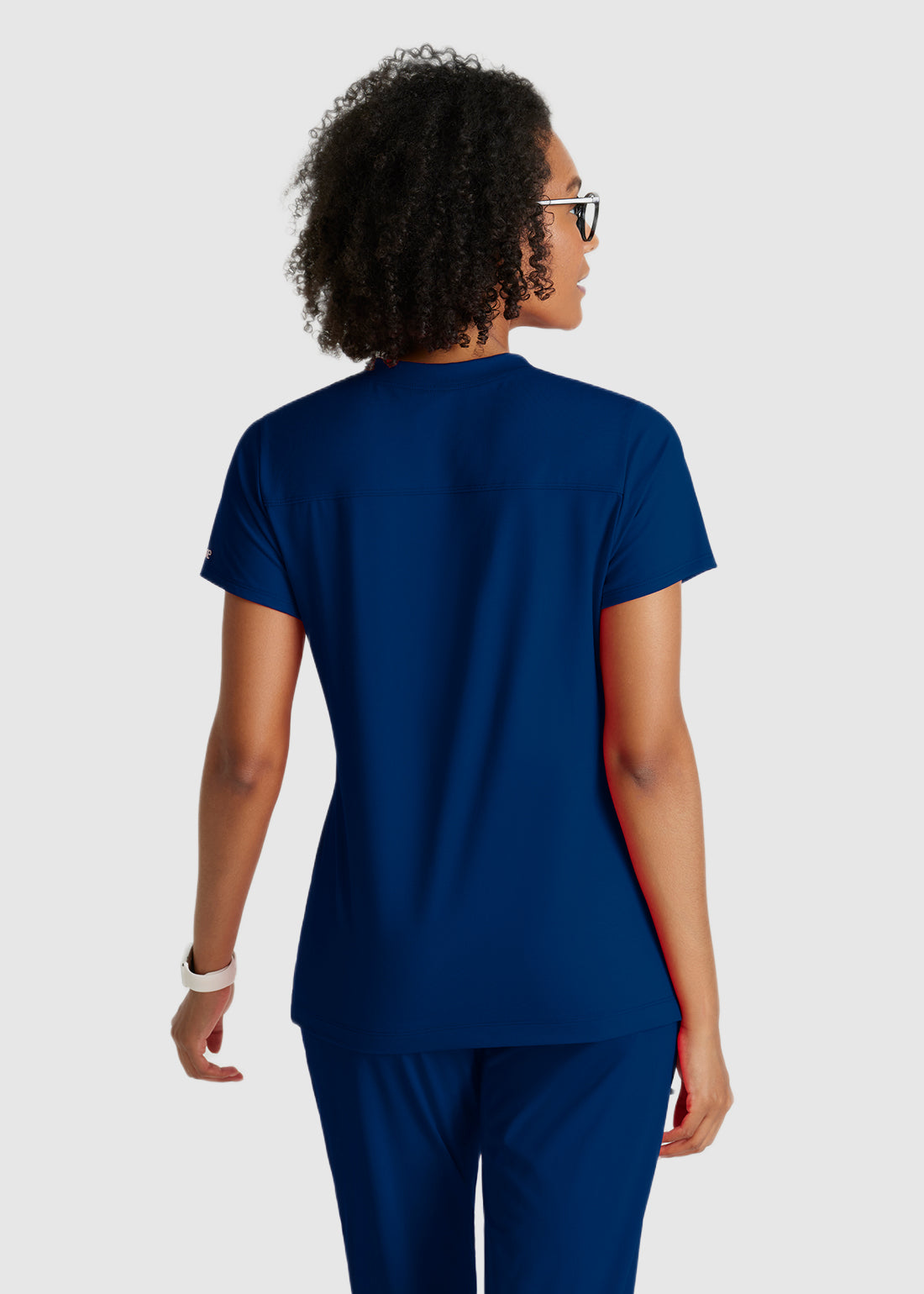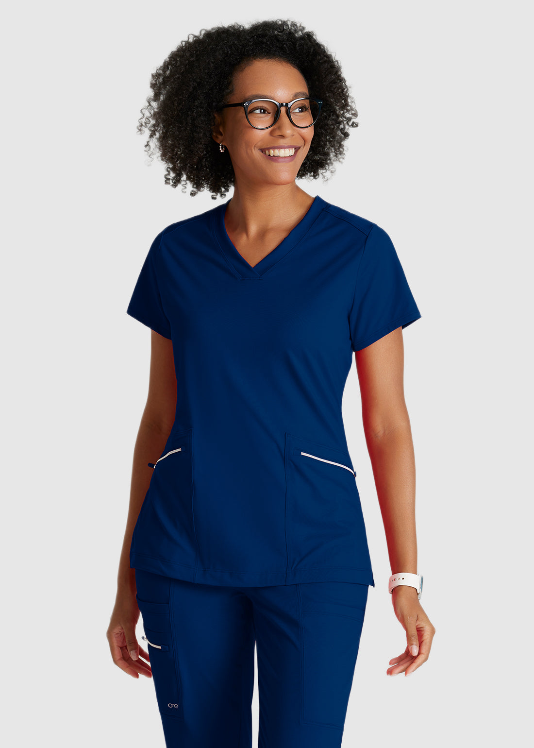 Look exceptional and feel great in Barco One Performance Knit Victory 2-Pocket V-Neck Scrub Top. With a banded overlap V-neck that looks impressive, straight hem that adds to your style quotient, back yoke seam for added comfort ensures functionality. Completed with two pockets, the scrub top is great value for money.