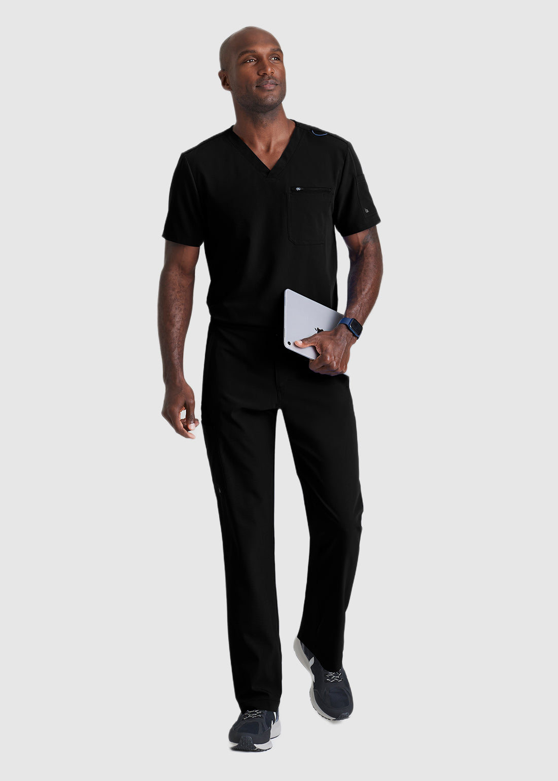 Durable and sturdy, the Barco Unify Men's V-Neck Scrub Top comes with a banded v-neckline featuring short sleeves, zip chest pocket and patch pocket with pen slots, sleeve pocket, shoulder badge loop, straight hem and side vents for your day to day needs.