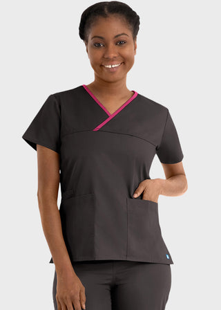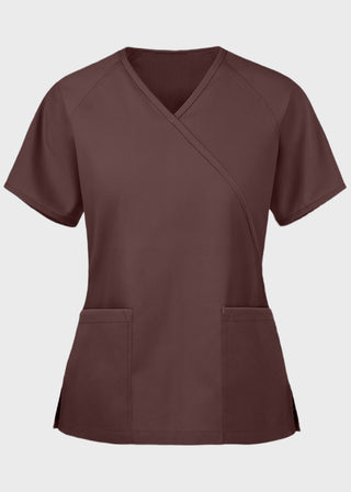 • Mock wrap scrub tops in regular and junior fits