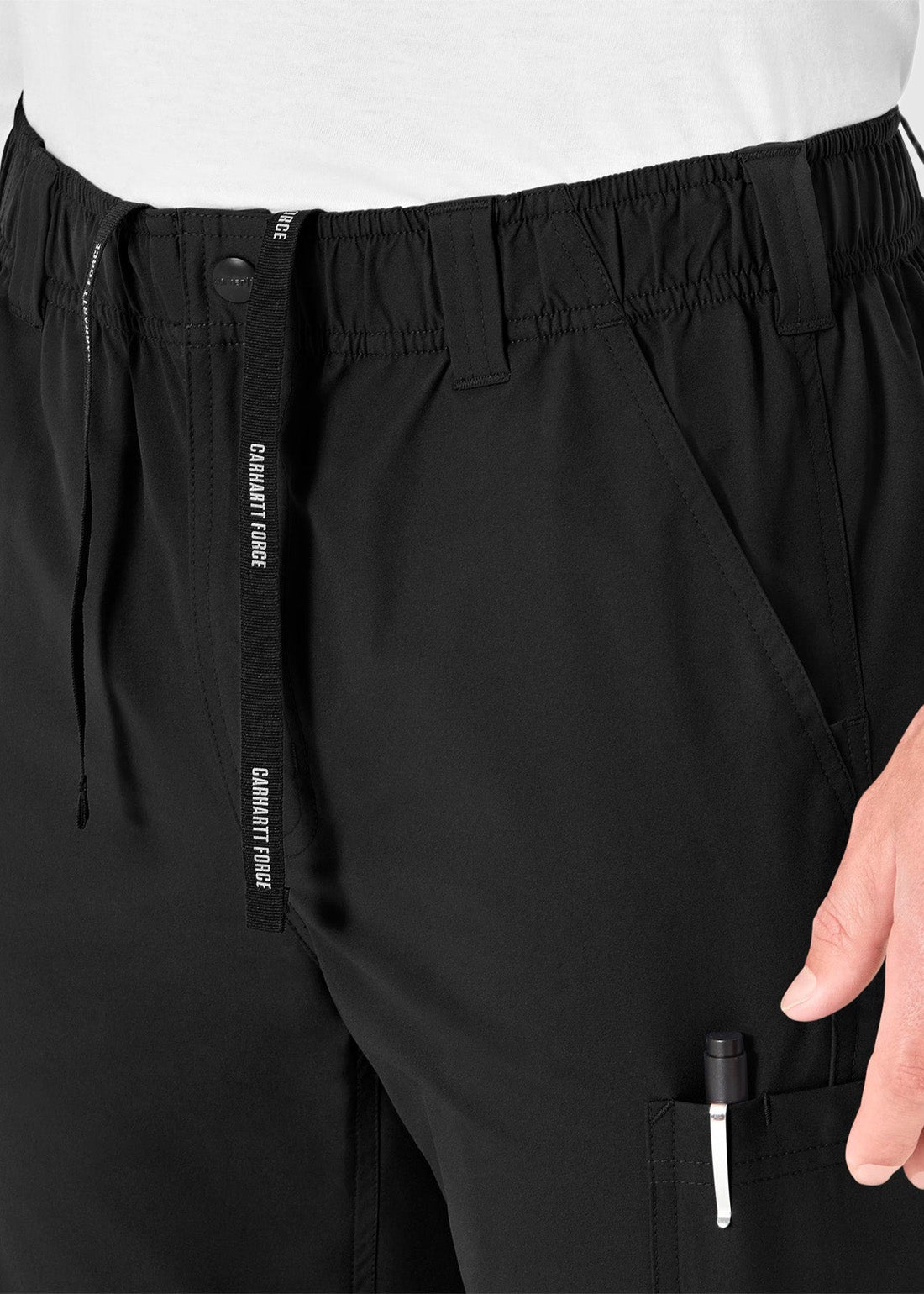 Be smart and feel great in Core by Carhartt Men's Straight Leg Scrub Short Pant. With a full elastic waistband with internal drawstring and Carhartt Force branded drawstring for comfort, functional zipper fly and snap button closure, get enhanced performance. With two front slash pockets, one triple cargo pocket with top accessory pocket and pen tack at wearer's right, one cargo pocket at wearer's left, and two back pockets, you get safe and secure storage.