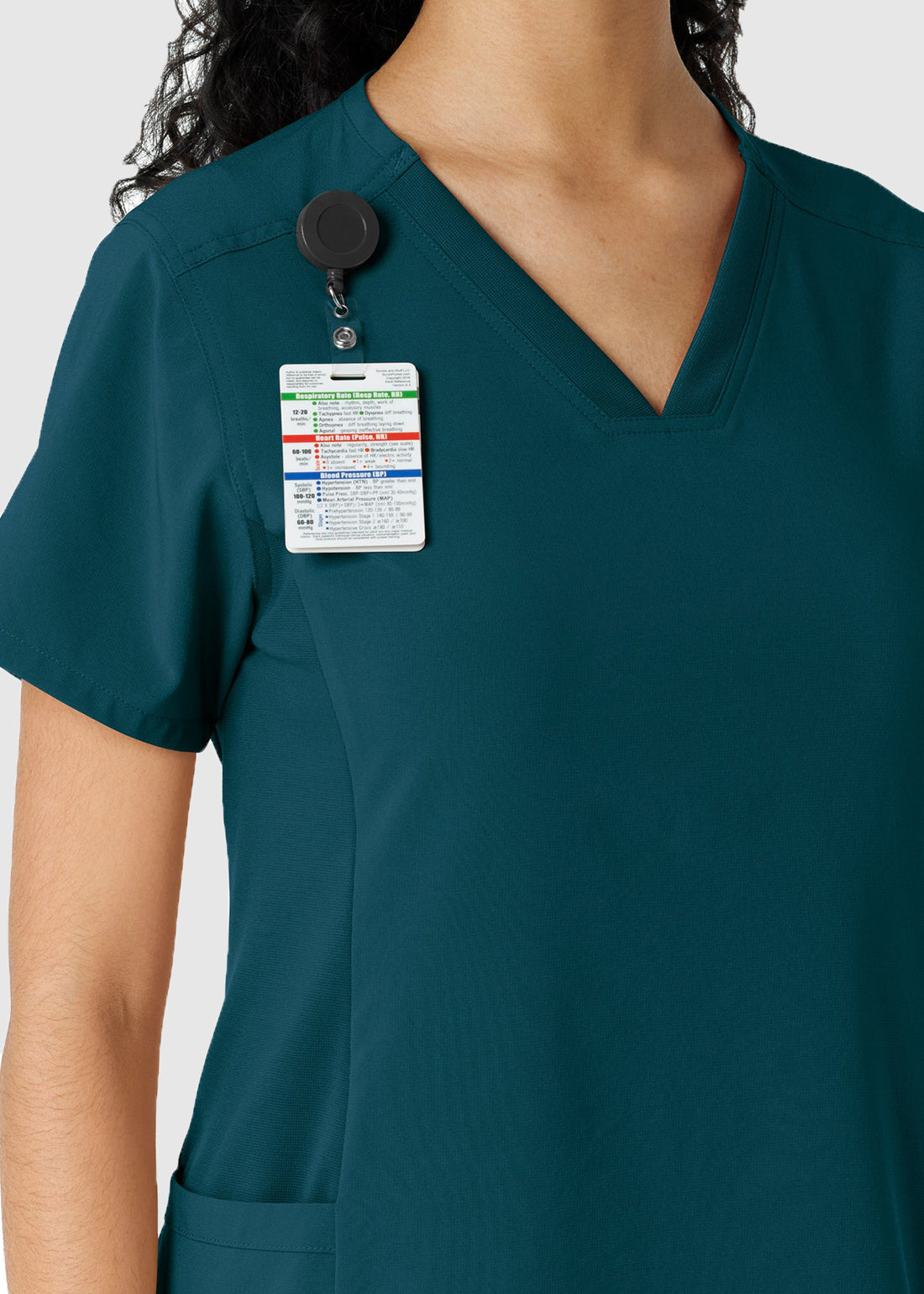 Carhartt Force Cross-Flex Women's Knit Panel Scrub Top offers a modern fit with a comfortable and functional design. Featuring a V-neck, two top-loading side pockets, a zip pocket on the left hip, and a shoulder badge loop, it provides ample storage. Knit side panels ensure flexibility and all-day comfort.