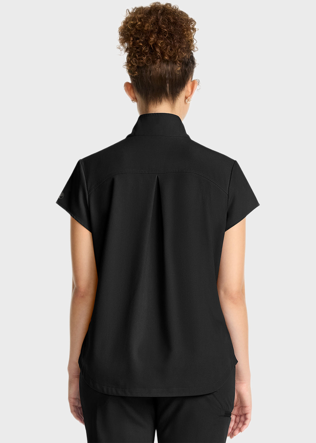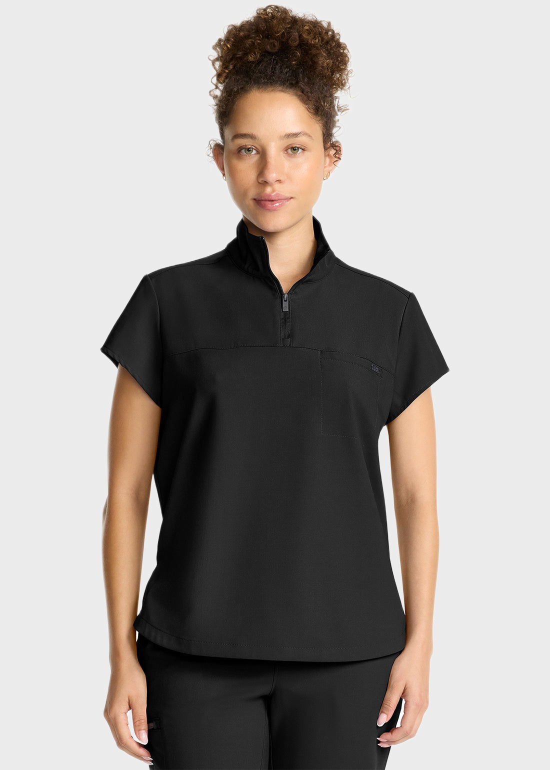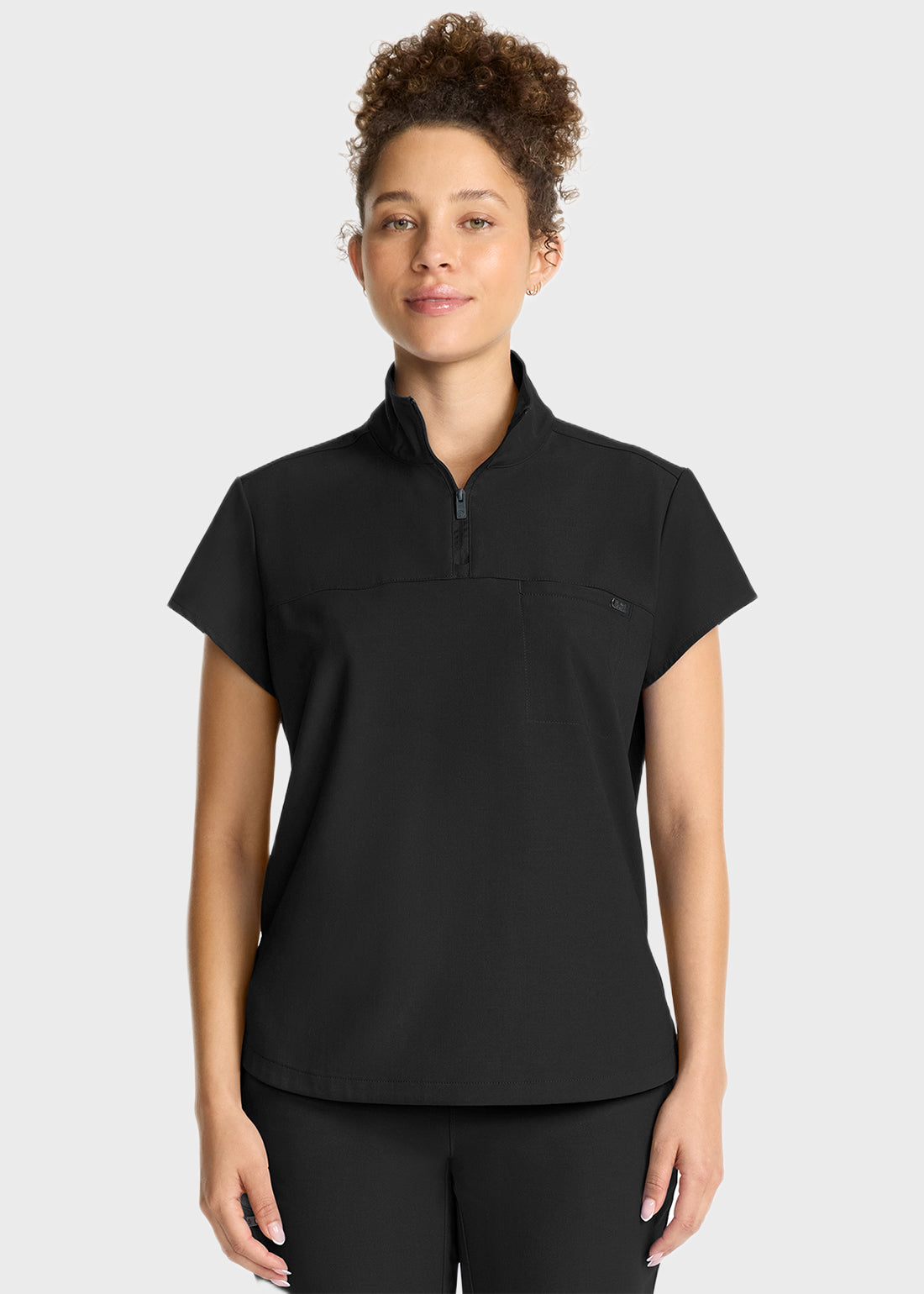 Healing Hands HH QUEST Women's Partial Zip Stand Collar Top This modern top combines style and function with a partial zip front and stand collar design. It features a convenient chest pocket, shirttail hem, and side vents for added comfort and mobility.