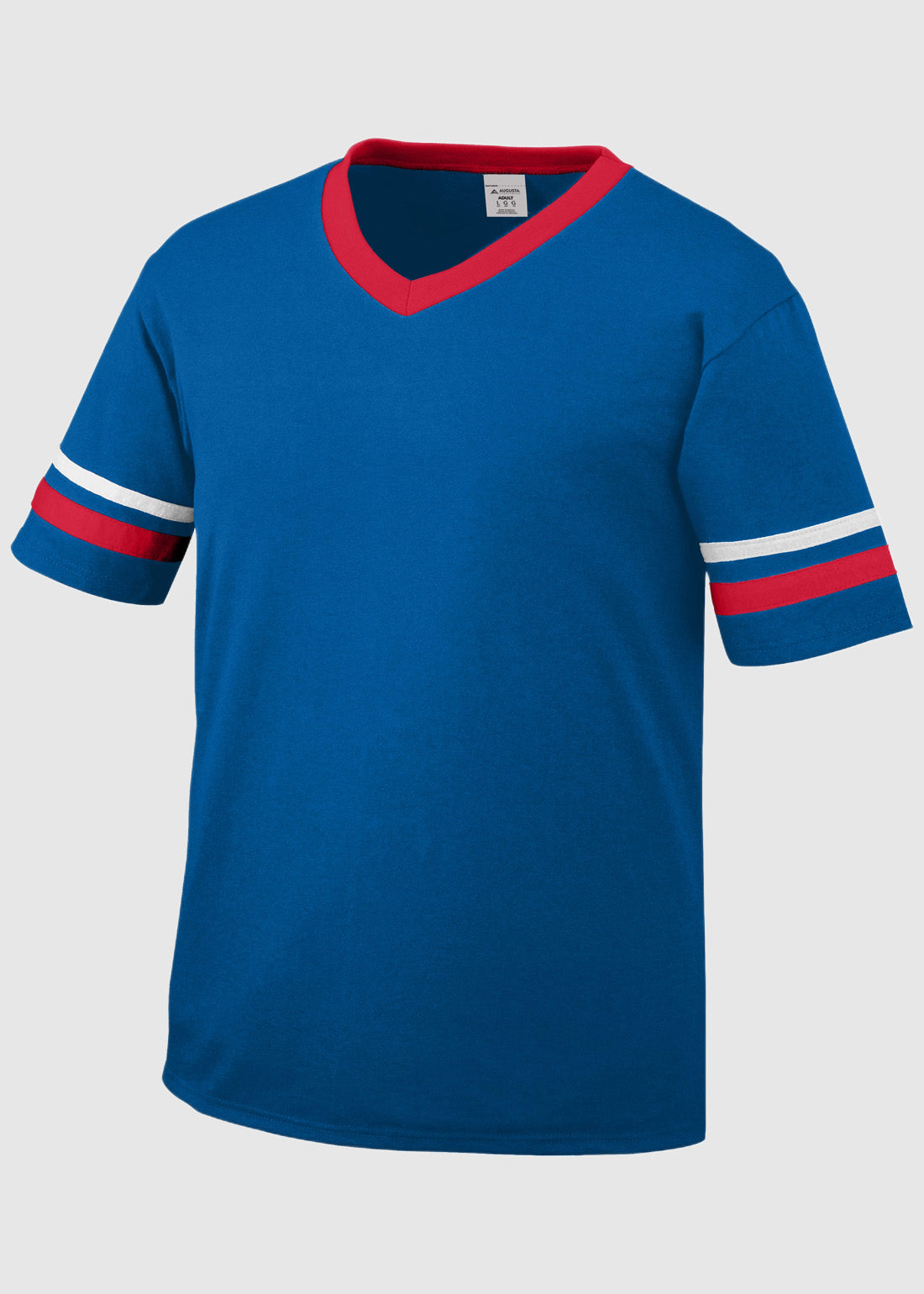 Look trendy and feel great in Augusta Sportswear Sleeve Stripe Jersey. With a contrast color V-neck collar and set-in sleeves with contrast color sleeve stripes, the jersey is a must have.