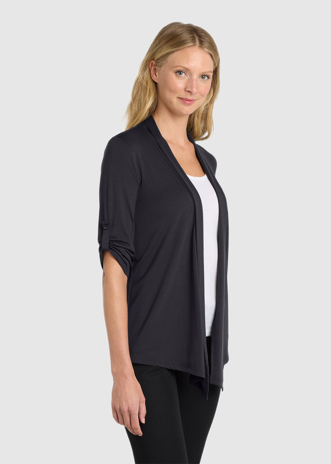 Look feminine and feel great in Port Authority Ladies Concept Shrug. With button tab on sleeves, shawl collar and sloping front hem, you are meant to make an impression.