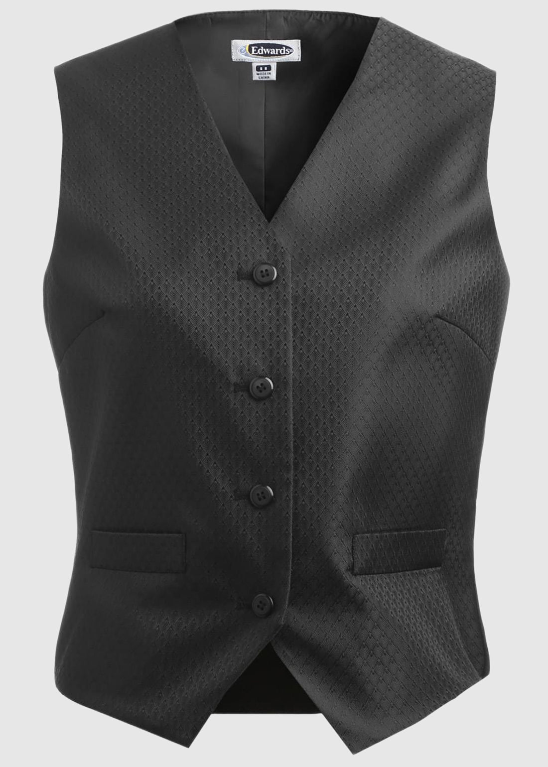 Dress up and feel great in Edward Diamond Brocade Vest. Tailored for the hospitality sector, the V-neck vest with diamond brocade pattern looks impressive. With black buttons on placket, two non-functional welt pockets and two inside lining pockets ensures functionality and comfort on the go.