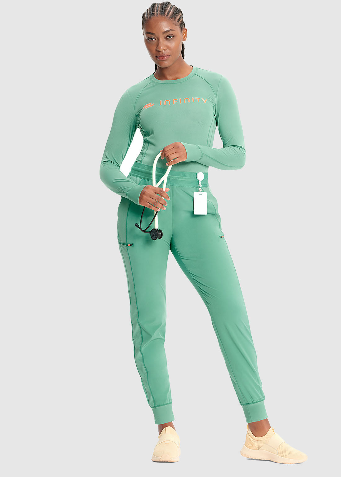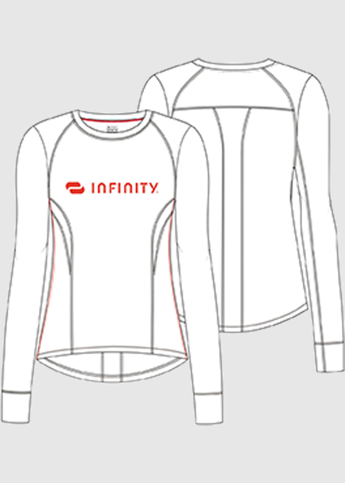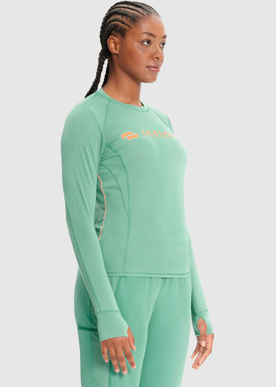 Layer up comfortably in Infinity GNR8 Long Sleeve Logo Performance Underscrub. The relaxed tee features a round neck, long sleeves with thumbholes on the cuffs and a screen printed logo on the center front. Enhanced with stylized front and back seams with coverstitching throughout, contrast stitching on side seams ensures added detailing. Completed with a rounded high-low hem, the underscrub is great value for money.