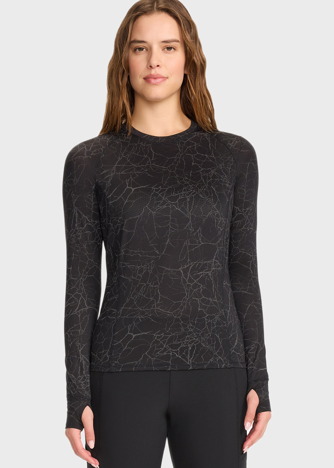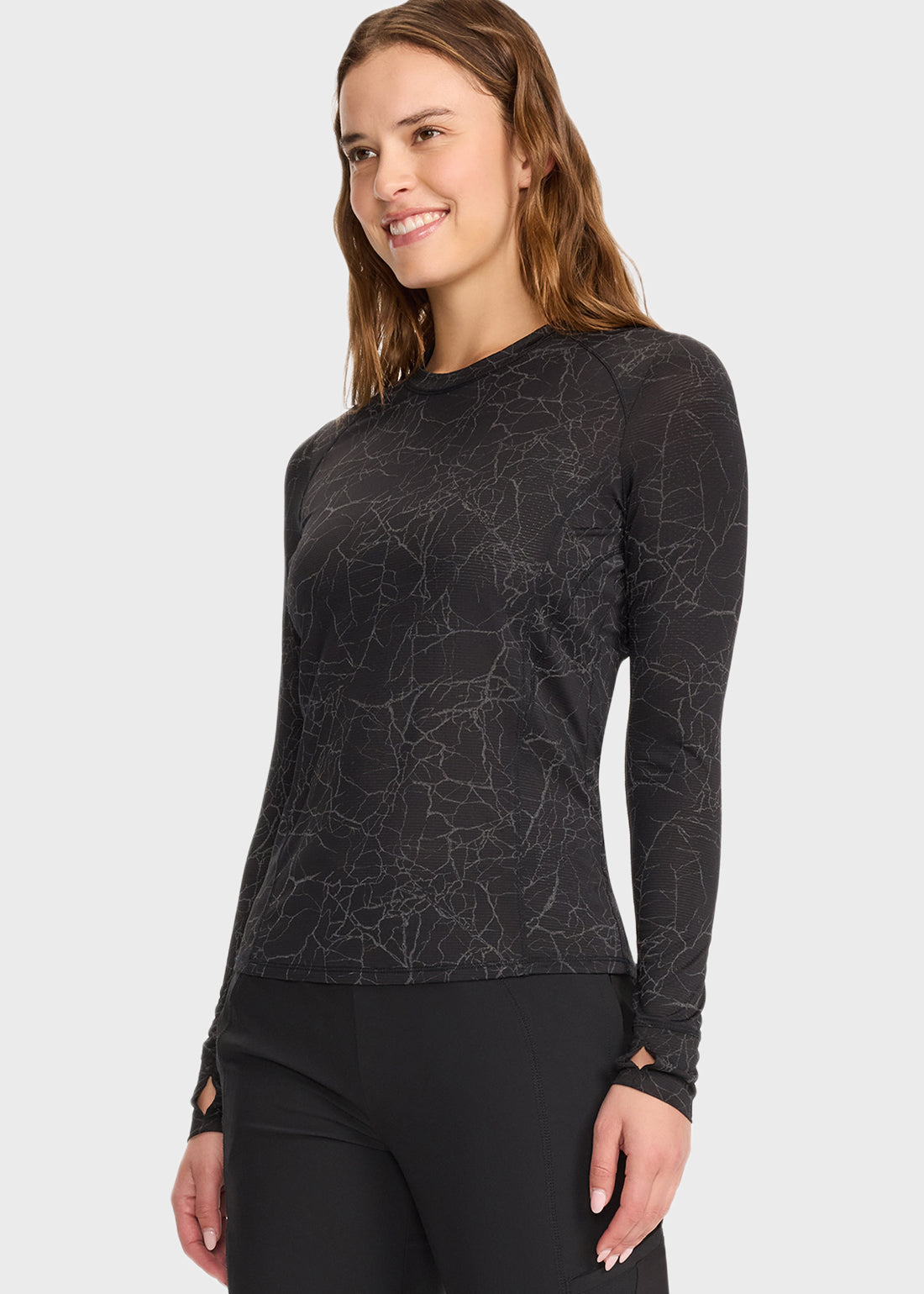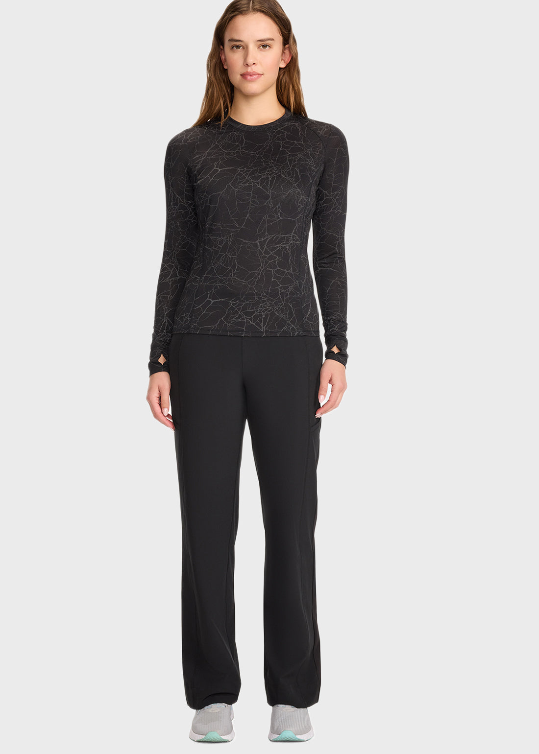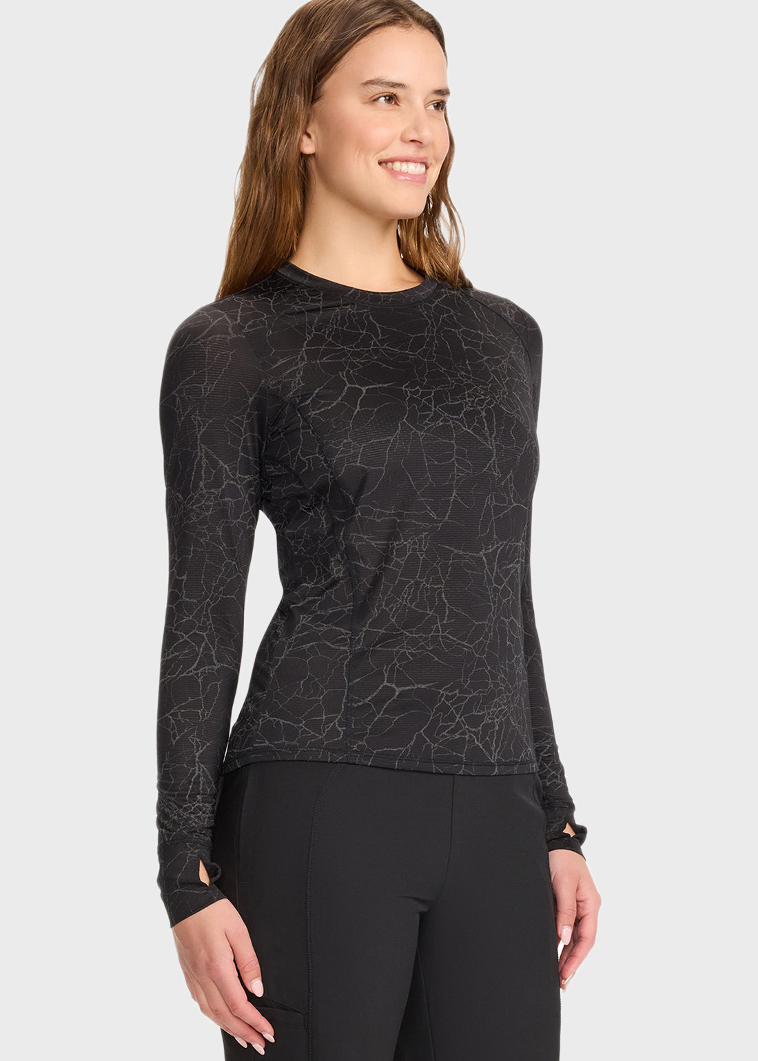 Long Sleeve Performance Underscrub in Crackle Layer Black offers a sleek, contemporary fit with stylish knit details. Designed for comfort and mobility, it features thumbholes and stylized seams, making it the perfect layering piece for all-day performance.