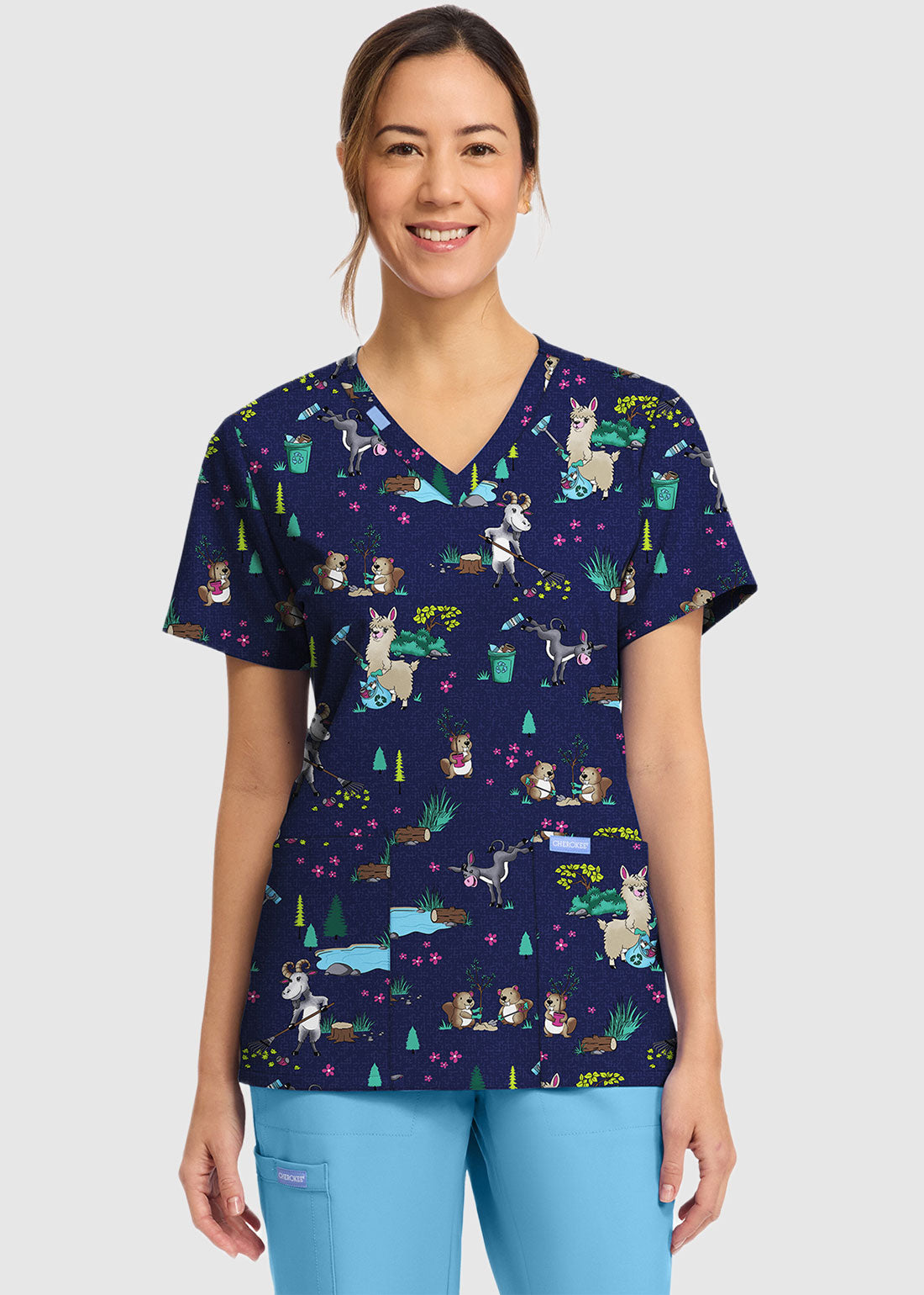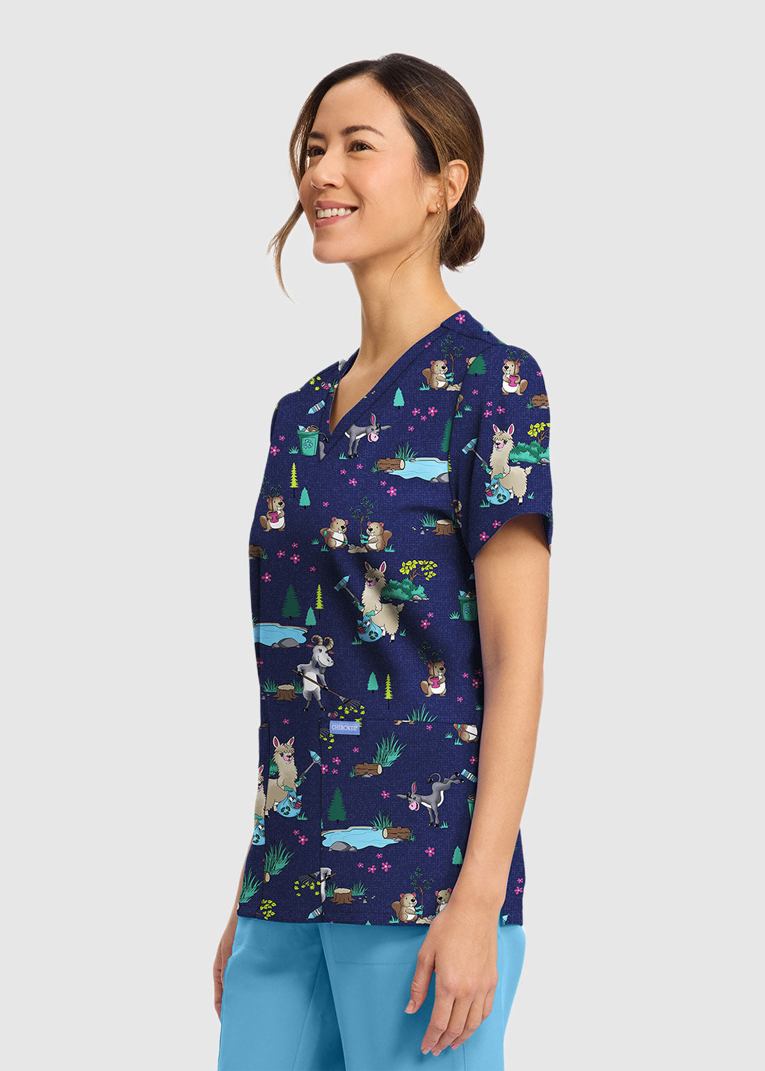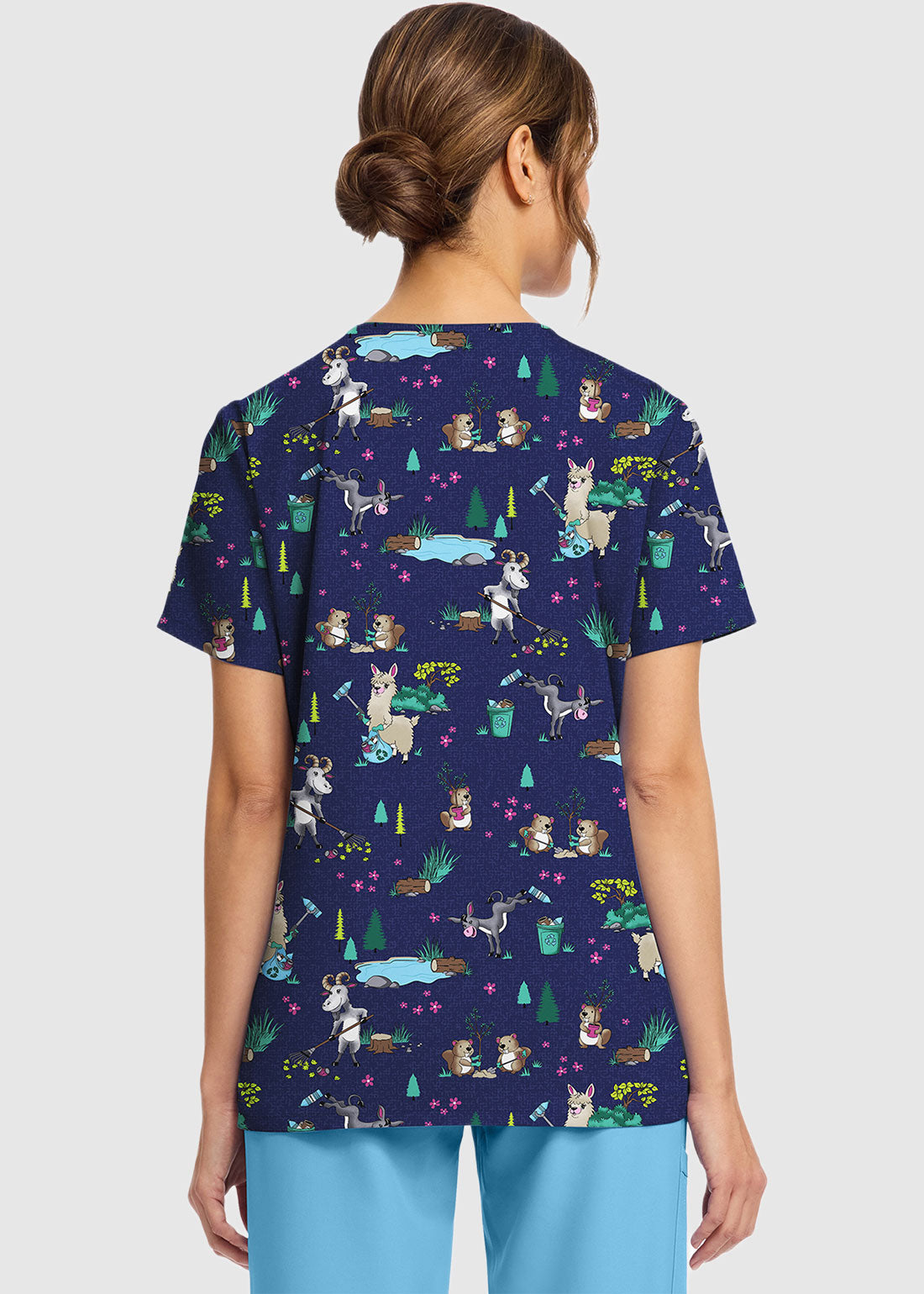 Women's Print V-Neck Top in Clean Up Crew adds a cheerful touch to your workwear. Designed with a modern classic fit, it features two patch pockets for storage and side vents for ease of movement, ensuring all-day comfort and style