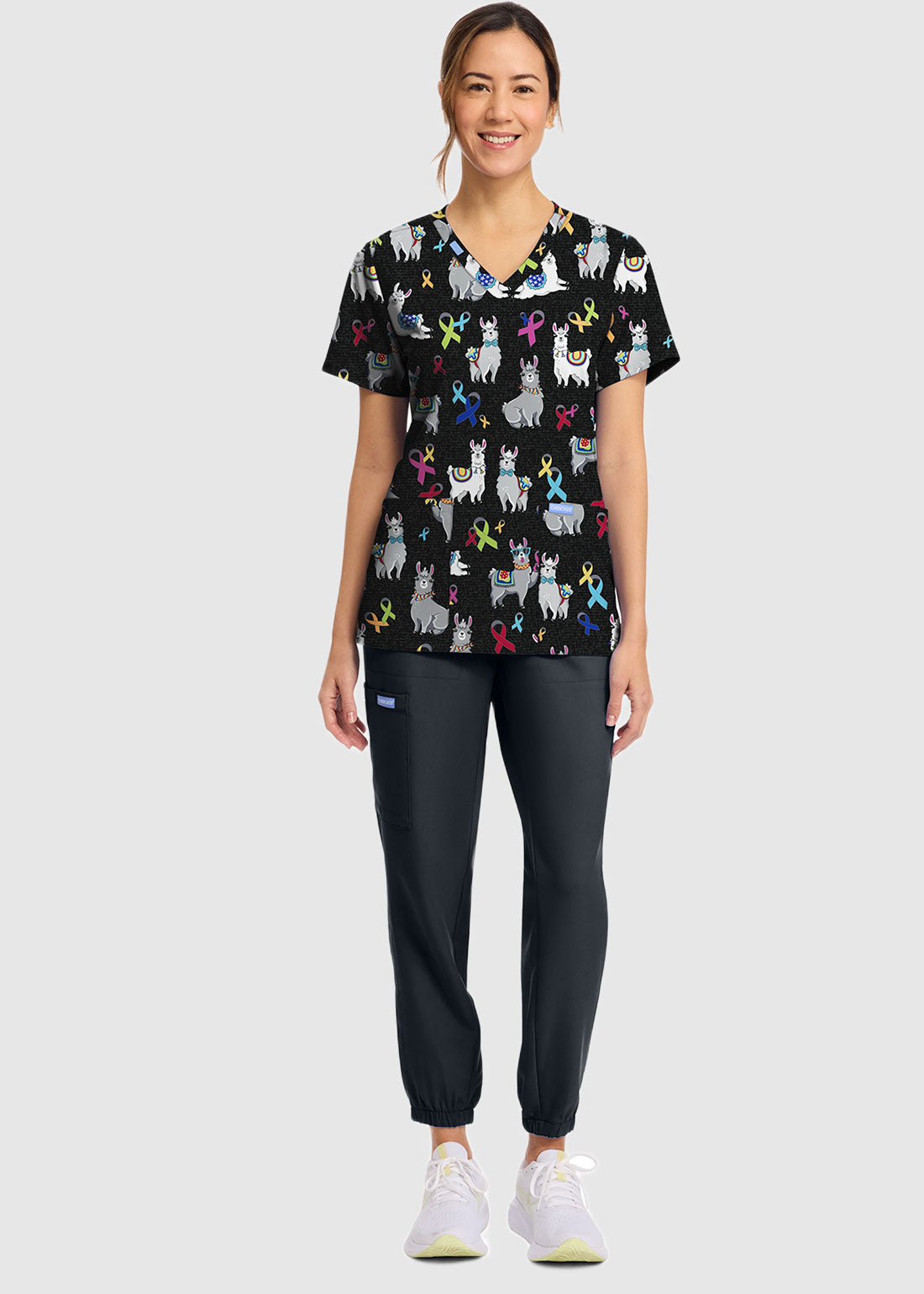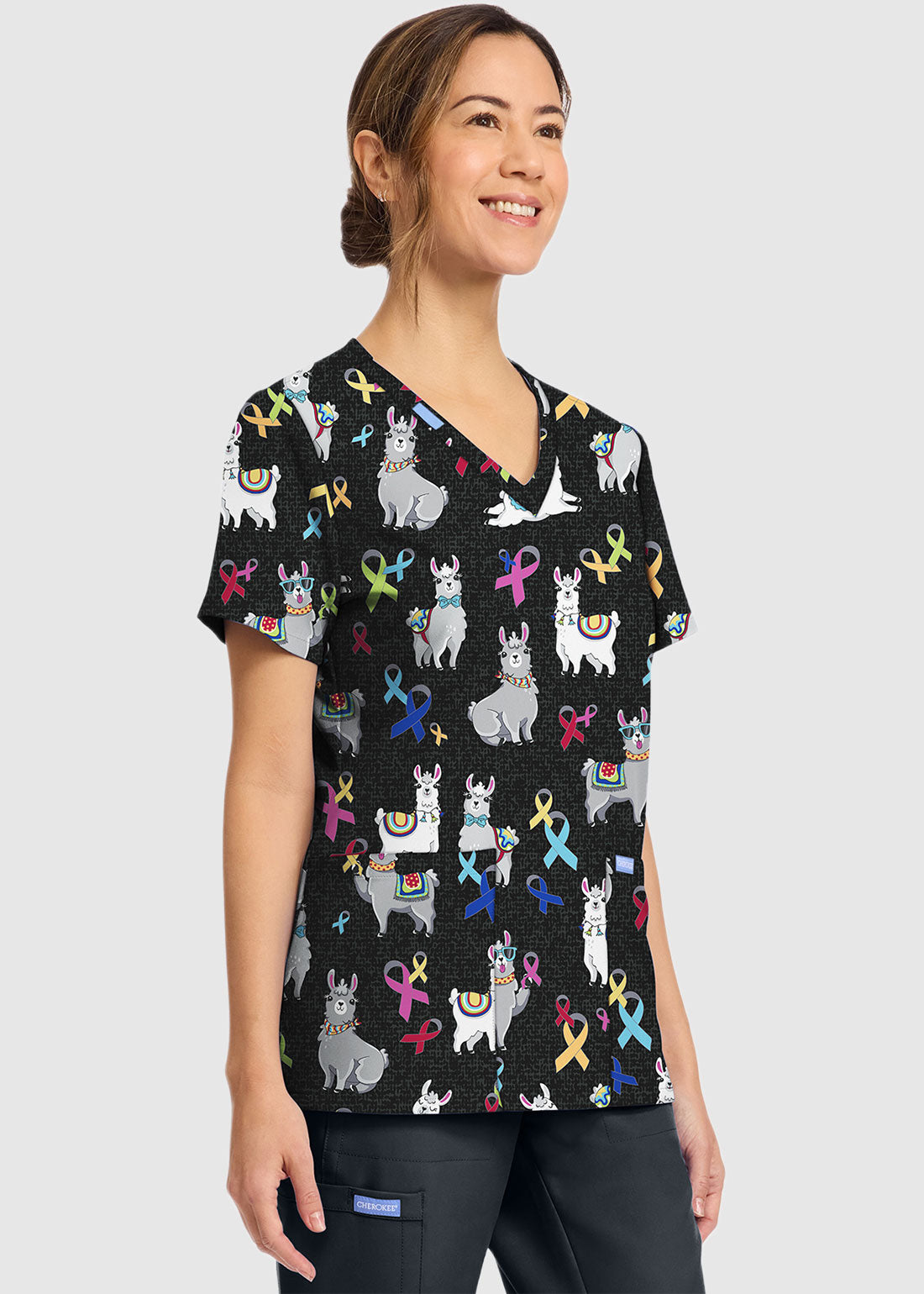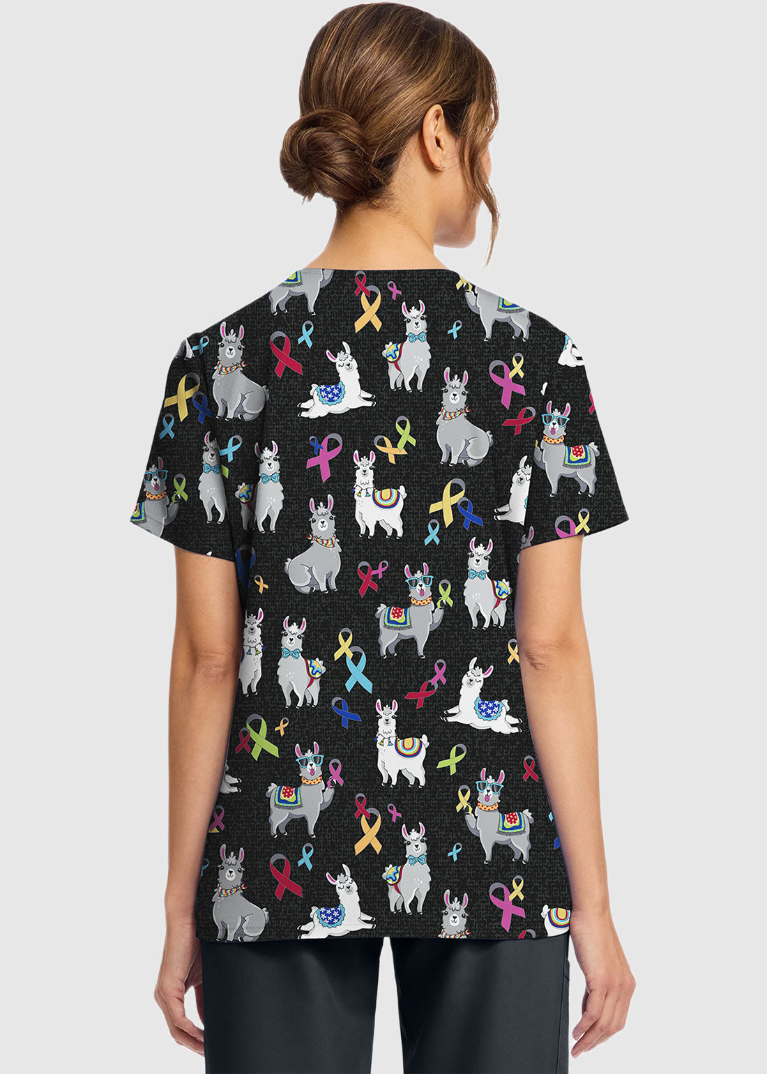 Women's Print V-Neck Top in Llama Be Aware adds a cheerful touch to your workwear. Designed with a modern classic fit, it features two patch pockets for storage and side vents for ease of movement, ensuring all-day comfort and style