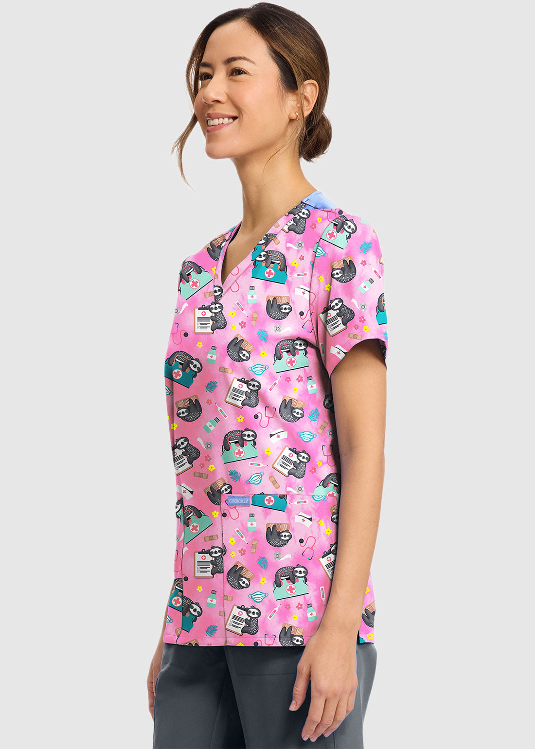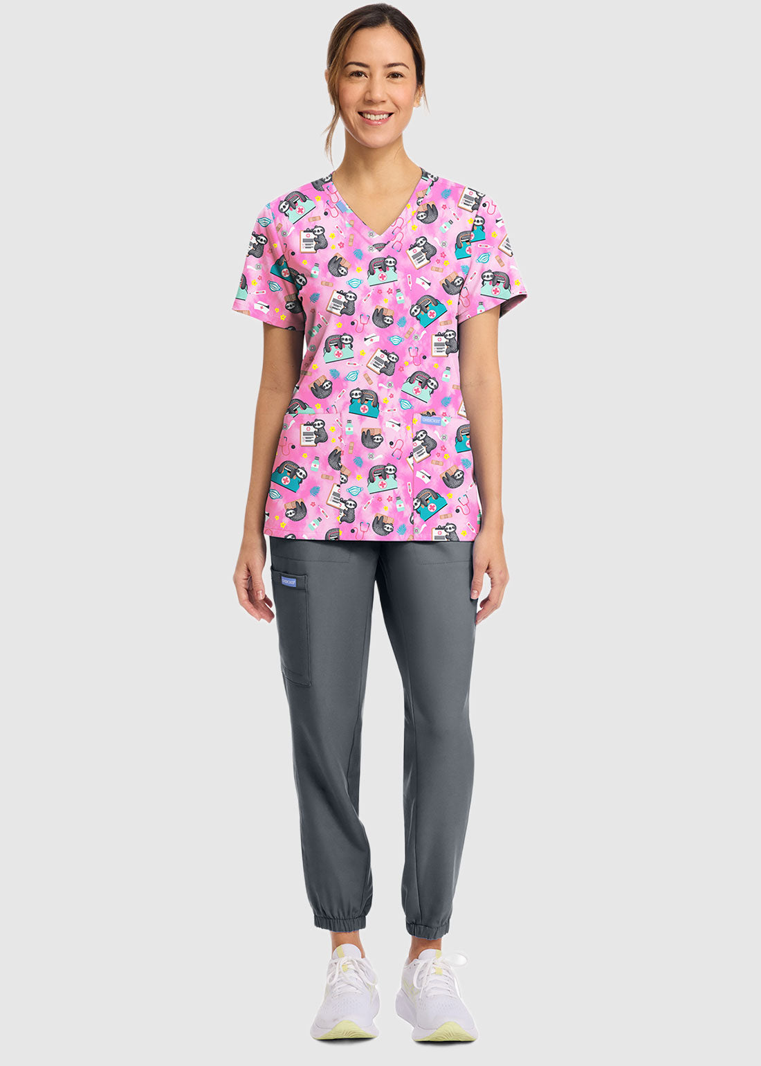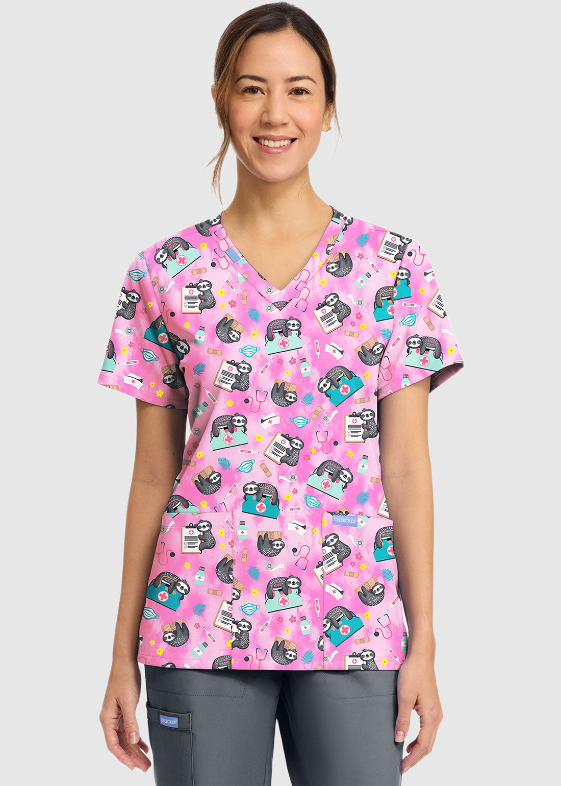 Women's Print V-Neck Top in Nurse Sloth adds a cheerful touch to your workwear. Designed with a modern classic fit, it features two patch pockets for storage and side vents for ease of movement, ensuring all-day comfort and style