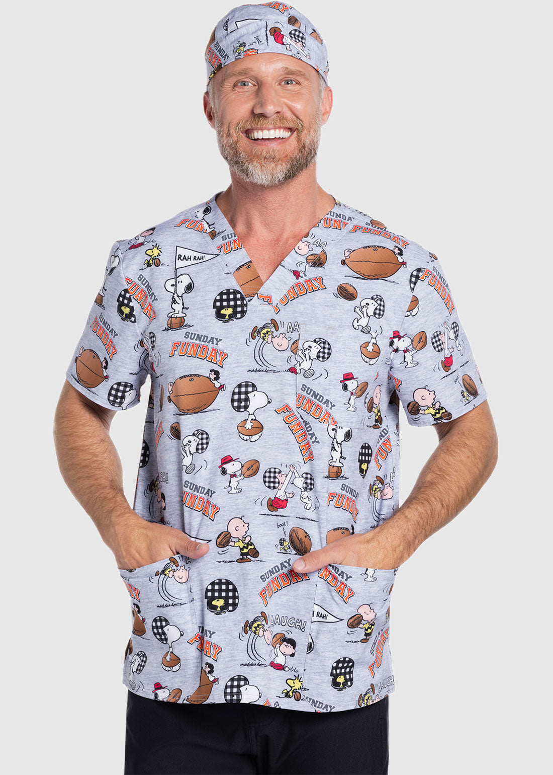 Spread smile with your scrubs. The Cherokee Licensed Men's V-Neck Top in Snoopy Funday adds a playful touch to your workwear. Featuring a men's fit, side vents, and three handy pockets, including a pen slot, this top blends functionality with fun for the perfect balance of comfort and character.
