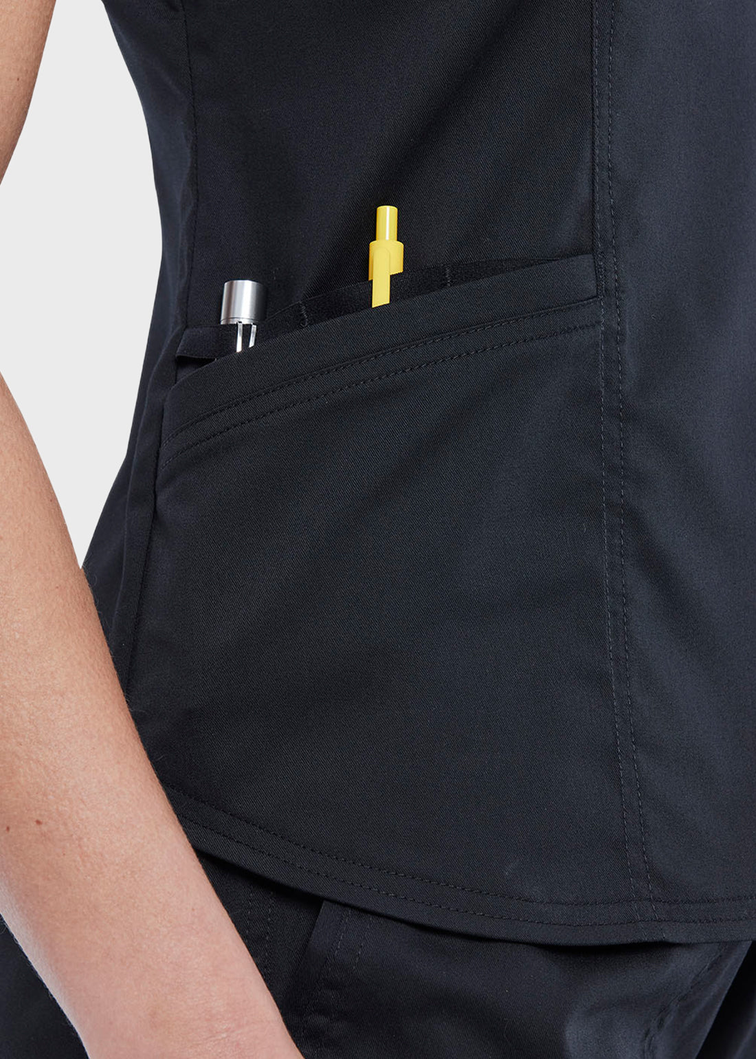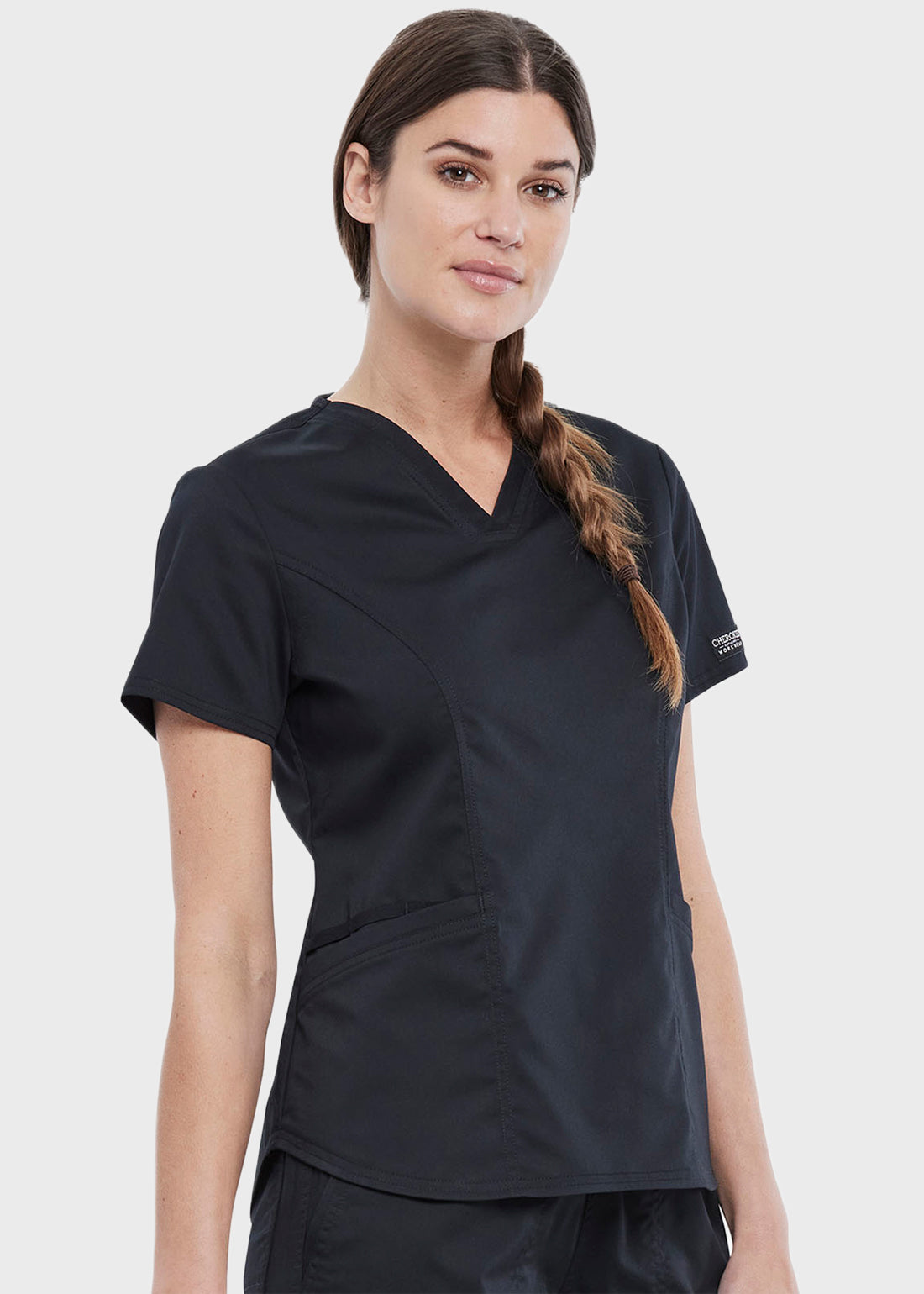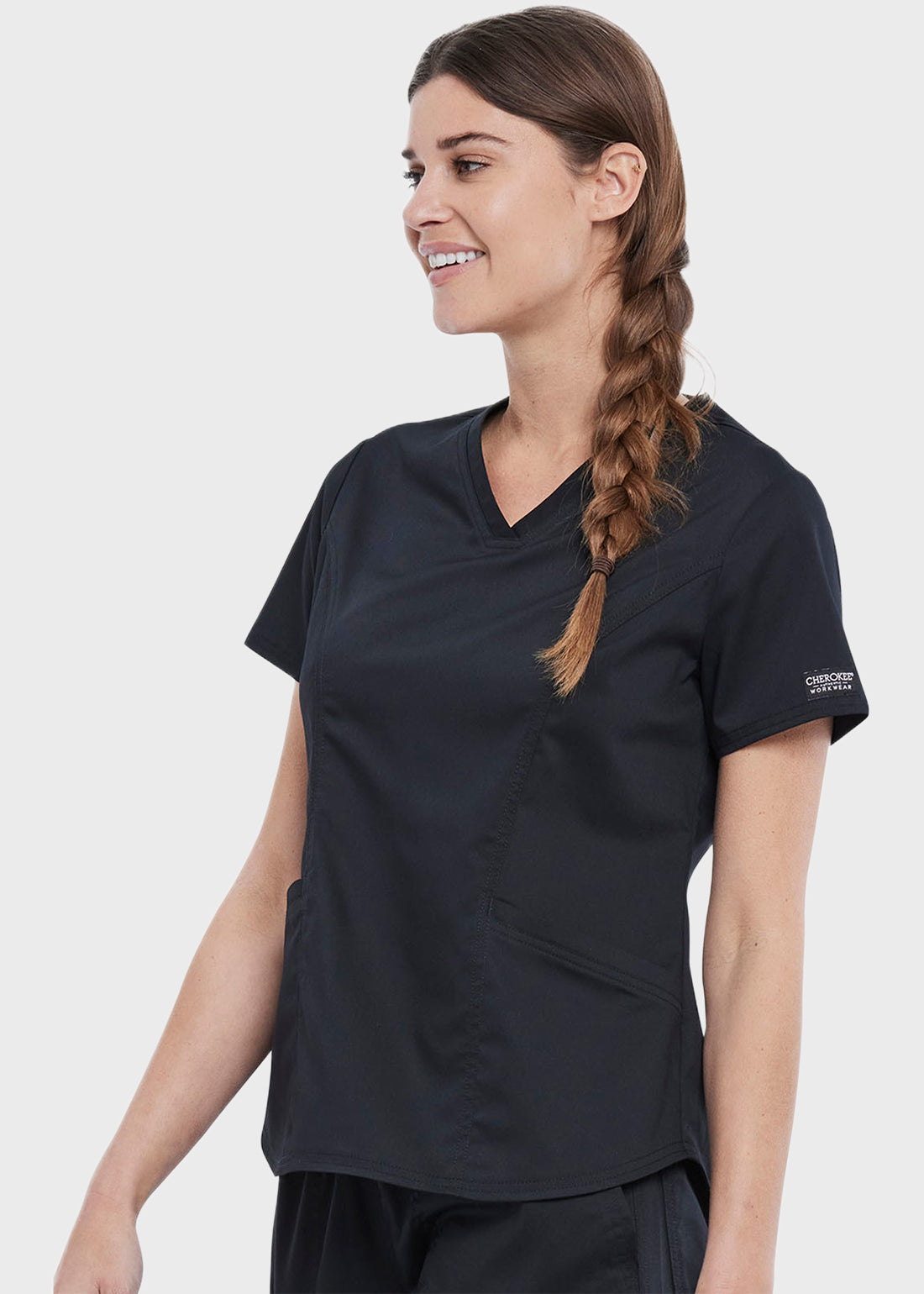 Look good and feel great in Cherokee Workwear Revolution WW612P V-Neck Top. The modern classic fit top comes with a relaxed V-neck, front and back princess seams and shirttail hem for unmatched functionality. Completed with two inset pockets and elastic instrument loops above right pocket, the top is a must have.