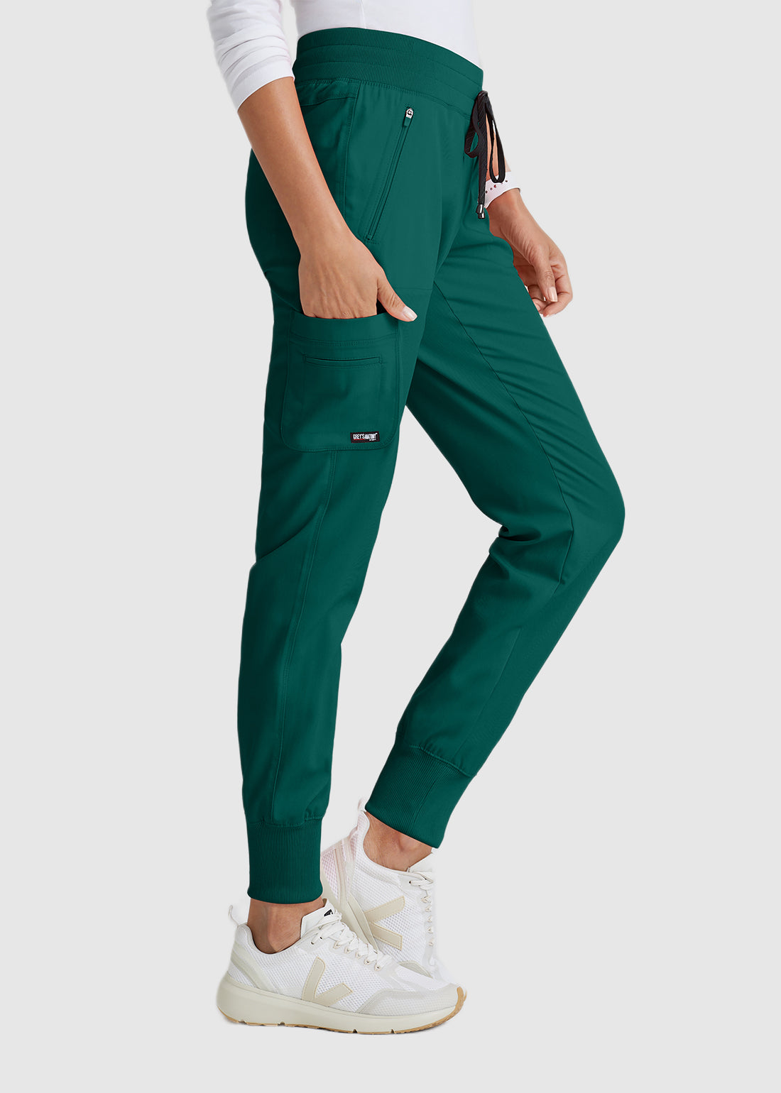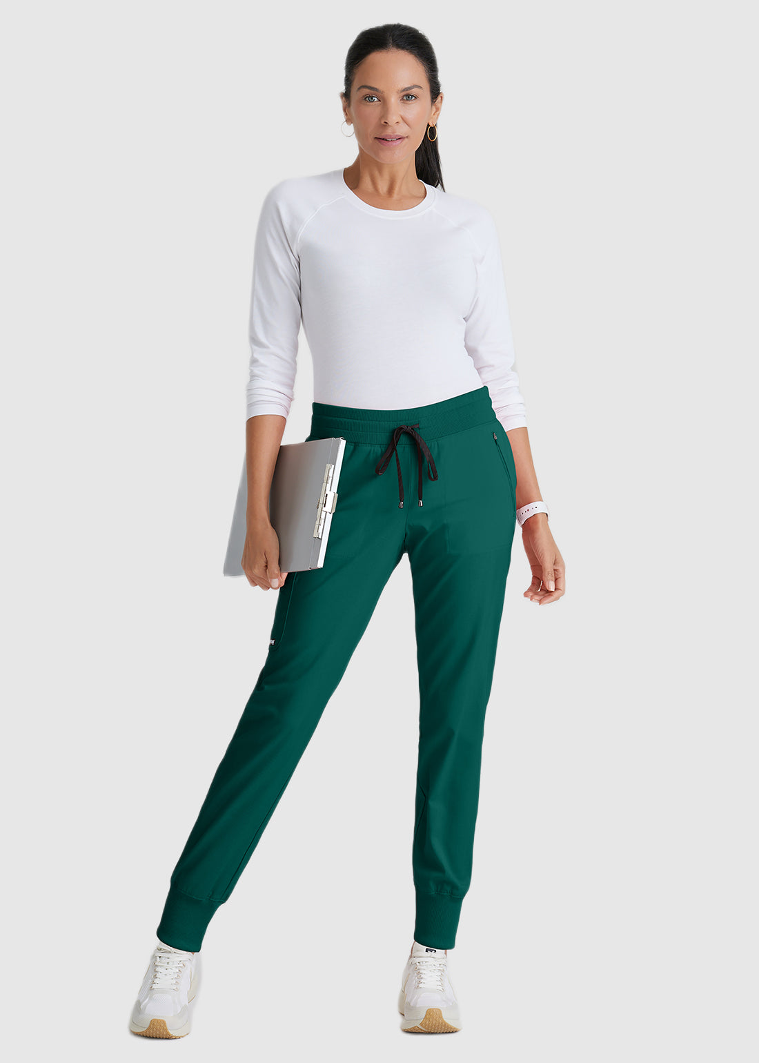 Be athletic, feel great and enjoy comfort with Grey's Anatomy GRSP537P Spandex Stretch Soft Rib Waist Jogger Scrub Petite Pant For Women. The relaxed knit rib drawstring contrast waistband fit exceptionally well. With cover stitching at the seams, spacious pockets, and three inch rib knit fitted cuffs, the pants are a must have.