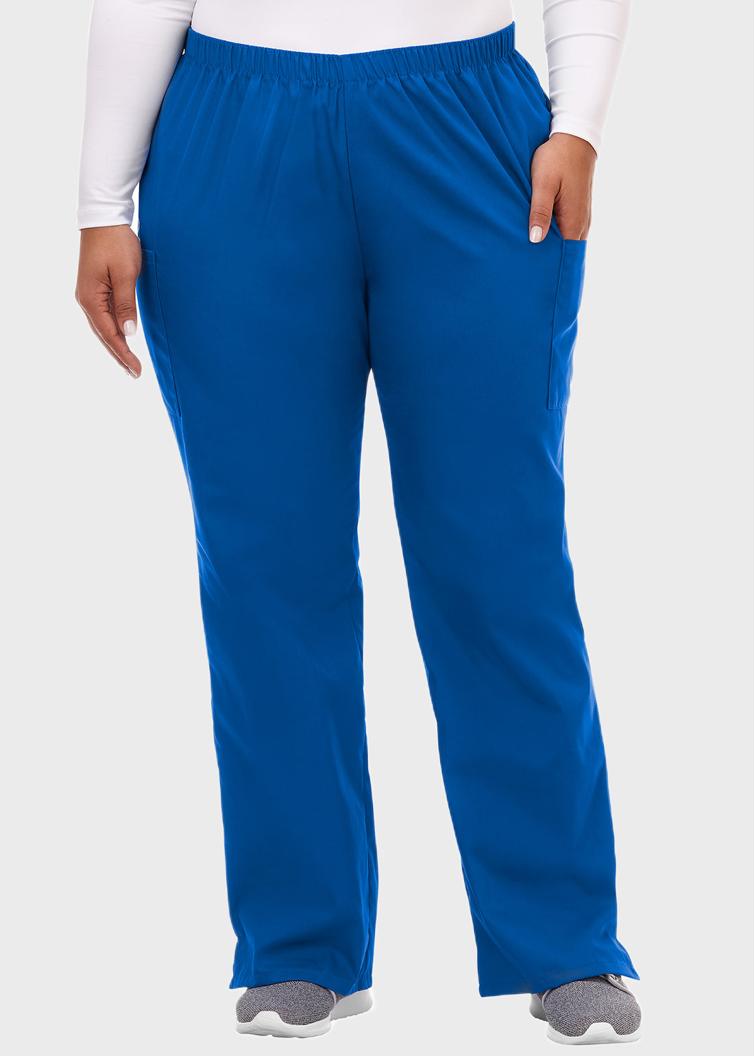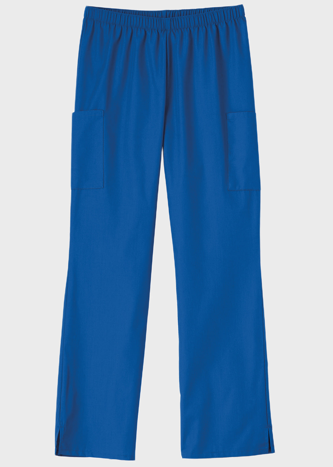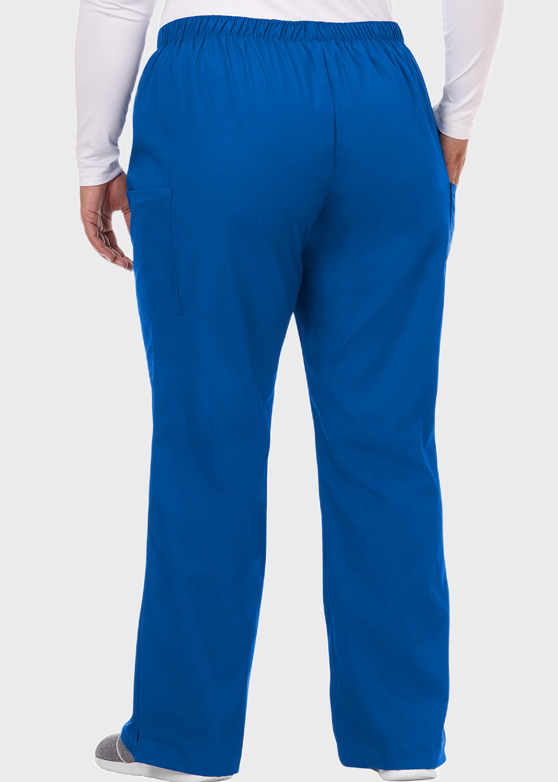 Fundamentals Ladies Cargo Pant. 18" Straight Leg Opening. Inseam 31", Petite 29", Tall 33". Covered Full Elastic Waist Pant. 1 Cargo Pocket. Side Vents. Non-Contrast.