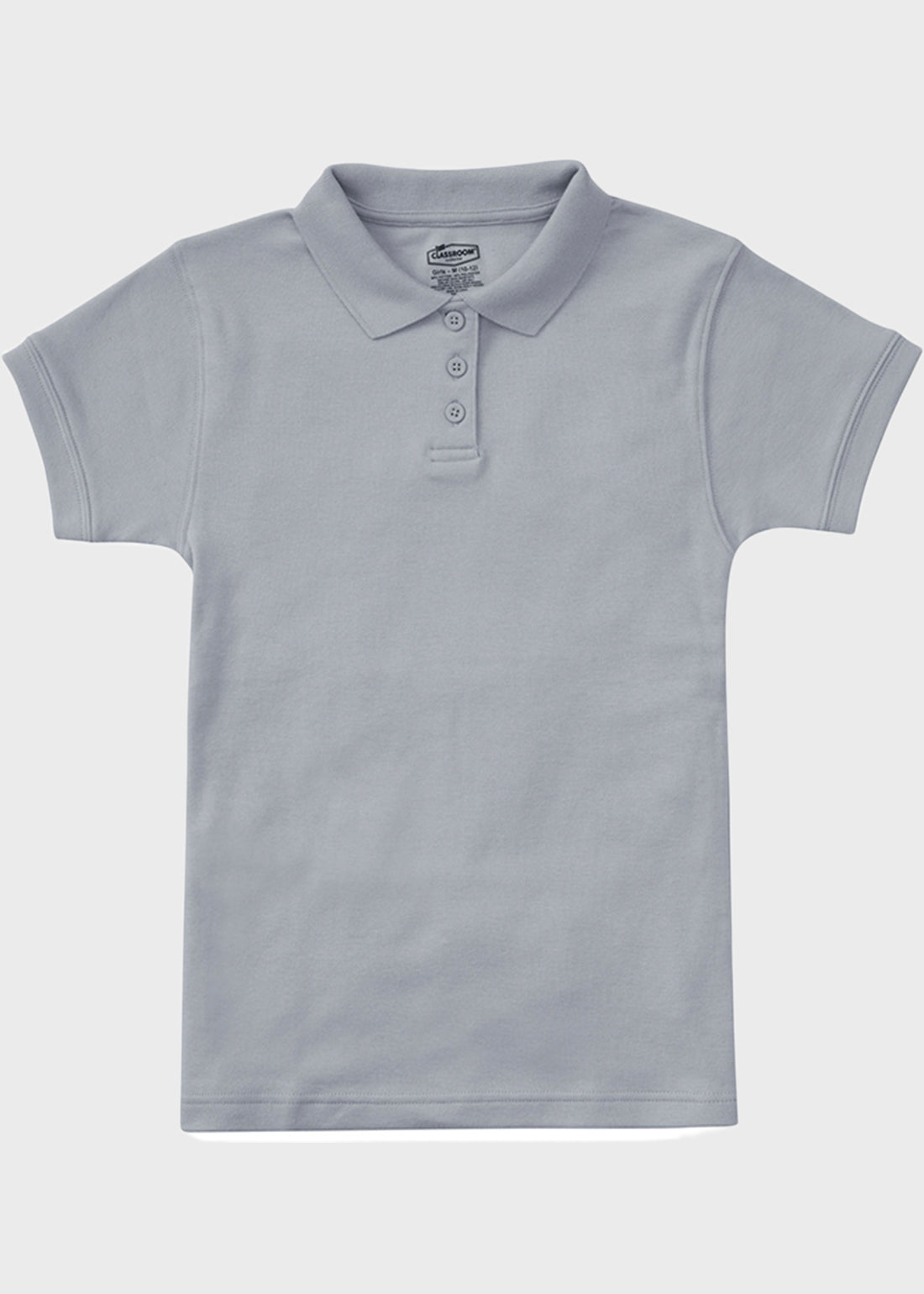 Combed cotton/poly blend in ringspun yarns, interlock knit, feminine fit, three-button placket with dyed-to-match buttons, matching ribbed collar, banded sleeves and double-needle hem.