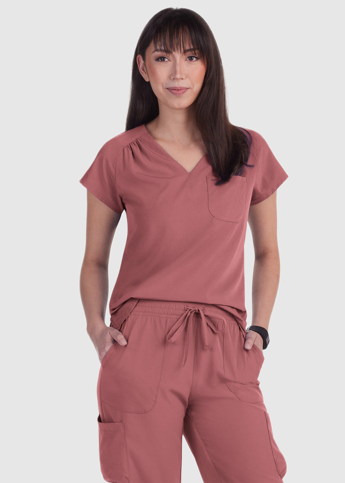 Planet koi Kailani Women's 1-Pocket Eco-Friendly Scrub Top is both stylish and sustainable. Featuring a heart-shaped neckline, a handy chest pocket, and side slits for easy movement, it offers comfort and versatility. Wear it tucked in or out for a polished, professional look.