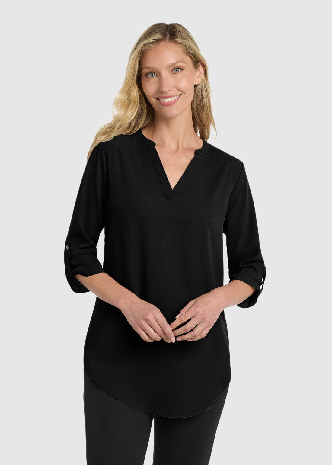 Chic and sleek, the Port Authority Ladies Three Quarter-Sleeve Tunic Blouse is all that you need. With a split v-neck, metal buttons, roll sleeves with button tabs, longer tunic length and gathered back detail, the blouse is a stylish addition to your wardrobe.