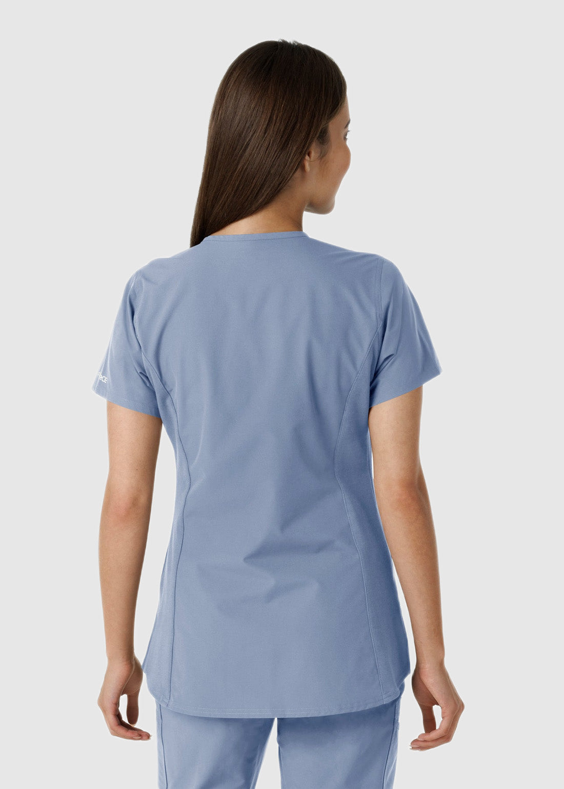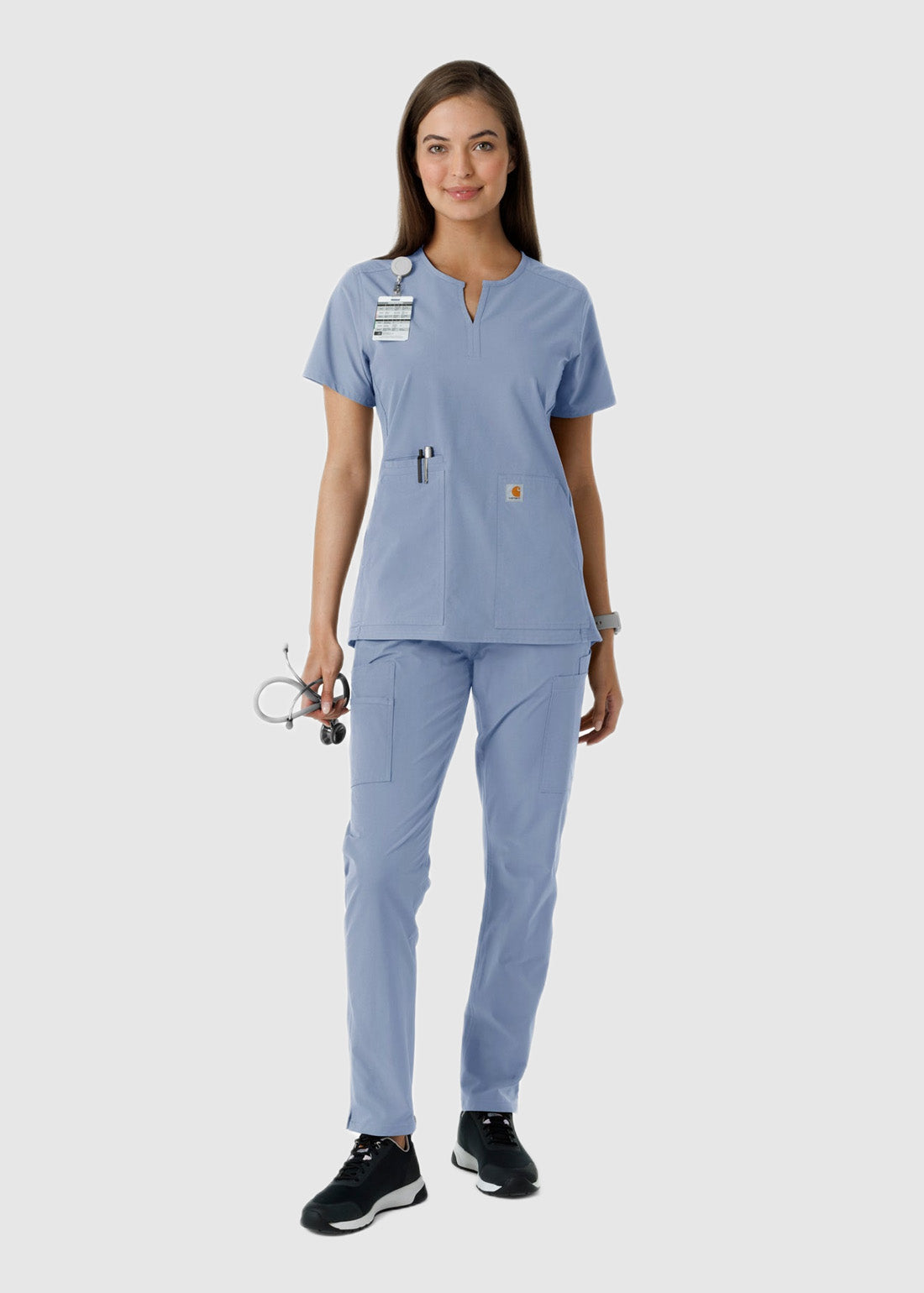 Carhartt Women's Notch Neck Tunic Knit Panel Scrub Top offers a modern fit with a stylish and functional design. Featuring a notch neckline with a badge ID loop, it includes front patch side-entry pockets and a hidden top-loading phone pocket for convenient storage.