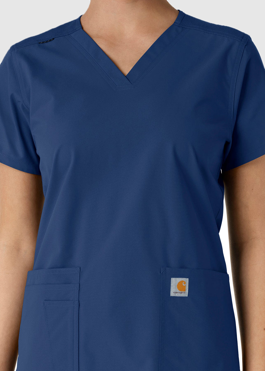 Carhartt Force Essentials Women's V-Neck Knit Panel Scrub Top offers a modern fit with both style and functionality. Featuring two large top-loading front patch pockets, an internal phone pocket, and a scissor pocket, it keeps essentials within reach. A curved shirttail hemline and knit panel at the back yoke provide added comfort and mobility.