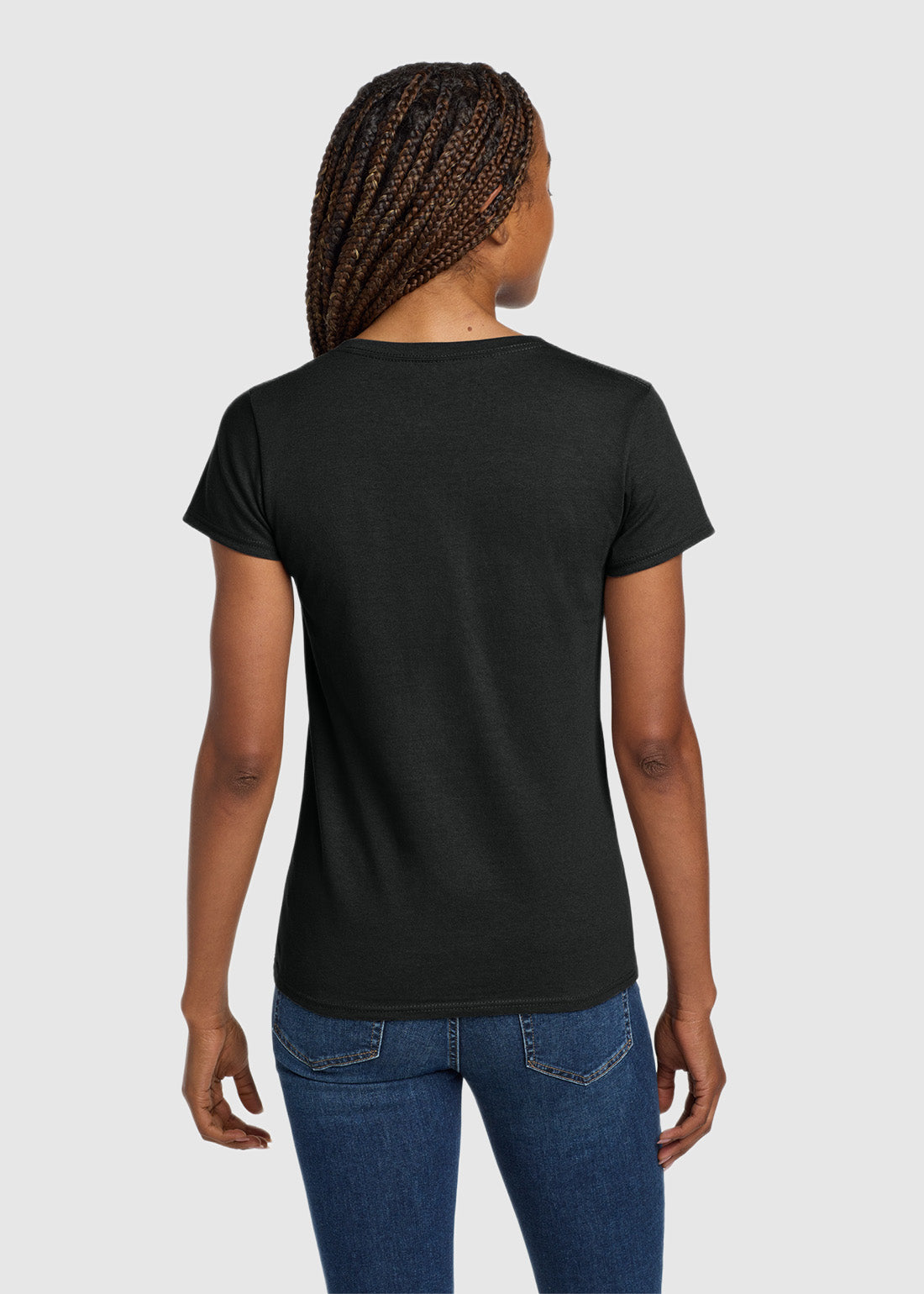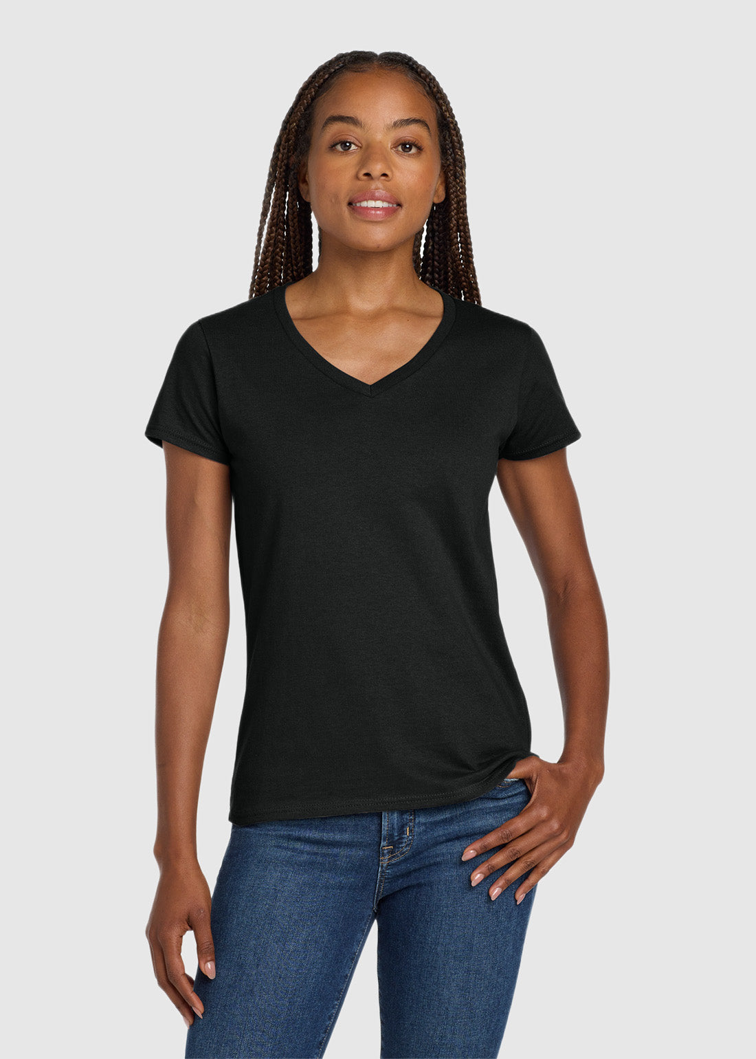 Be casual and look great in Gildan Ladies V-neck T-shirt. With a half mitered V-neck collar and cap sleeves, look fabulous. With double-needle sleeve and bottom hems, preshrunk jersey knit, side seaming and taped neck and shoulders, the t-shirt is great value for money.