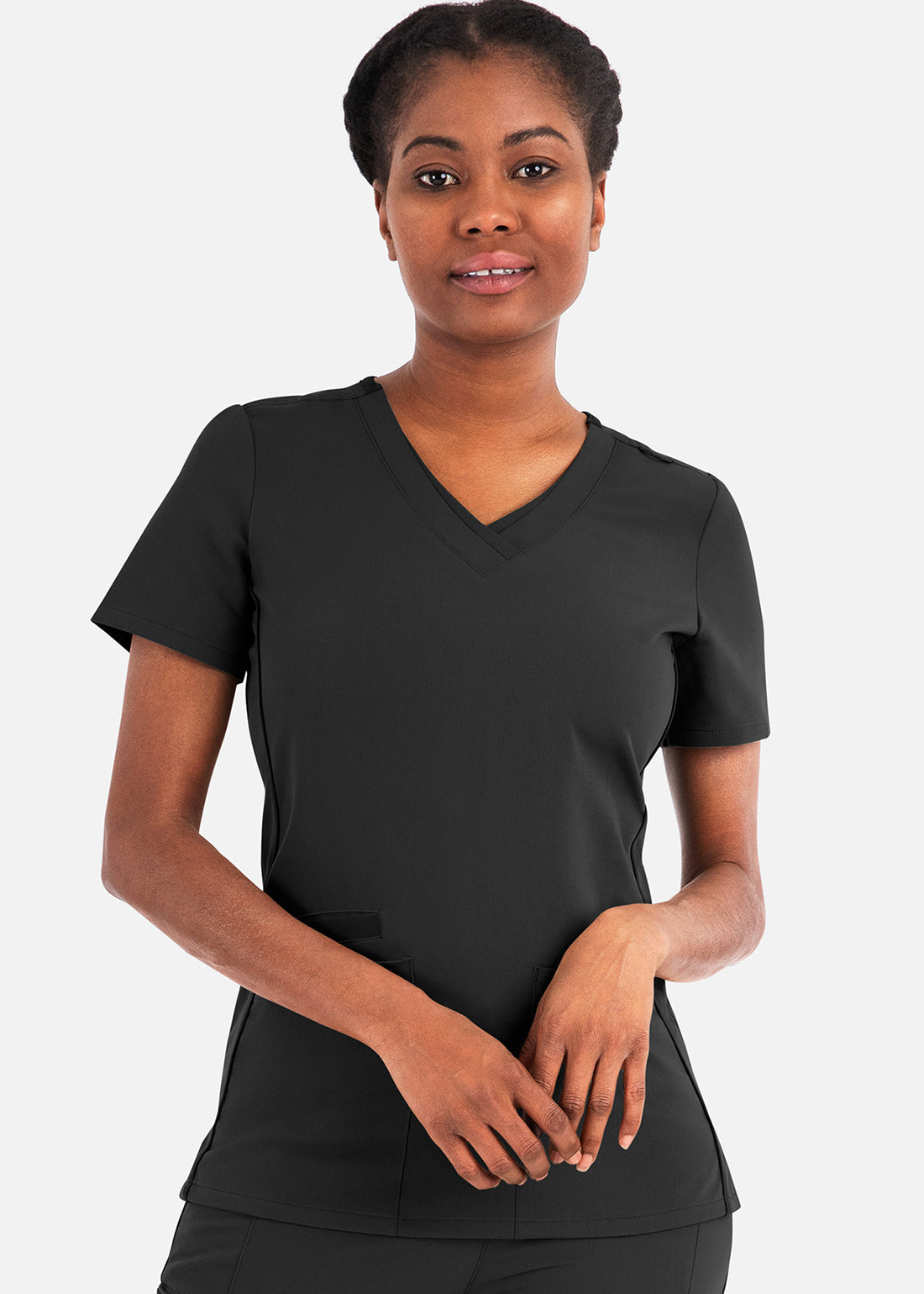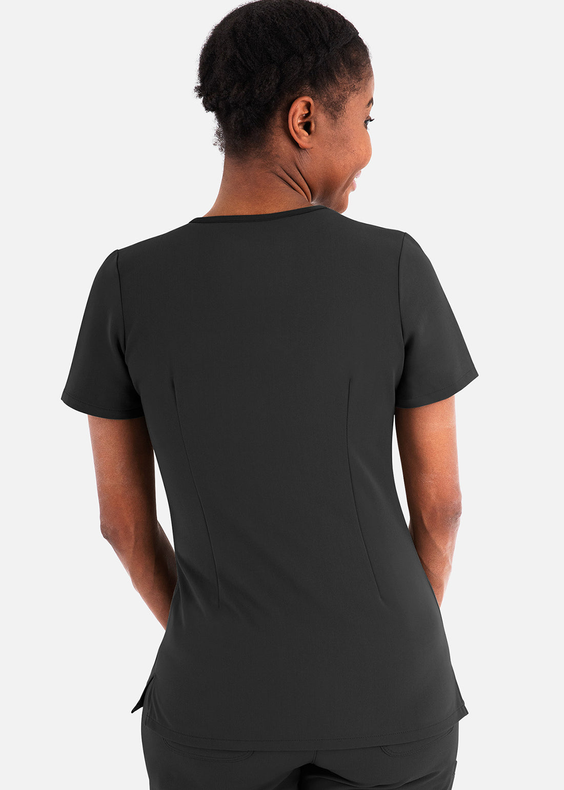 Make an impression at work with Maevn Women's 3901 Contrast Double V-neck Solid Scrub Top. The double v-neckline with contrast banding detail looks impressive. With short sleeves, shoulder stitch detail with badge loop, side princess seaming with piping detail, functional pockets and back shaping darts – the top is functional and appealing.