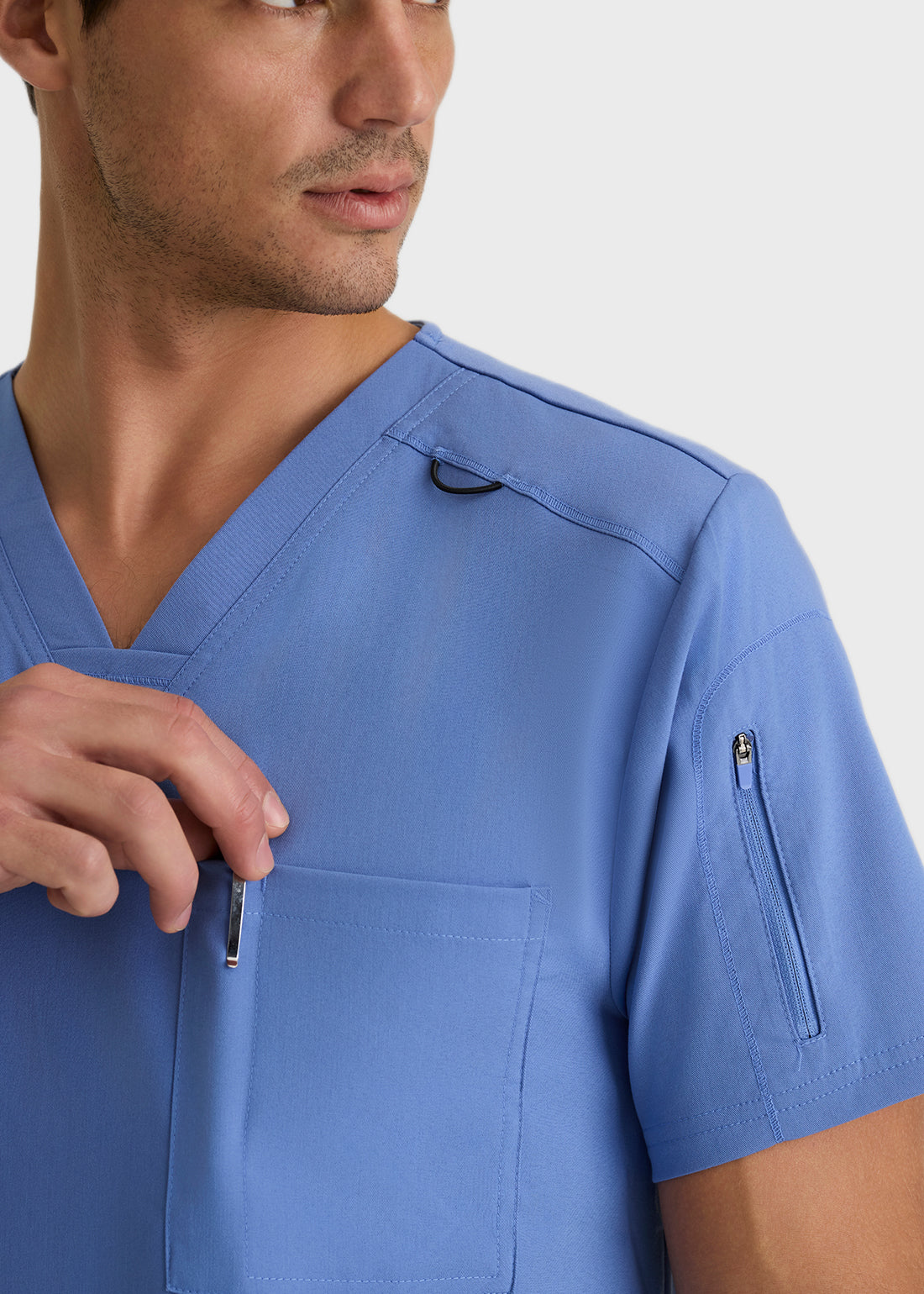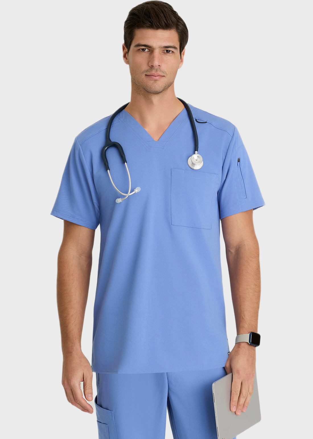 Look smart and feel great in Spandex Stretch by Greys Anatomy Men Murphy Scrub Top. The scrub top comes with a V-neckline, short sleeves for breathability, two pockets, including chest pocket and zipper sleeve pocket for storage and logo detail at side pockets makes this top a must have.