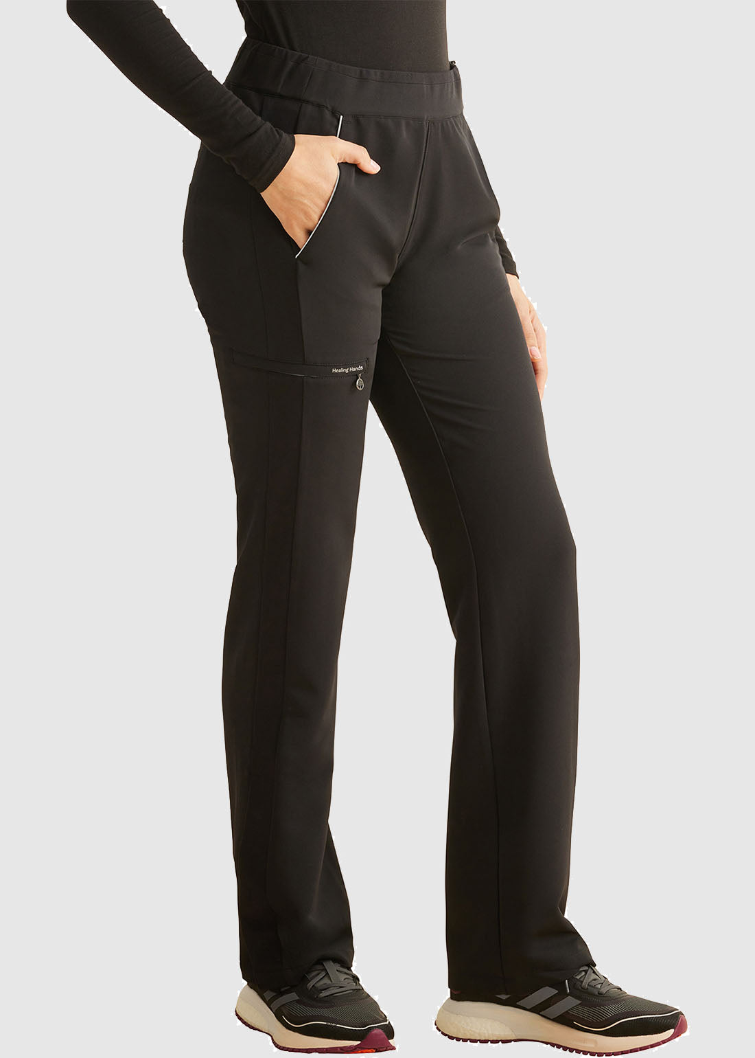 The ultimate fusion of style and functionality: the 360 by Healing Hands Women's Nissa Scrub Pant. Designed to elevate your workday, it features a sleek flat front waistband with a convenient side zipper entry. With 2 front pockets, a welt zipper cargo pocket, and a pen pocket, you'll have ample storage for essentials. Plus, textured knit trim and snap-closure vents add a modern twist. Step into comfort and confidence with every wear.