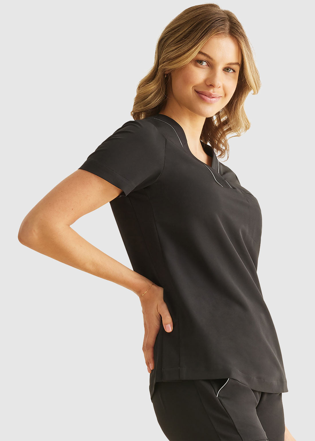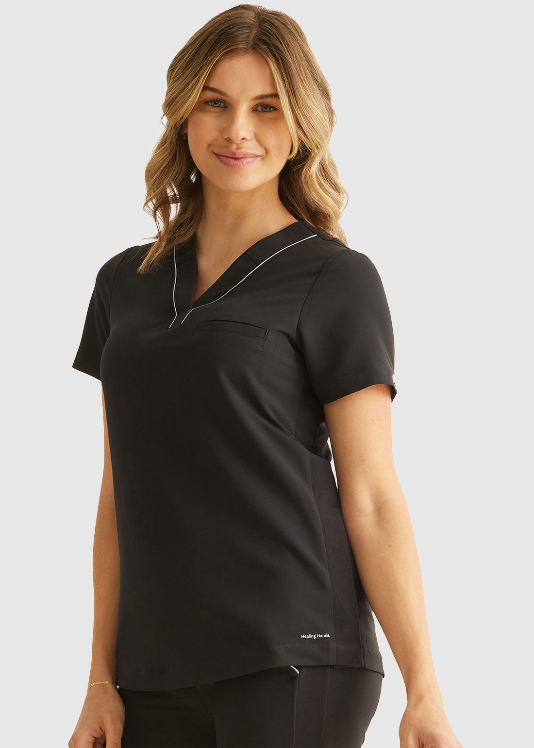 Be smart and feel great in 360 by Healing Hands Women's Stella Scrub Top. Featuring a flattering shaped v-neckline and short sleeves, it offers both comfort and style. Keep your essentials close at hand with a convenient welt chest pocket. Crafted with knit side panels and a back yoke, along with snap-closure side vents for breathability, it ensures ease of movement throughout your busy day. Plus, with reflective trim for added visibility, you'll shine bright on every shift.
