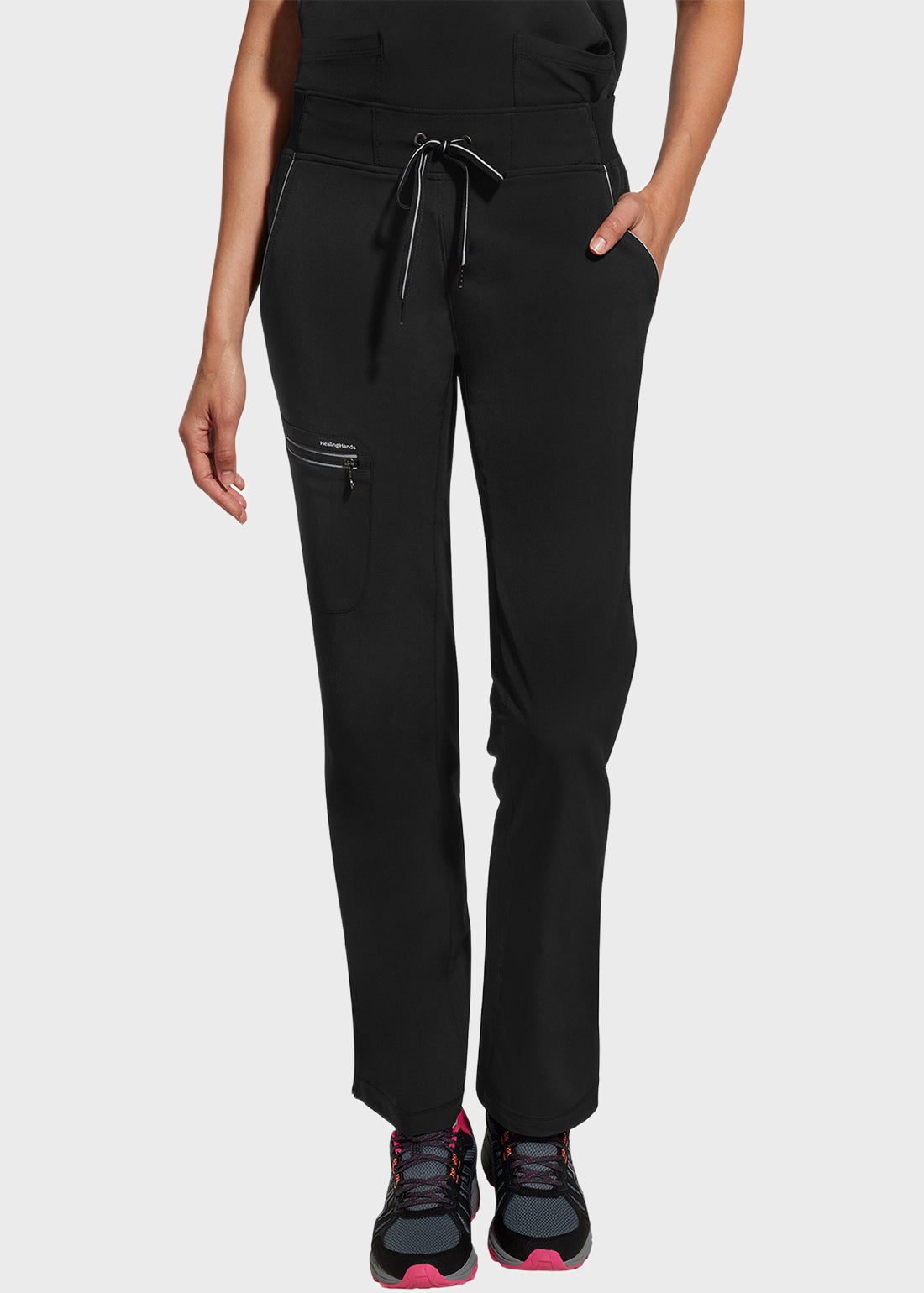 Be comfortable and feel great in Healing Hands 360 Nisha Tall Pant. Featuring a relaxed rib knit waistband drawstring pant for comfort, reflective tape details that lo0oks alluring and six spacious pockets including one zipper cargo pocket and one mesh cell phone pocket ensures functionality and performance.