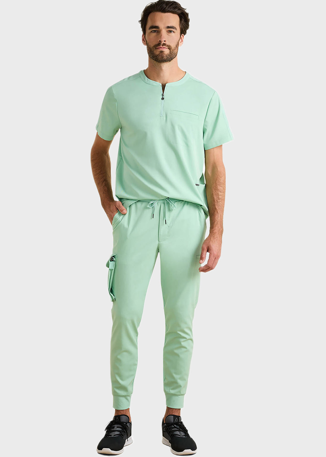 Masculine and impressive, the Dr. Kwane x Healing Hands Men's Vernon Mid Rise Jogger Scrub Pant blends style and functionality. Featuring an elastic waistband with a zipper fly and jogger cuffs, it offers both comfort and modern flair. With seven convenient pockets, including detachable cargo options with versatile straps, it's designed to keep you organized on the go. Enhanced with knit back panels, pet hair resistant finish, and PROTX2 fabric technology for ultimate performance.