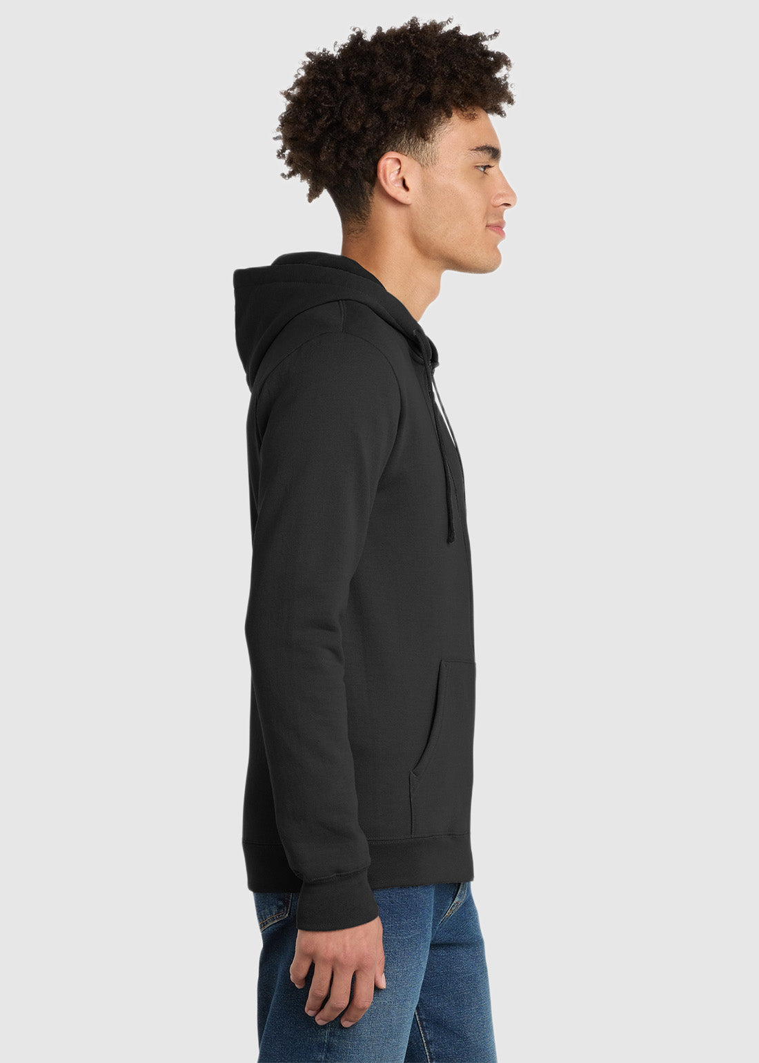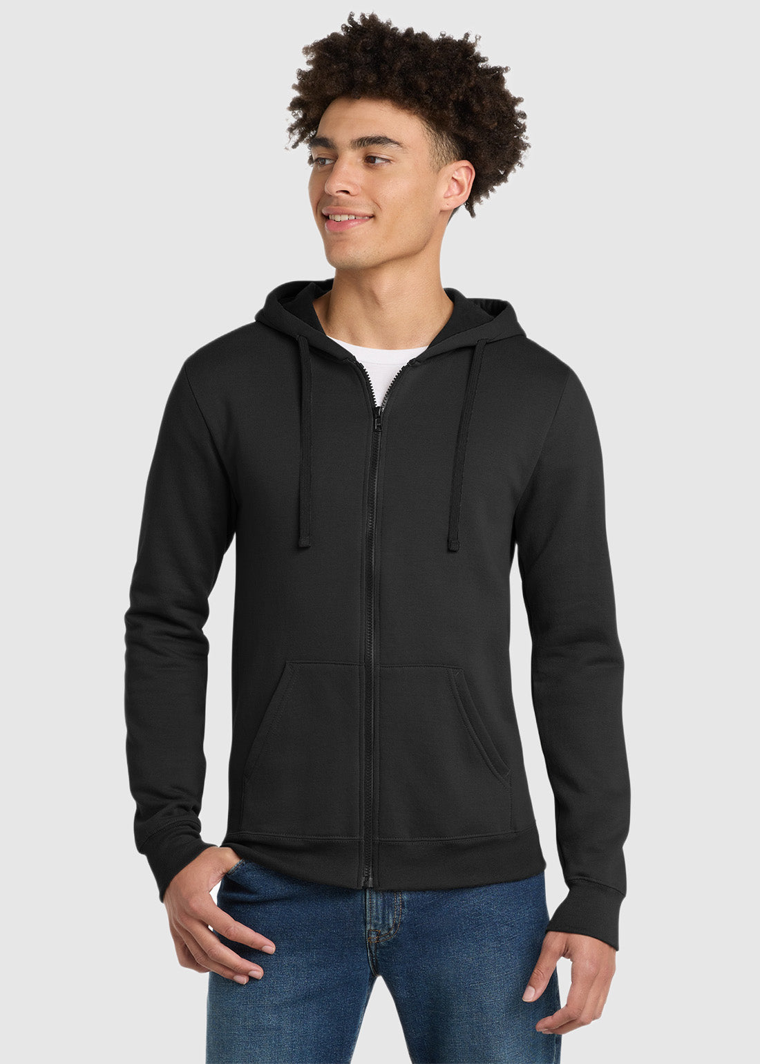 Layer up in style with District The Concert Fleece Full-Zip Hoodie. With a tear-away label, black jersey hood lining, twill back neck tape, flat drawcords, YKK zipper and zipper tape, front pockets, and 2x2 rib knit cuffs and hem - get durability, performance and comfort.