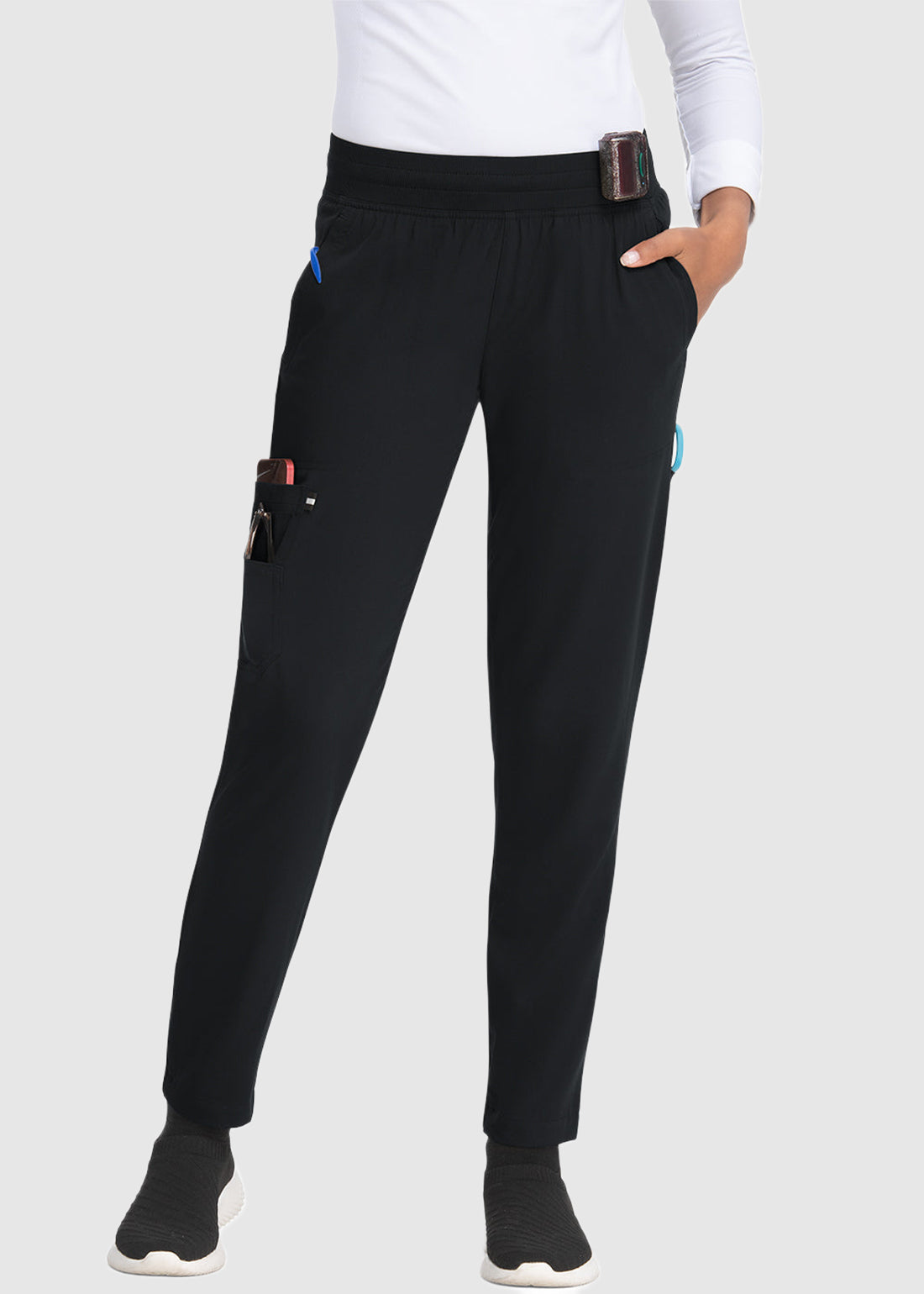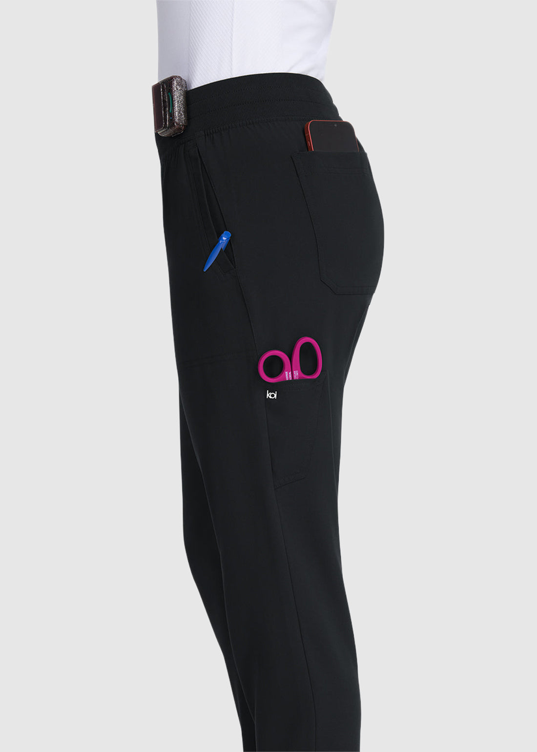 koi Next Gen Smart Daily Women's 7-Pocket Jogger-Style Scrub Pant combines comfort and practicality with a ribbed waistband and hidden drawstring. Featuring seven pockets, a slim leg with a tapered ankle, and back elastic cuffs, these jogger-style pants are perfect for a sleek, functional look.