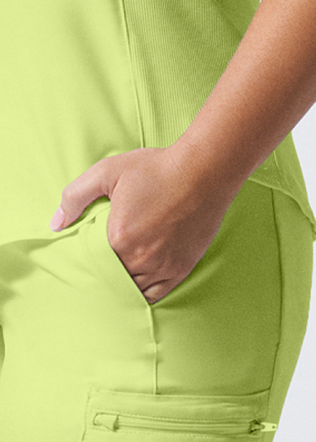 Look your best and feel great in Landau Forward Women's 2-Pocket V-Neck Scrub Top. With a trendy V-neck, rib-knit side panels for extra mobility, shoulder bungee loop, shirttail hemline, you get unmatched functionality and comfort. Completed with two pockets: one welt chest pocket, and one vertical zipper pocket, you get safe and secure storage.