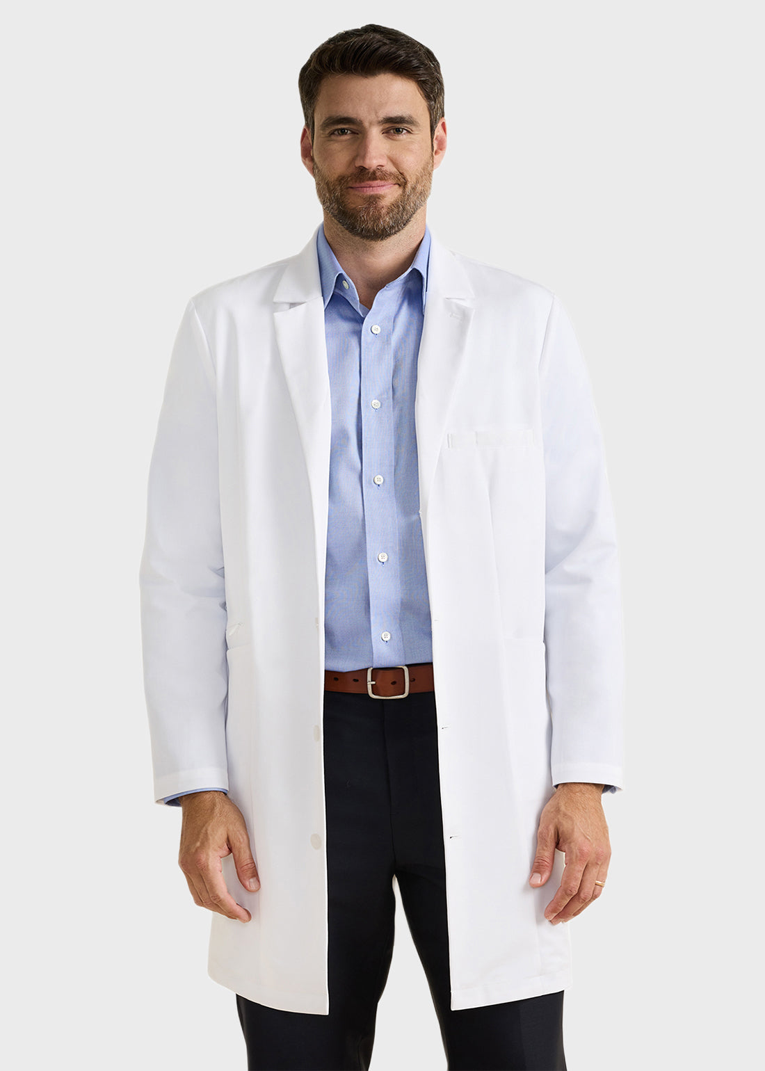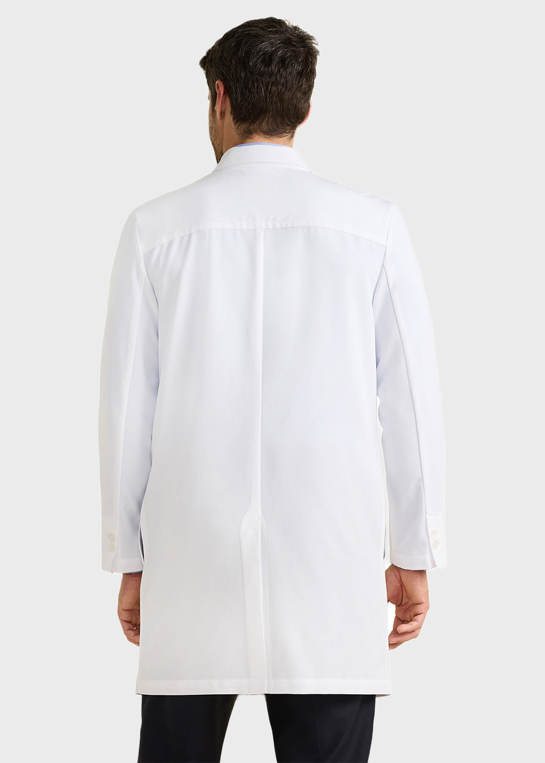 Make an impression with the HH White Coat Lawrence Men's 37" Lab Coat. The modern-fit, full-length coat combines classic notched lapels and a four-button closure with the practicality of seven pockets for ultimate organization. Thoughtfully designed with sleeve cuff buttons, a back yoke for a perfect fit, and a back kick pleat for ease of movement, this lab coat ensures you stay sharp and comfortable throughout your workday.