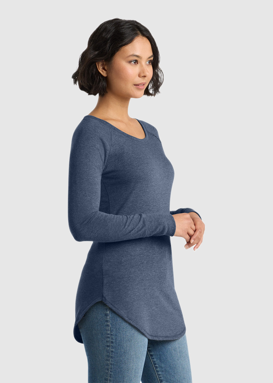 Look edgy and feel great in District Women's Perfect Tri Long Sleeve Tunic Tee. With a raw edge detail at armholes, coverstitch details, 1x1 rib knit neck, tear-away label, rib knit elongated cuffs, longer tunic length and curved hem, the tee is functional and rewarding.
