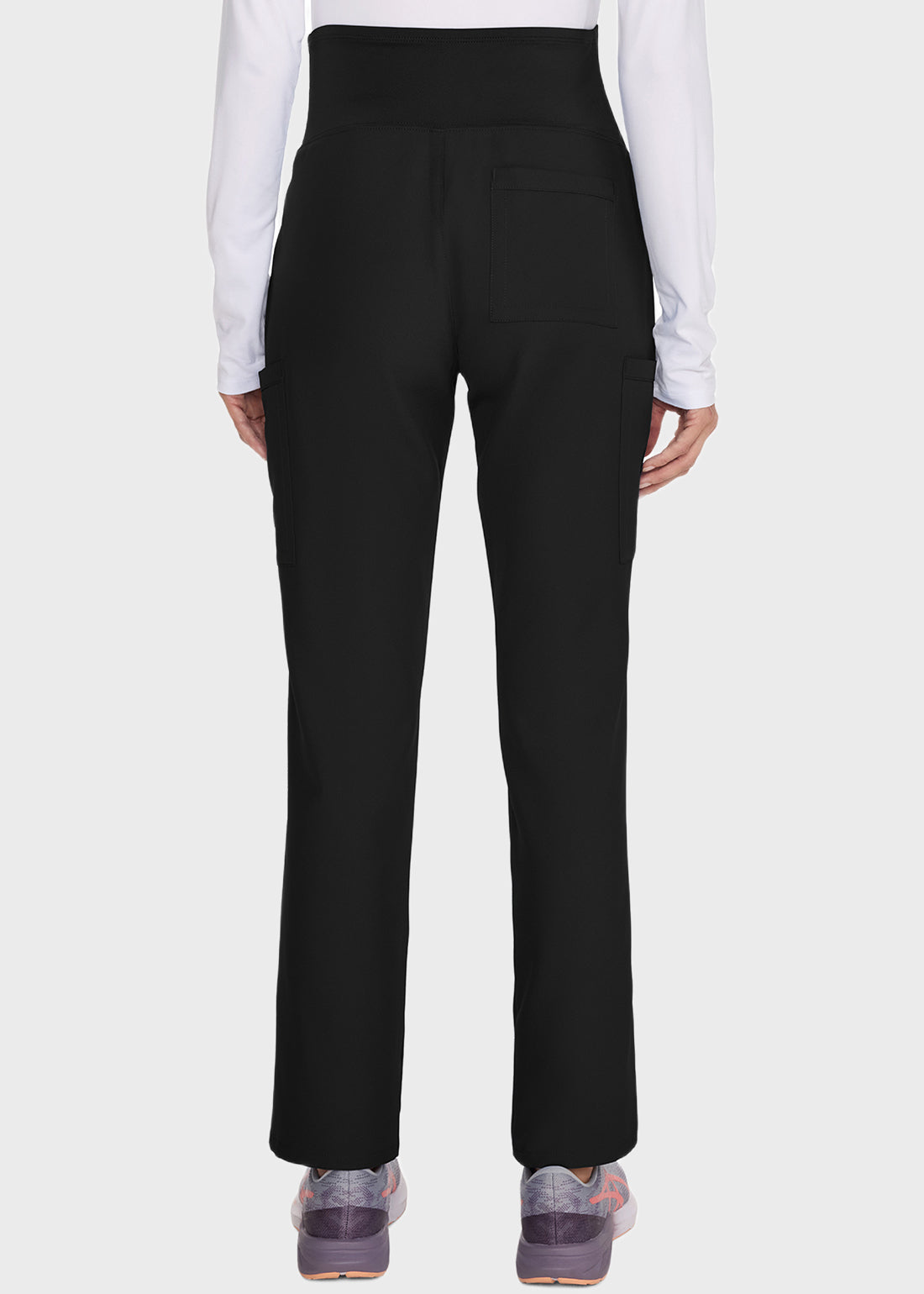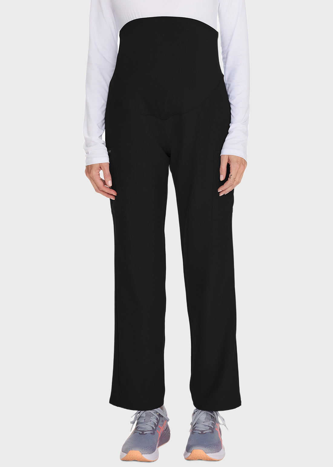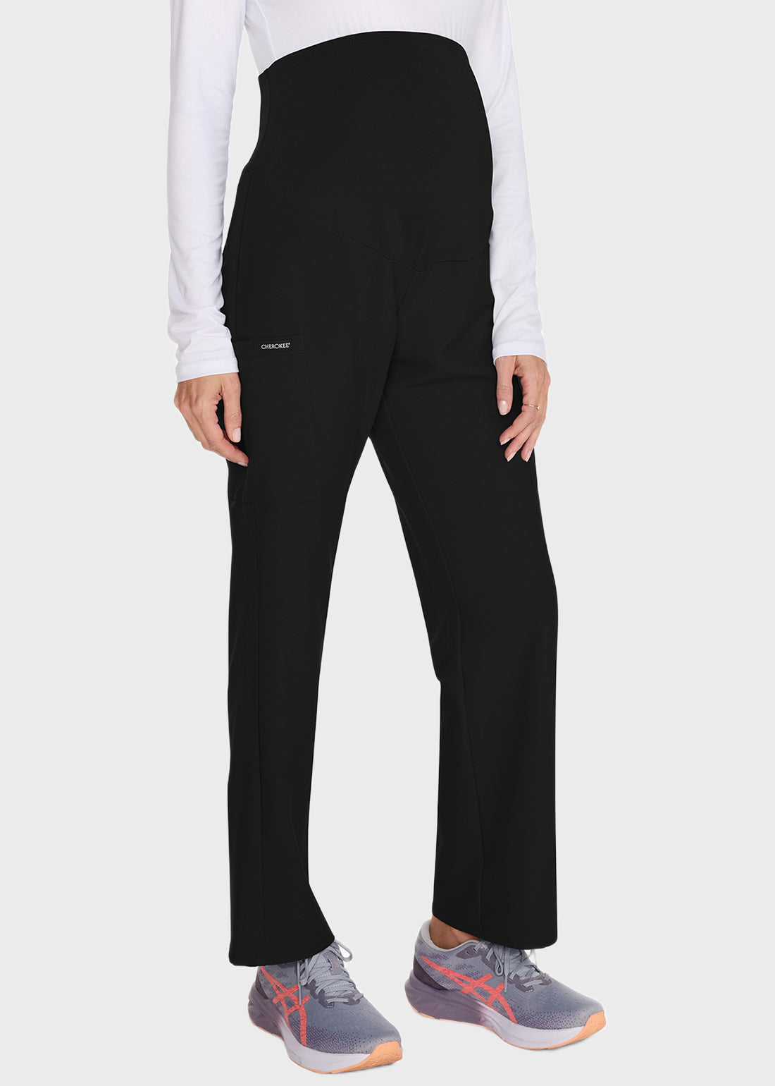 Cherokee Women's Maternity Straight Leg Petite Pant is designed for comfort and support with a super-stretch waistband that grows with you. Featuring a modern classic fit and three pockets—including back patch and dual cargo pockets—it offers both style and functionality for your workday.