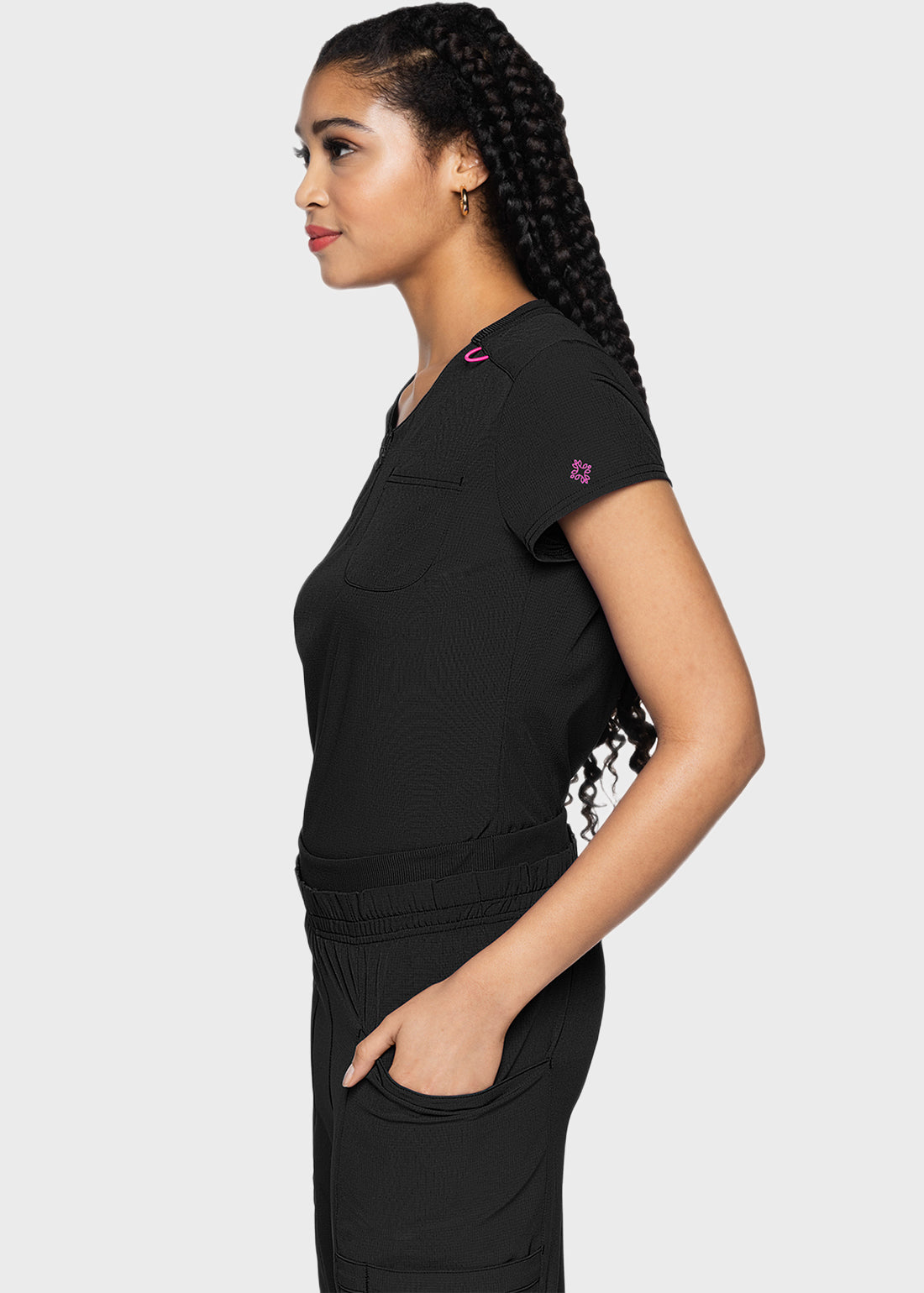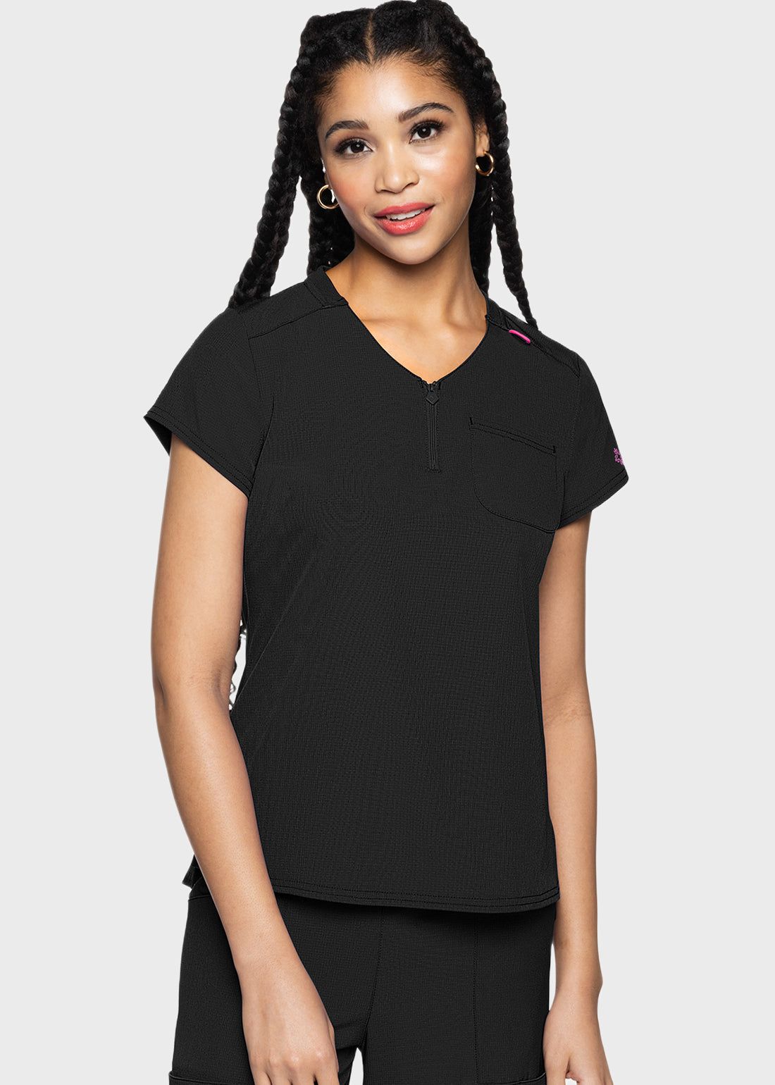Meet your new go-to top that blends simplicity with style. The MC AMP Quarter Zip V-Neck Tuckable Top features a functional quarter zipper, cap sleeves, and a rib-knit back neckband for ultimate comfort. Designed with a versatile high-low hem, you can wear it tucked or untucked with ease. Plus, a handy chest pocket, bungee ID badge loop, and locker loop make it as practical as it is stylish.