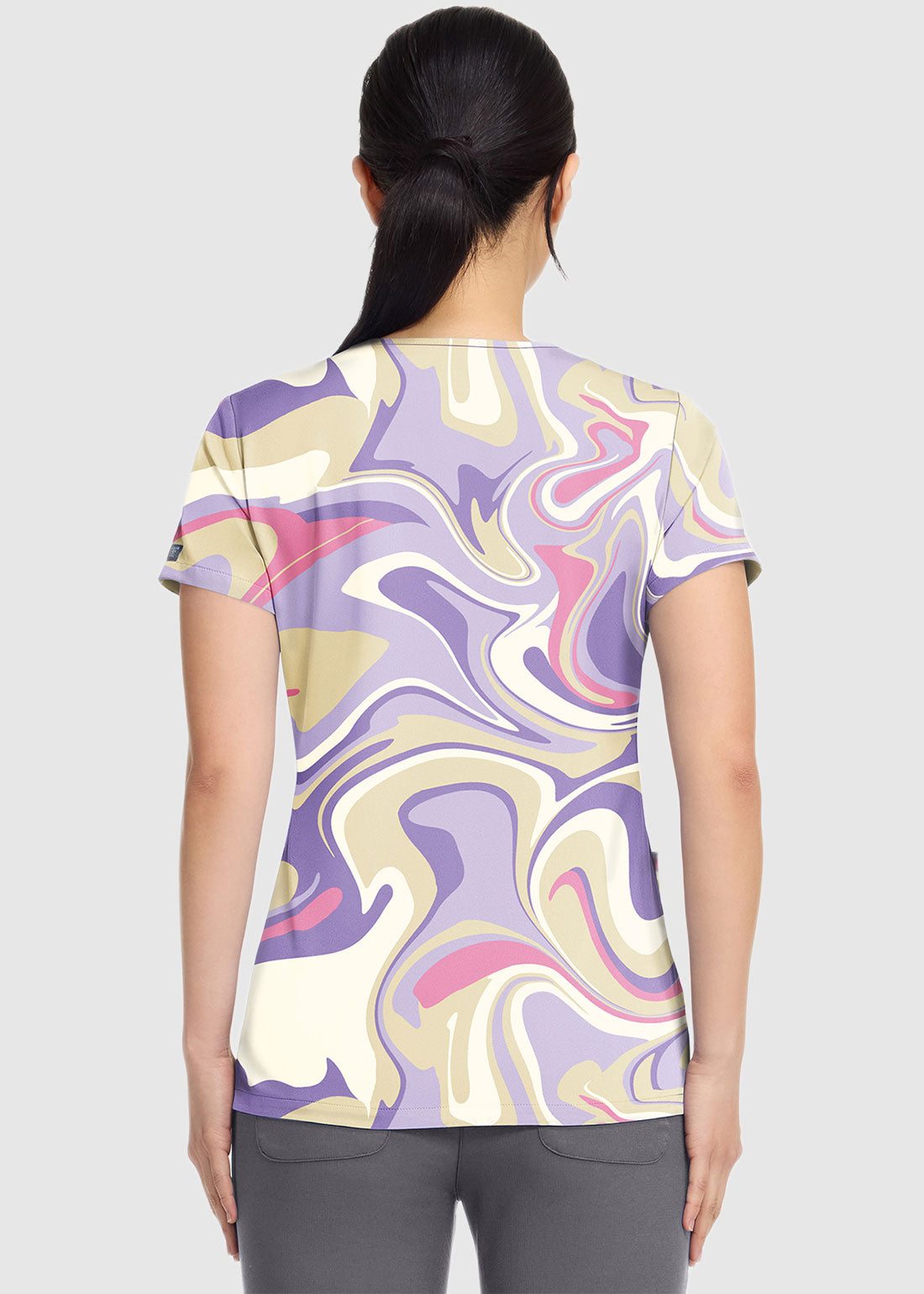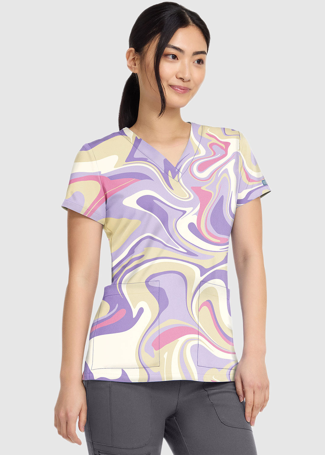 Med Couture Women's V-Neck Print Top in Sporty Marble Add a pop of personality to your workday with the Sporty Marble V-neck top. Designed with patch pockets, side vents, and soft knit details, this fun and functional scrub top keeps you comfortable and stylish all shift long.