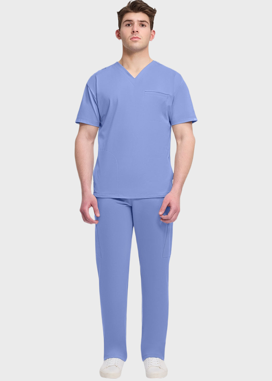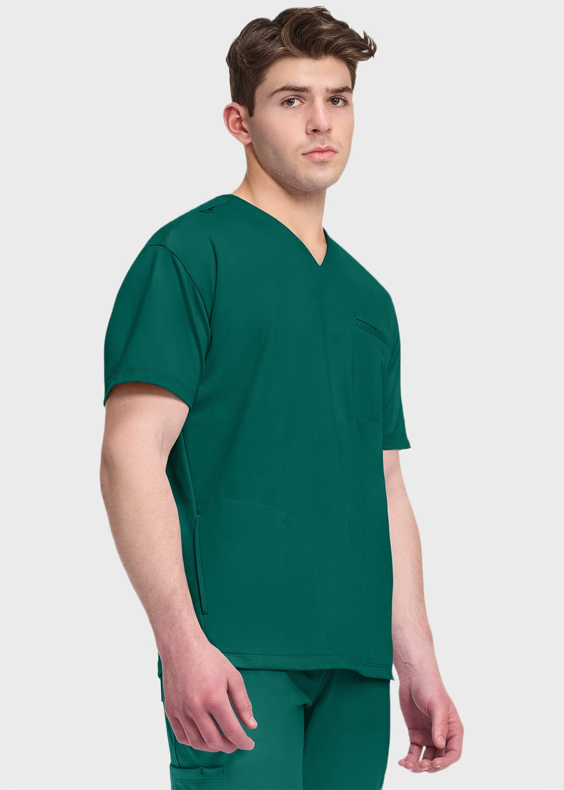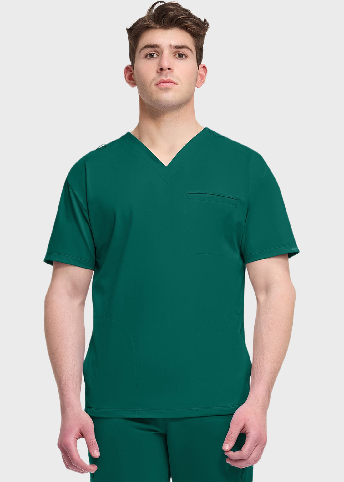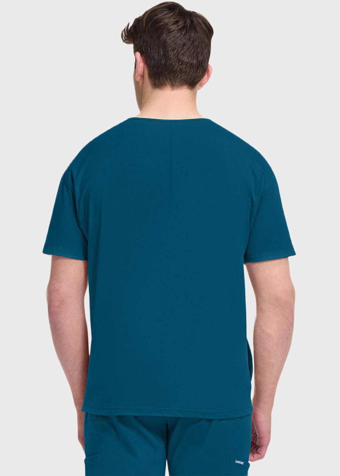 Cherokee Achieve Men's V-Neck Top This casual-look scrub top offers professional-grade stretch for all-day comfort. Featuring a sleek V-neck design with three practical pockets—including side seam and welt chest pockets—it combines style and functionality for your busiest shifts.