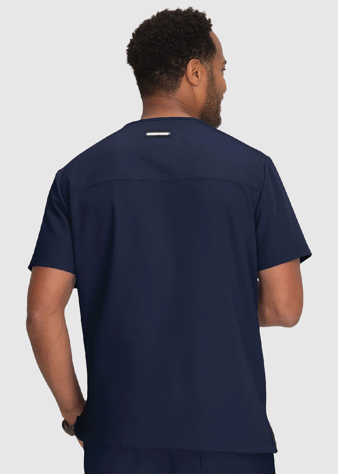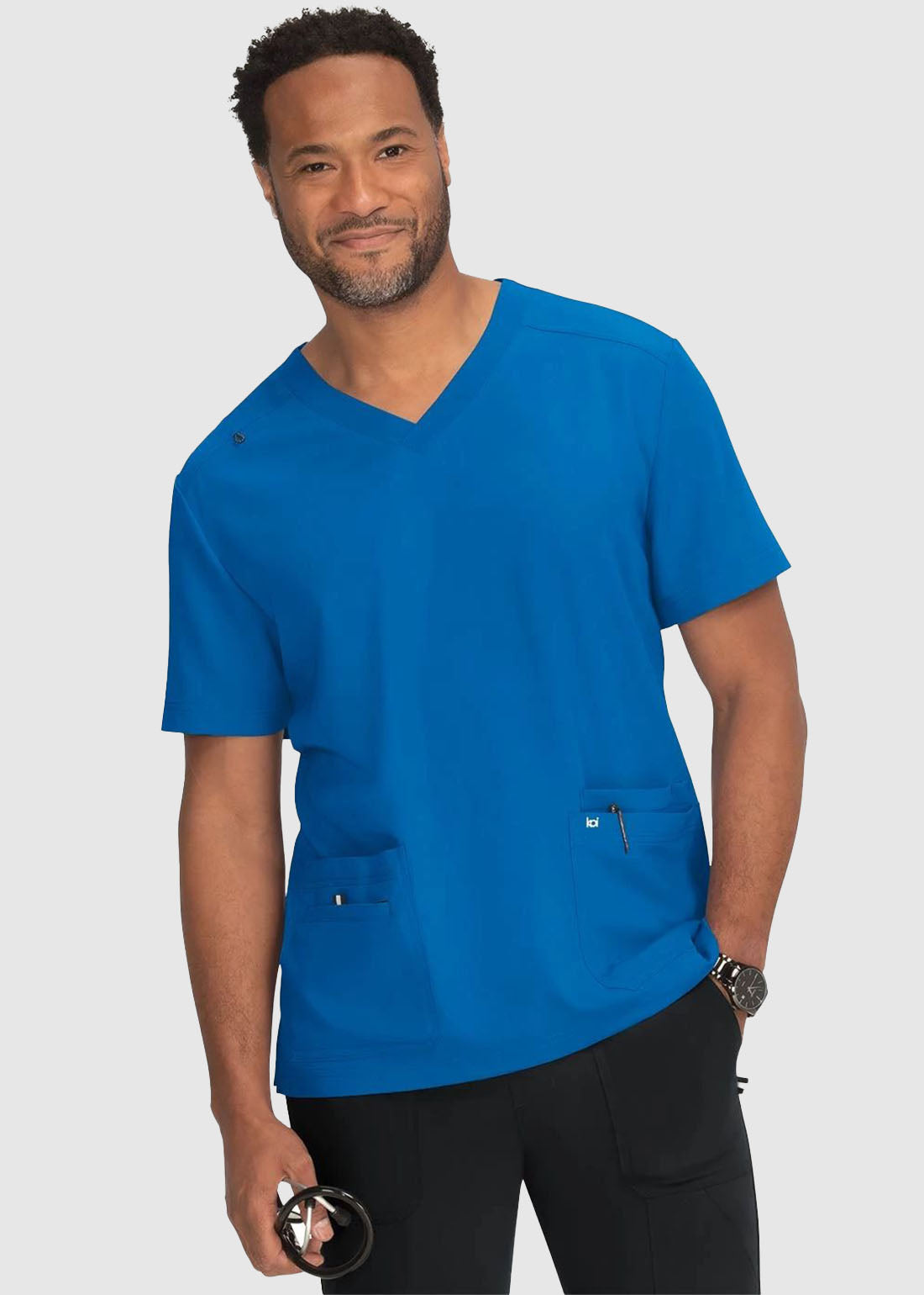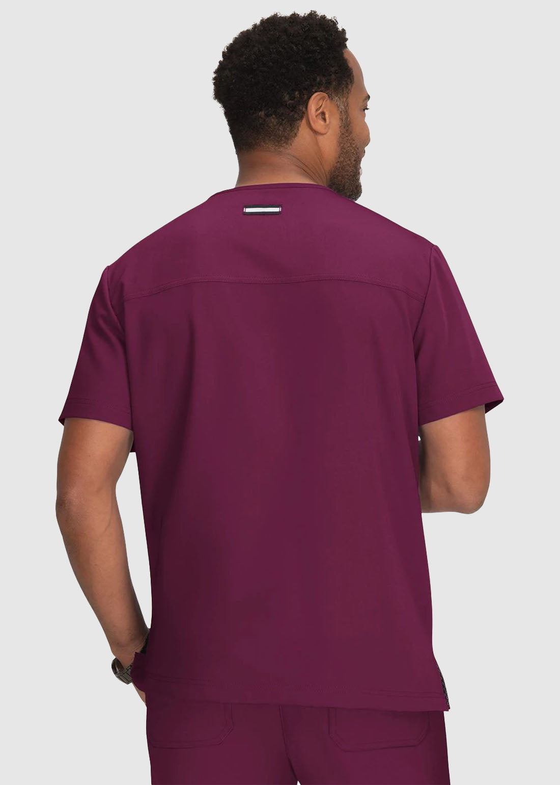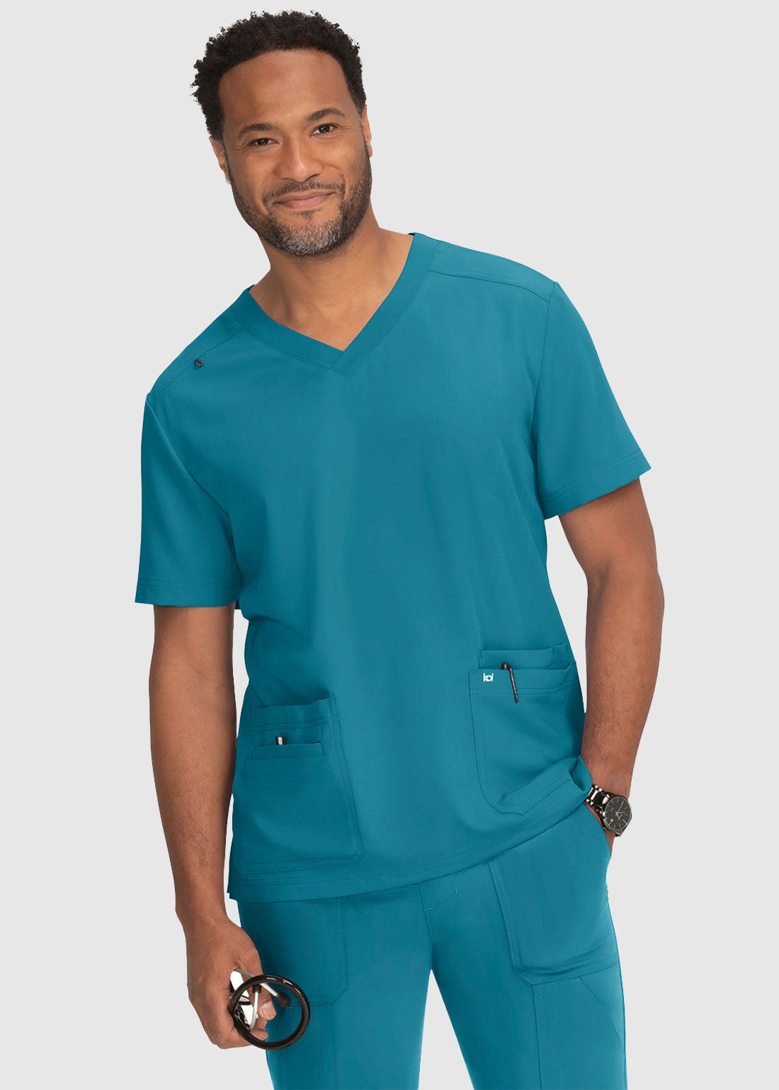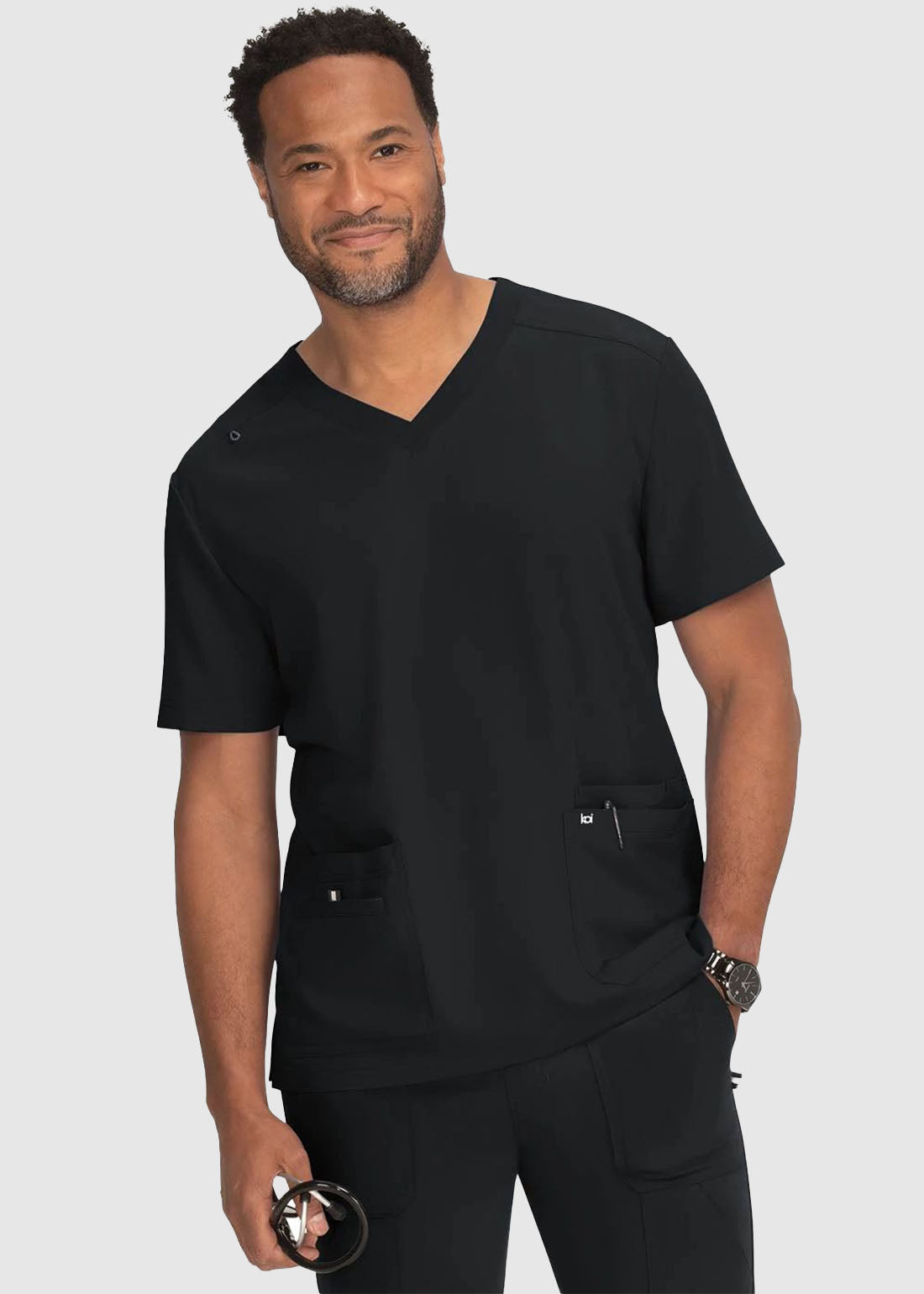 koi Next Gen Free to Be Men's 4-Pocket Scrub Top offers a classic v-neck design with 4-way stretch for all-day comfort. Featuring a bungee loop for your ID badge, four front pockets, and side slits for easy movement, it’s both functional and stylish.