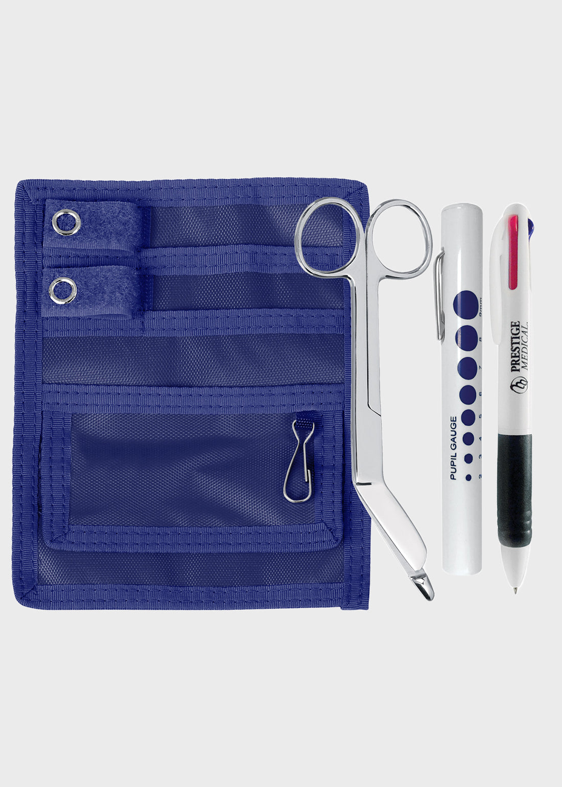 Organize your stuff with this Belt Loop Organizer Kit by Prestige. It features four front pockets, including a velcro-closure coin pocket, key chain clip and matching color Velcro tabs to secure instruments. Belt loop on the back fits most belts. It also has a 5.5 inches lister bandage scissor, disposable penlight and 3-color chart pen.