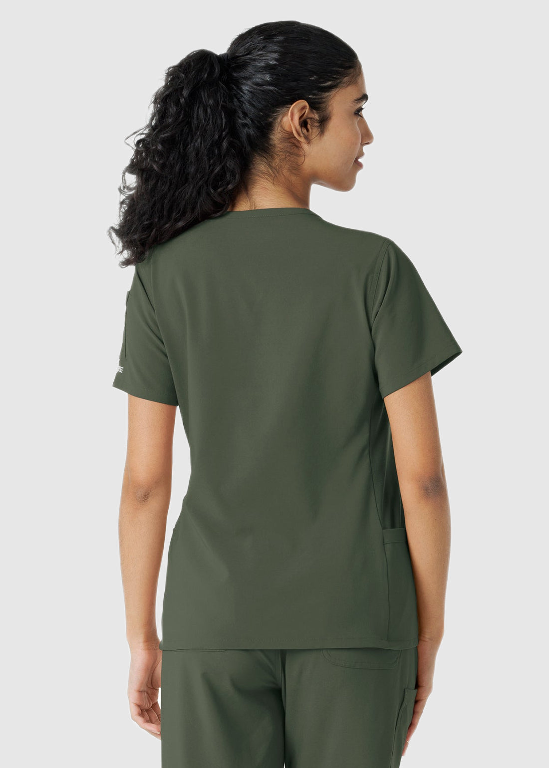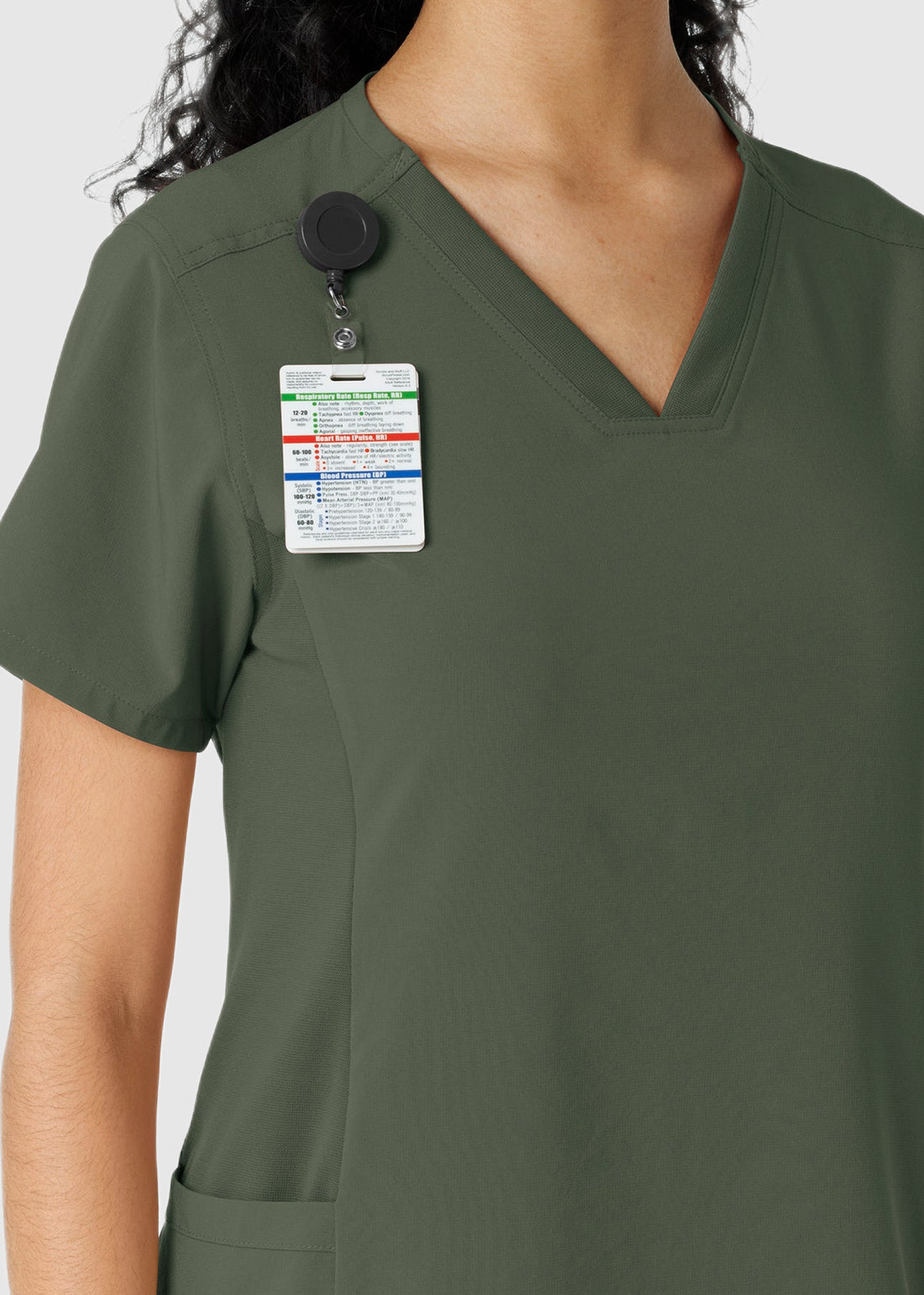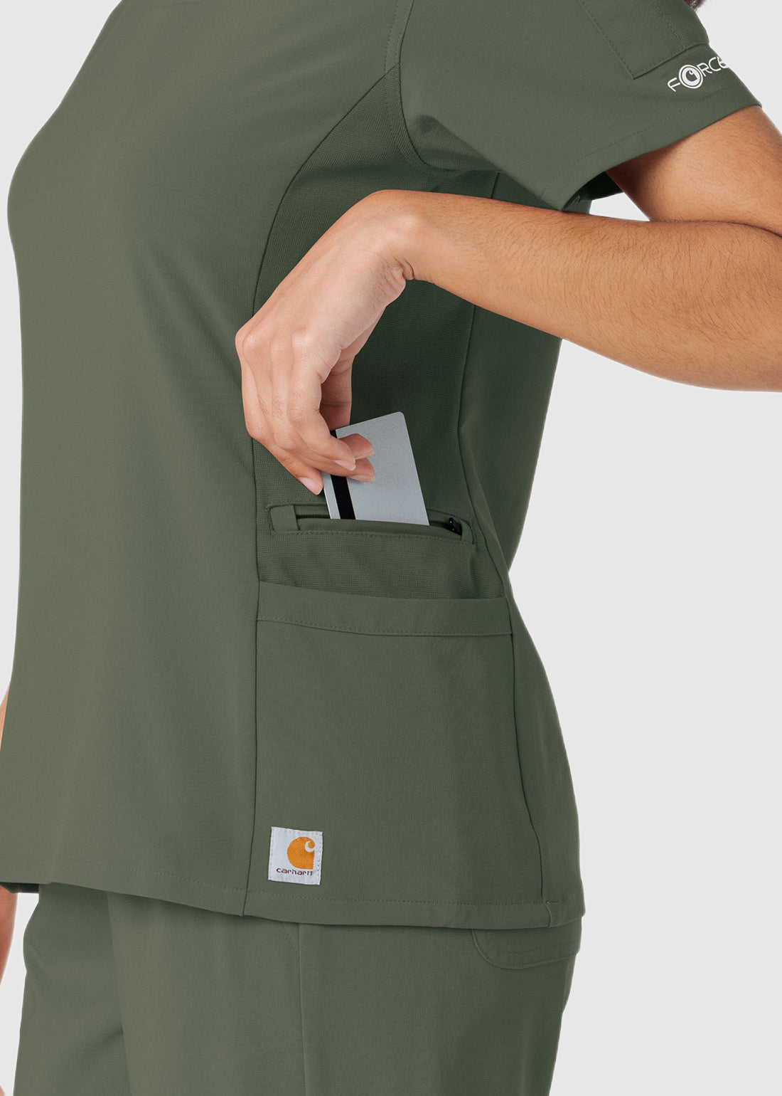 Carhartt Force Cross-Flex Women's Knit Panel Scrub Top offers a modern fit with a comfortable and functional design. Featuring a V-neck, two top-loading side pockets, a zip pocket on the left hip, and a shoulder badge loop, it provides ample storage. Knit side panels ensure flexibility and all-day comfort.