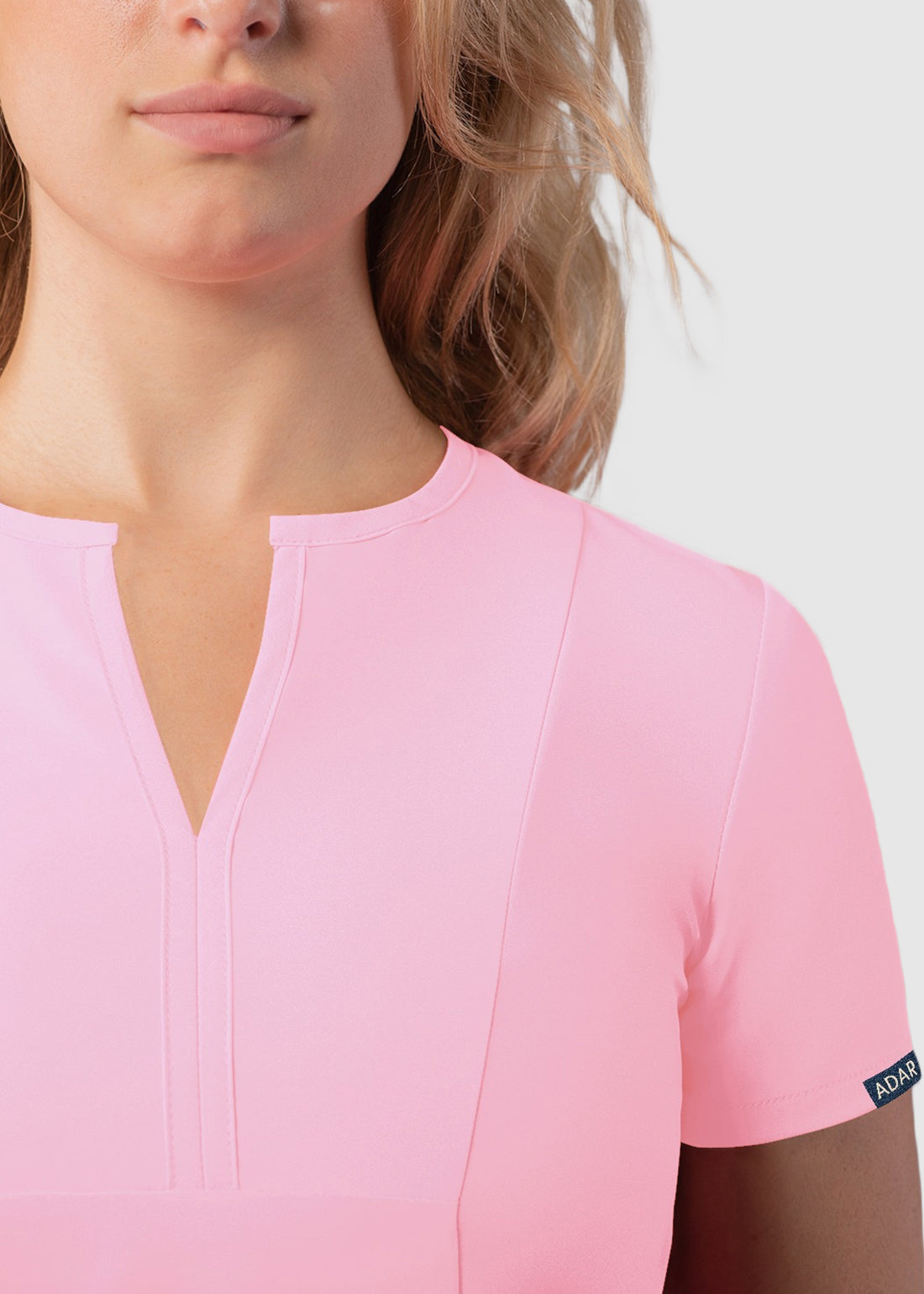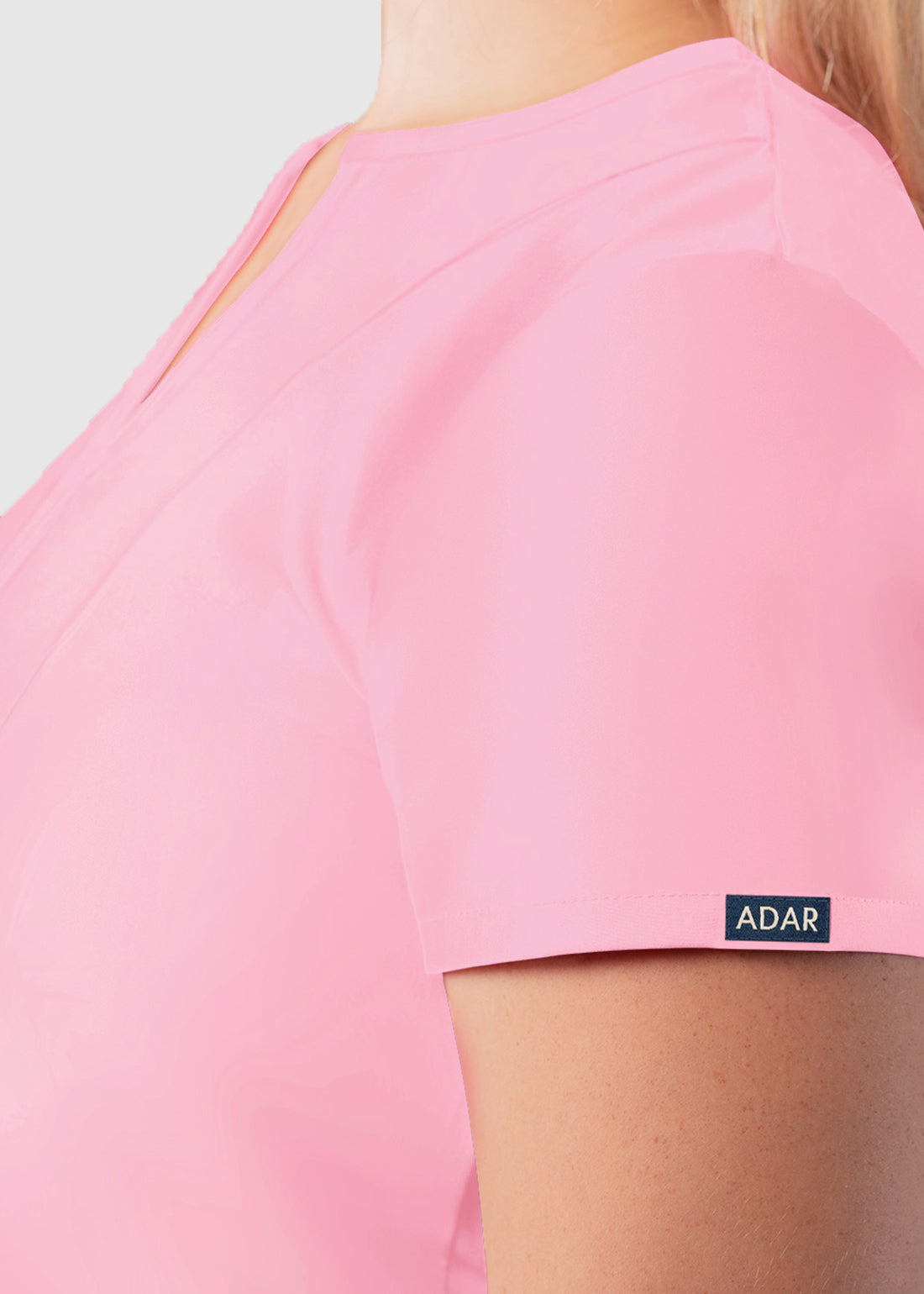 Dress immaculately in ADAR A9600 Addition Women's Go-Higher Scrub Set. The fashion-forward notched V-neck scrub top comes with a flattering princess seam, self-binding trim and notched neckline detail, back yoke and dart detail making it modern and figure-flattering, two large angled pockets with self-binding trim and a high/low hem for backside coverage, makes this top ideal for your everyday needs. With multi-stretch fabric and completed with side vents, the scrub top garners functionality. Paired contemporary fit, skinny leg, mid-rise cargo pant with natural waist, and featuring a total of eight pockets for maximum secured storage, the pants are a must have.