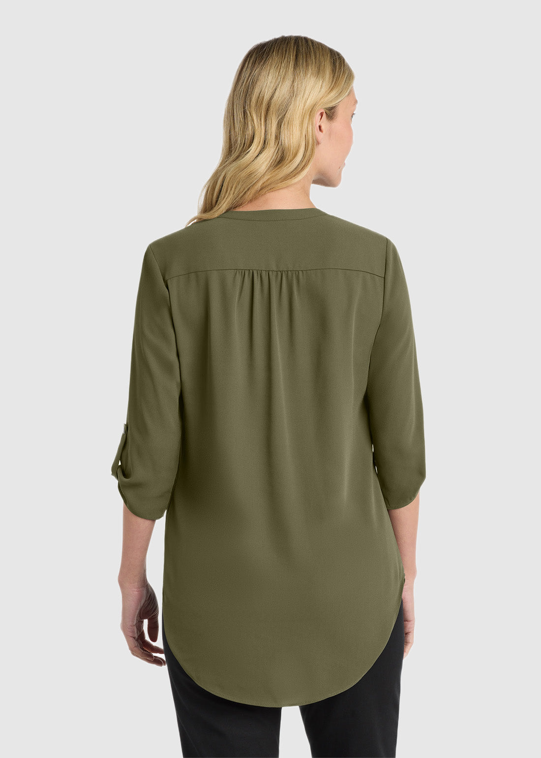 Chic and sleek, the Port Authority Ladies Three Quarter-Sleeve Tunic Blouse is all that you need. With a split v-neck, metal buttons, roll sleeves with button tabs, longer tunic length and gathered back detail, the blouse is a stylish addition to your wardrobe.