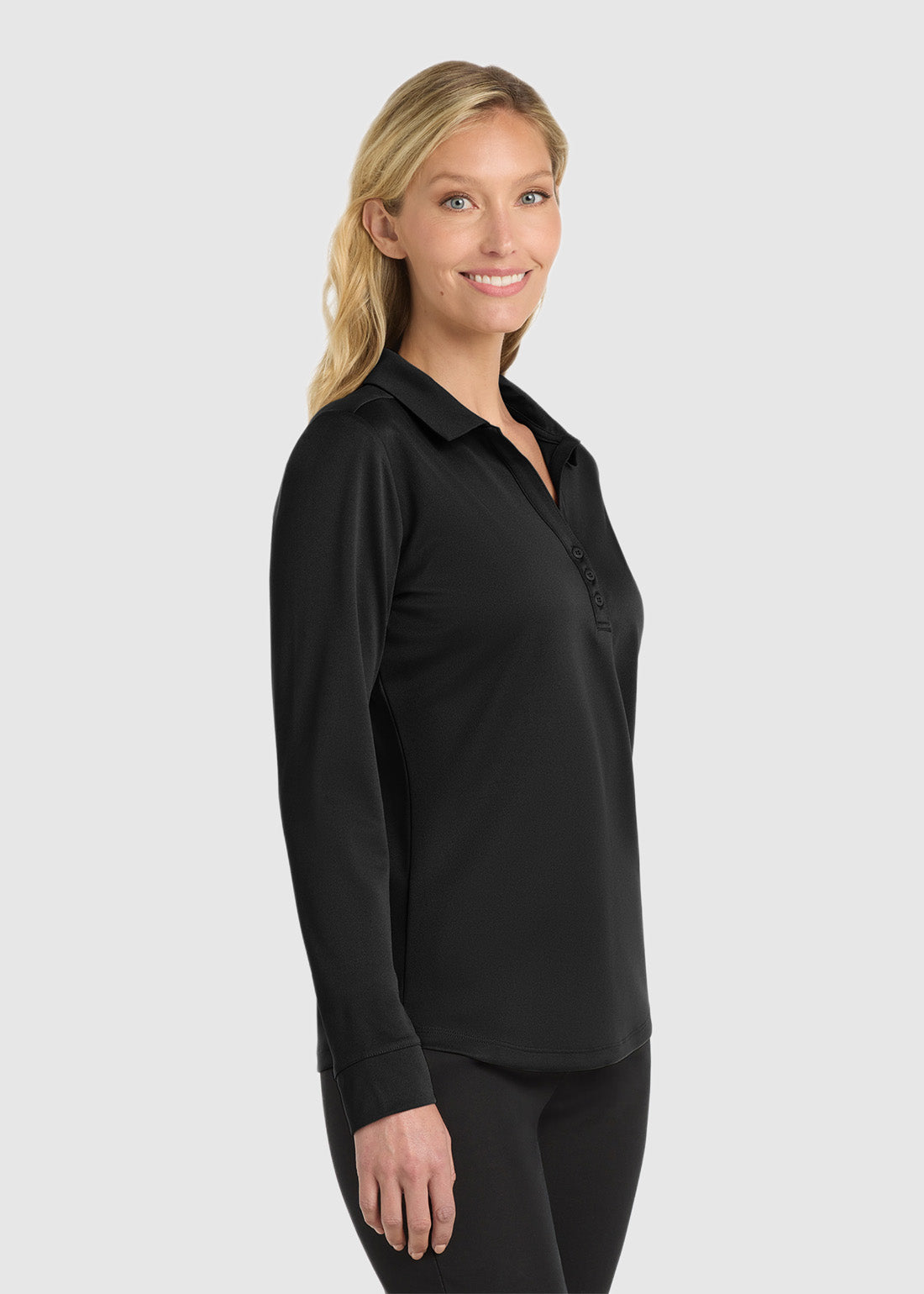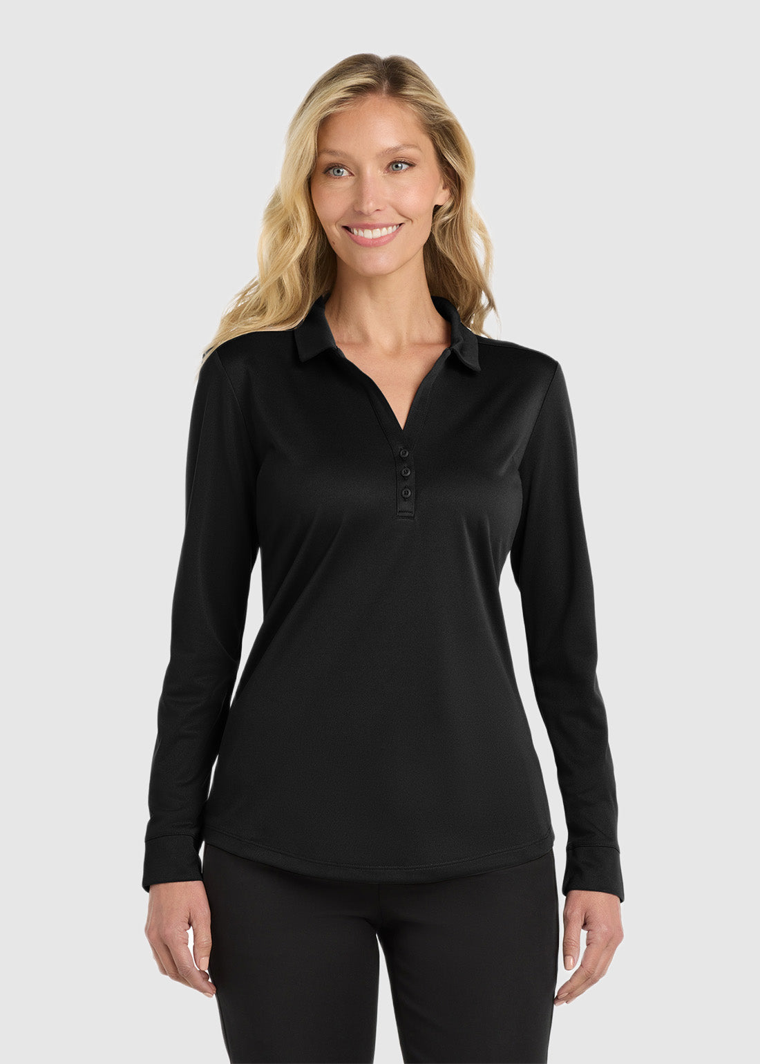 Dress immaculately to work in Port Authority Ladies Silk Touch Performance Long Sleeve Polo. With a self-fabric collar, tag-free label and 3-button y-neck placket and dyed-to-match buttons, you get absolute performance. With self-fabric cuffs and curved hem, the polo is a must have.